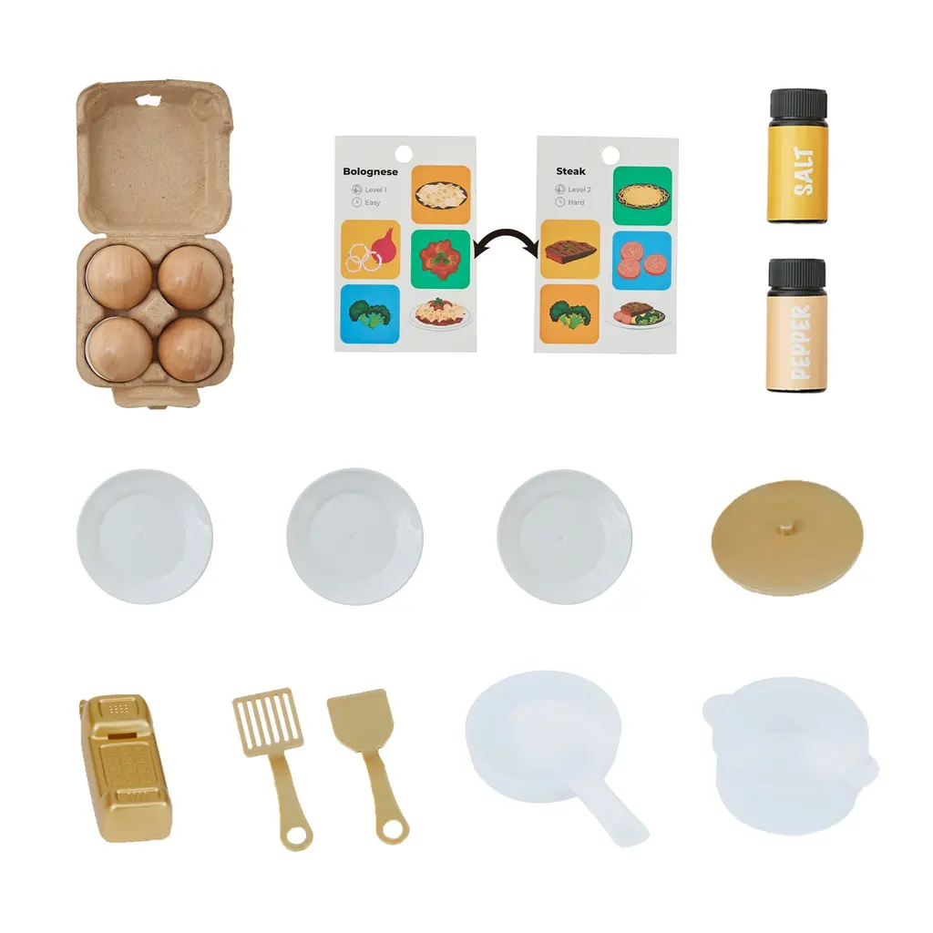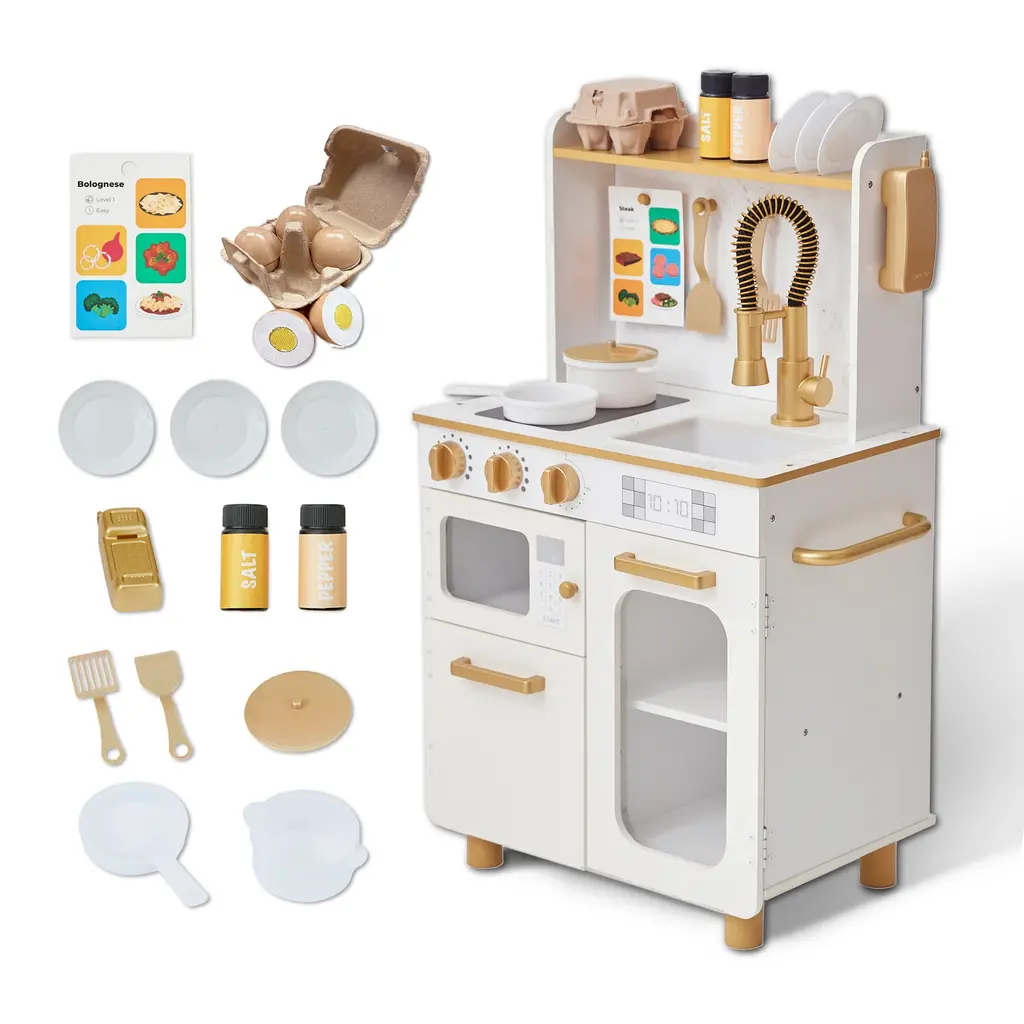 The Teamson Kids Little Chef Memphis is a modern, space-saving play kitchen designed to deliver big fun in compact spaces. This stylish kids kitchen playset combines interactive features, durable design, and developmental value—perfect for toddlers ages 1–6. With clicking oven knobs, a pull-down sprayer faucet, pretend phone, and cuttable eggs, this wood toy kitchen brings pretend routines to life. A double-sided recipe card encourages kids to follow steps and create their own meals, building confidence, focus, and independence. Finished in soft gray with faux marble backsplash and gold accents, this wooden kitchen for toddlers looks just as good in a living room as it does in a playroom. It’s thoughtfully designed for small homes and shared bedrooms with three plate slots, cabinet shelving, hooks, and side storage that keep everything organized and accessible. This toddler kitchen set includes 6 accessories—plates, utensils, seasoning bottles, and toy food—for full roleplay from the very first unboxing. It’s a complete kitchen set for toddlers 3–5 and older siblings too, designed to support long-term play without taking over your space. Built from sturdy wood, Memphis meets safety standards and lasts through years of pretend cooking, cleaning, and learning.
