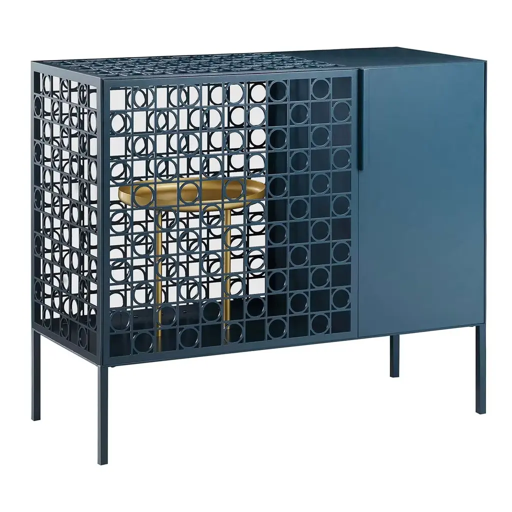 A refined and elegant piece of functional decor, this golden-hued cabinet is a dynamic showcase of deft craftsmanship. Fashioned of steel, it is composed of two parts: one boasting a striking laser-cut work that reveals the elegant tray placed inside, and on the right side, an open section with two shelves. Other finishes are available on request, ask the Concierge for details.