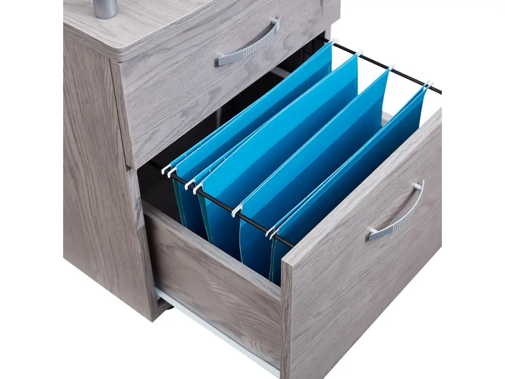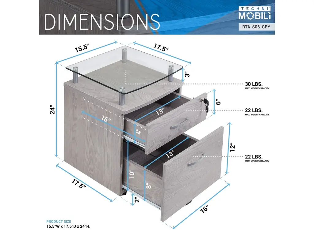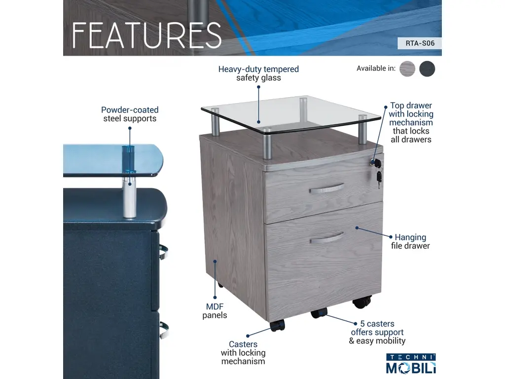 The Techni Mobili Rolling File Cabinet is stylish and keeps your accessories and documents organized. It features a top drawer with a locking mechanism that locks both the top drawer and lower file cabinet.
