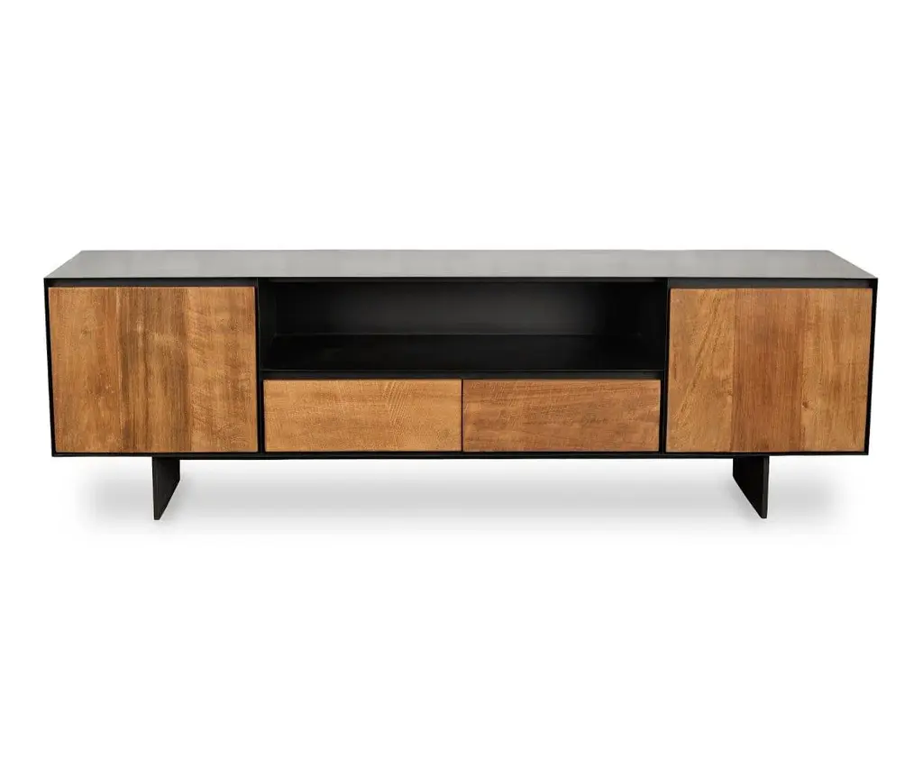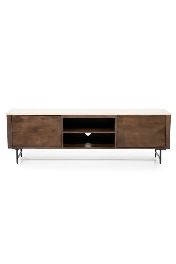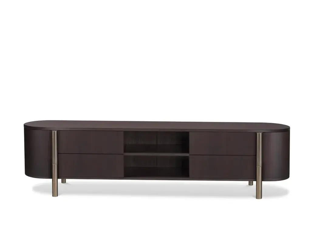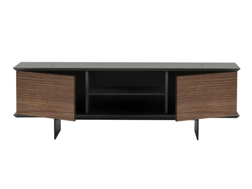 The defined and multimaterial lines of the Teo tv-stand invite you to find new spaces thanks to the central shelf and the two side doors with Canaletto walnut or black ash finish, that match the anthracite or matt stone bronze metal structure.