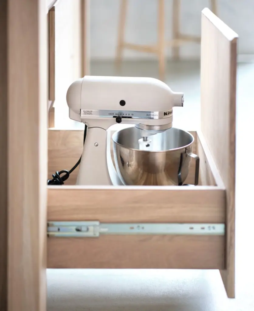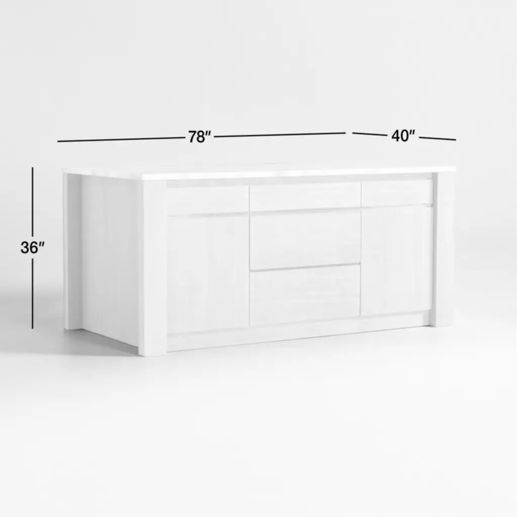 Our Terra kitchen island celebrates the beauty of natural oak while providing a casual spot to gather or an extra surface to prep meals. Topped with a slab of Agaria marble with grey and white veining, the clean-lined base showcases the natural oak wood's unique graining with a light ivory ceruse finish. On the storage side of the island, five drawers and two cabinetswith flat fronts to further highlight the woodprovide a kitchen's-worth of storage. The left-hand cabinet houses a pullout compartment to store two trash cans, while the one on the right has a pullout shelf and one adjustable shelf in the roomy interior. The island's other side provides generous open space to accommodate three to four counter stools (sold separately). Our exclusive Terra island complements modern farmhouse or contemporary kitchens, expanding possibilities for storage as well as entertaining.By choosing FSC®-certified furniture, you are supporting responsible management of the world's forests.