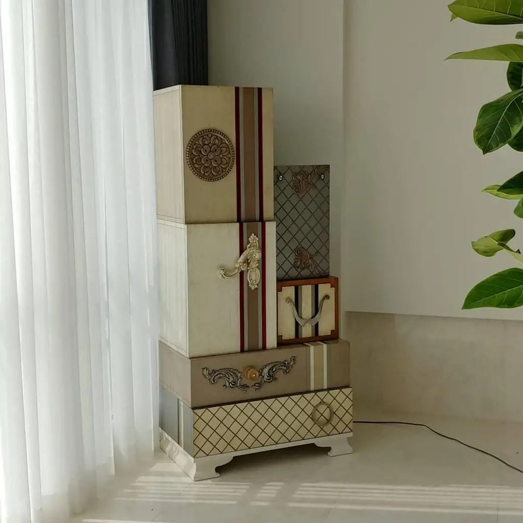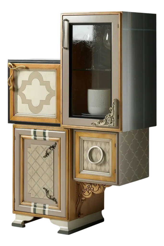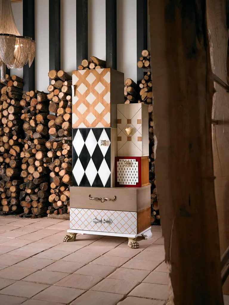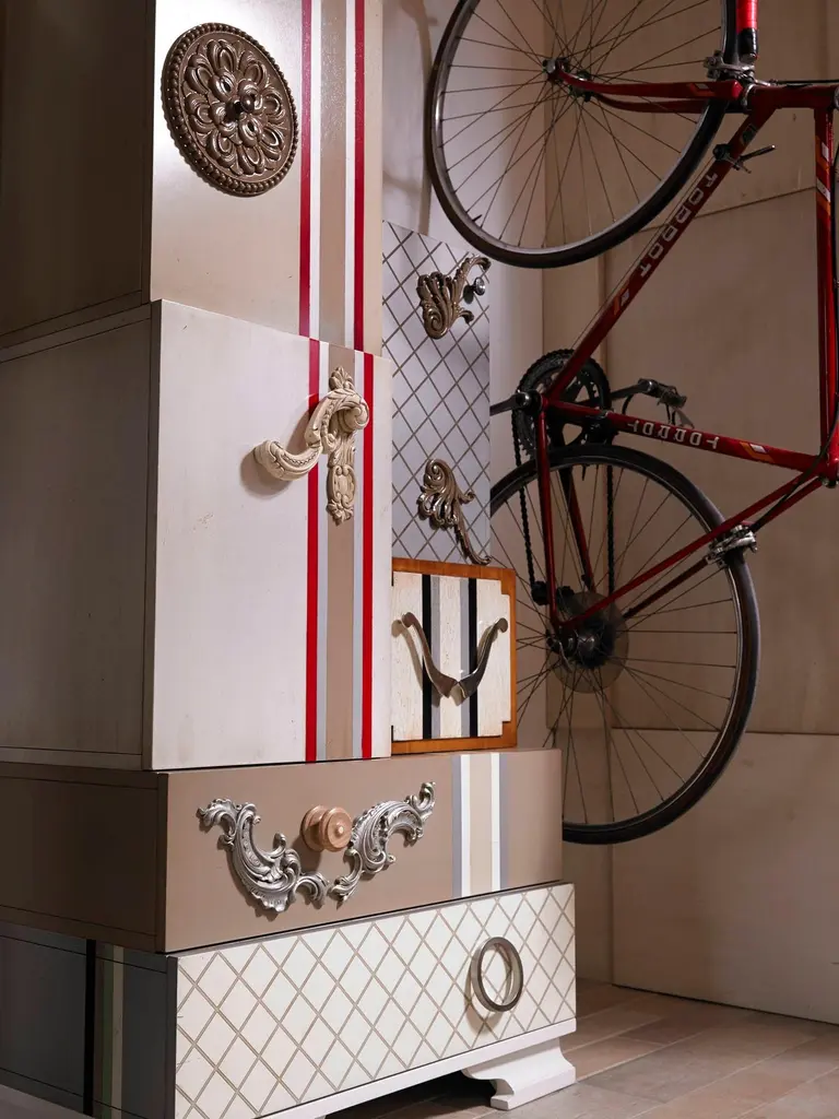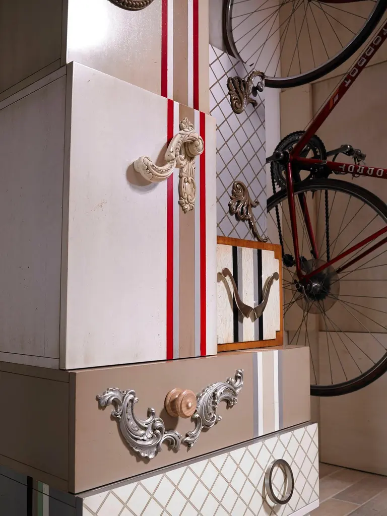 Tetris Entry Cabinet by Lola GlamourDimensions: D 45 x W 75 x H 160 cmMaterials: Wood.Composing a piece of furniture based on modules is a challenge and a game. When the possibilities are all and there is no limit in measures or colors, it is only up to the professional to come up with a piece with a soul. In this case, we have chosen three drawers and three doors with different volumes that have been imposed in height to achieve a large wardrobe for small spaces. We have chosen soft colors with a spicy touch of red, wood carvings, and assorted handles. A piece of furniture full of details for each of its corners, with the stripe as the protagonist.We are Félix and Désirée Ramos, brothers and product designers of our brand, Lola Glamour.We are interested in the singular, the different, the beauty, and the balance of color and materials. We have the ability to observe and the ability to translate any beautiful object into a piece of furniture.We are proud of having created our own style, a way of understanding design, which allows us to tell stories and connect with the souls of people and spaces.Lola Glamor is a Spanish company from Soria, which has designed and manufactured unique furniture in noble woods, with artisanal construction and extraordinary finishes since 1995. Artistic furniture that is customized in size and finish according to the client's needs.We offer original furnishing solutions for professionals and individuals from any country in the world, mixing materials, volumes, motifs, and colors that achieve their own style.We are, above all, the sum of a team of people who contribute their dedication and commitment to a unique level of demand, detail, and quality.