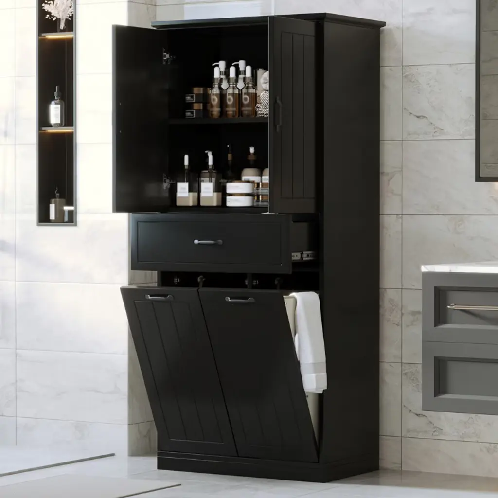 Bullet Point 1. High-quality MDF Board & Painted Finish 2. Cabinet with Doors & One Drawer & Laundry Basket 3. Applicable for Bathroom or Laundry Room Details 1. Cloth Bags 2. Adjustable Shelf 3. Metal Black Handles 4. Soft Close Hinges 5. Anti-tipping Device More Information Material MDF board, painted finish Shape Rectangle Capacity 33lbs/shelf; 33lbs/drawer; Adjustable Shelf Yes Number of Drawers 1 Number of Doors 2 Assembly Required Yes Certificate TSCA/EPA
