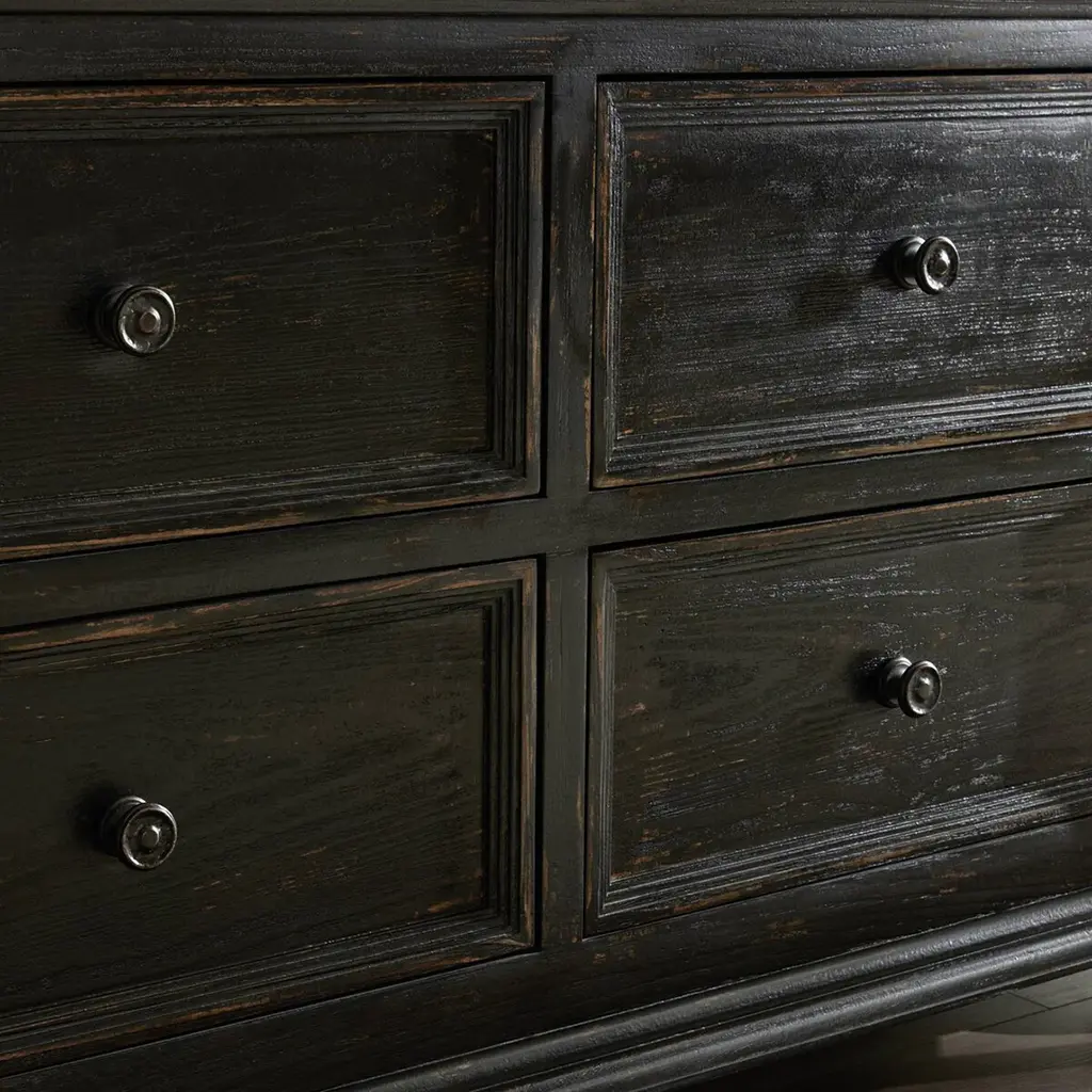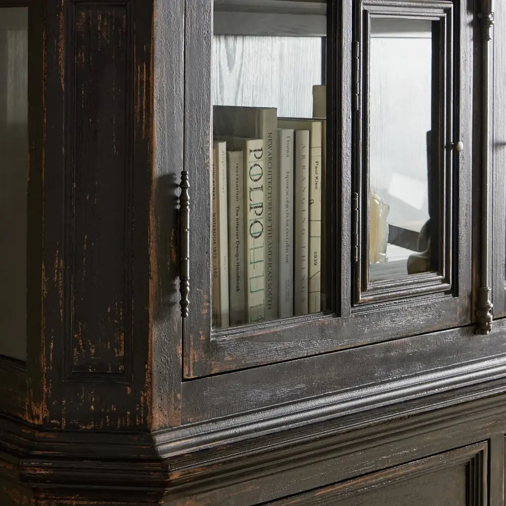 By the makers at Van Thiel, known for their antique-inspired pieces and hand-applied finishes. Influenced by a French antique, this tall two-tone cabinet was crafted with classic details including corniced edges, chamfered corners and bun feet. French casement doors feature six mini hidden doors. Finished with glass panels on the side and subtle distressing throughout. Ships In 10-14 Business Days Distressed finish This image is for illustrative purposes only. The colors shown are accurate within the constraints of lighting, photography, and the color accuracy of your screen.