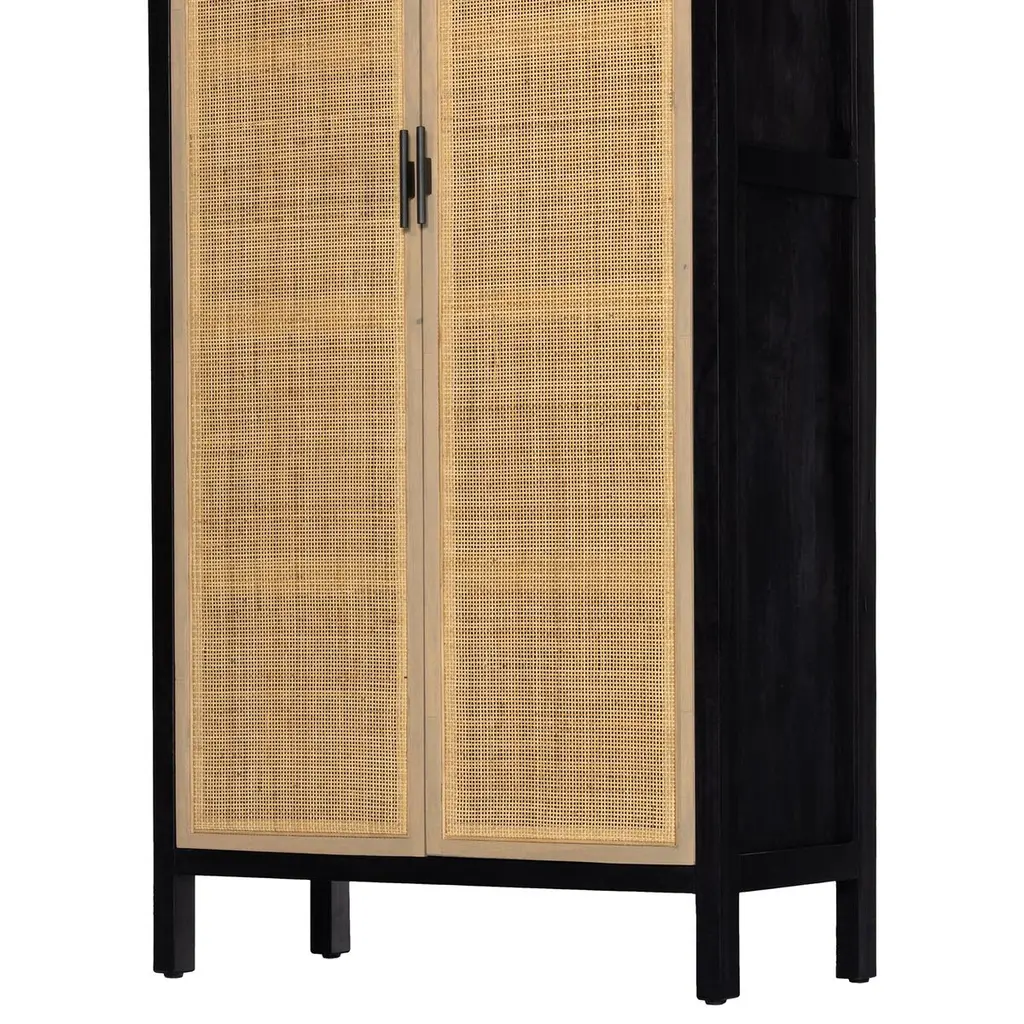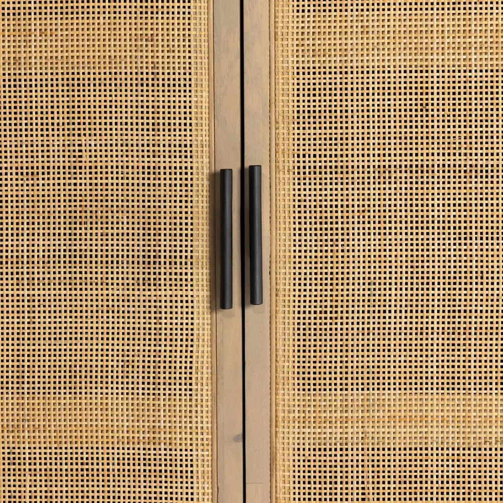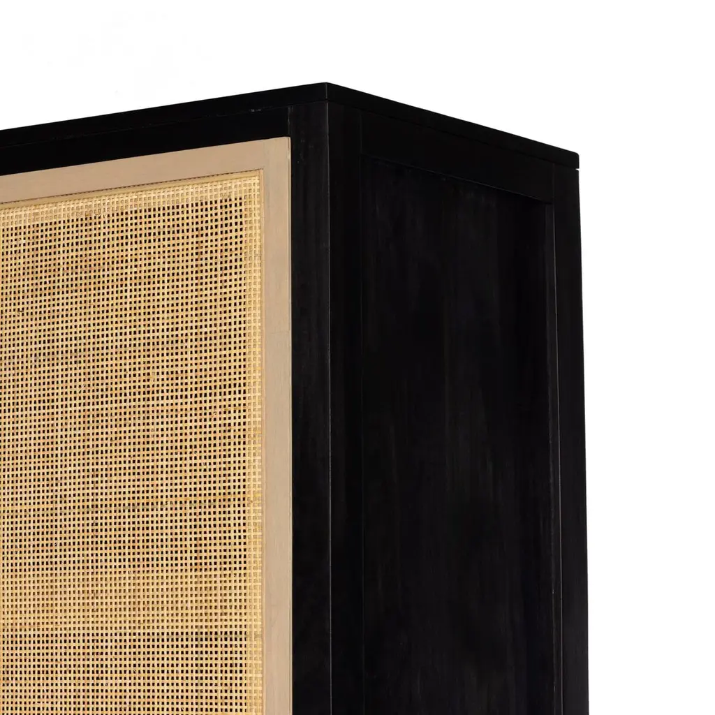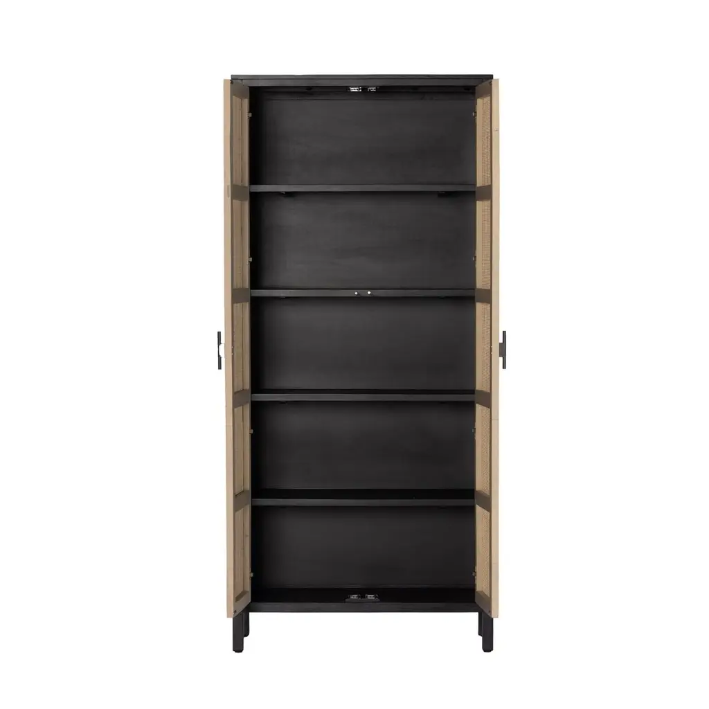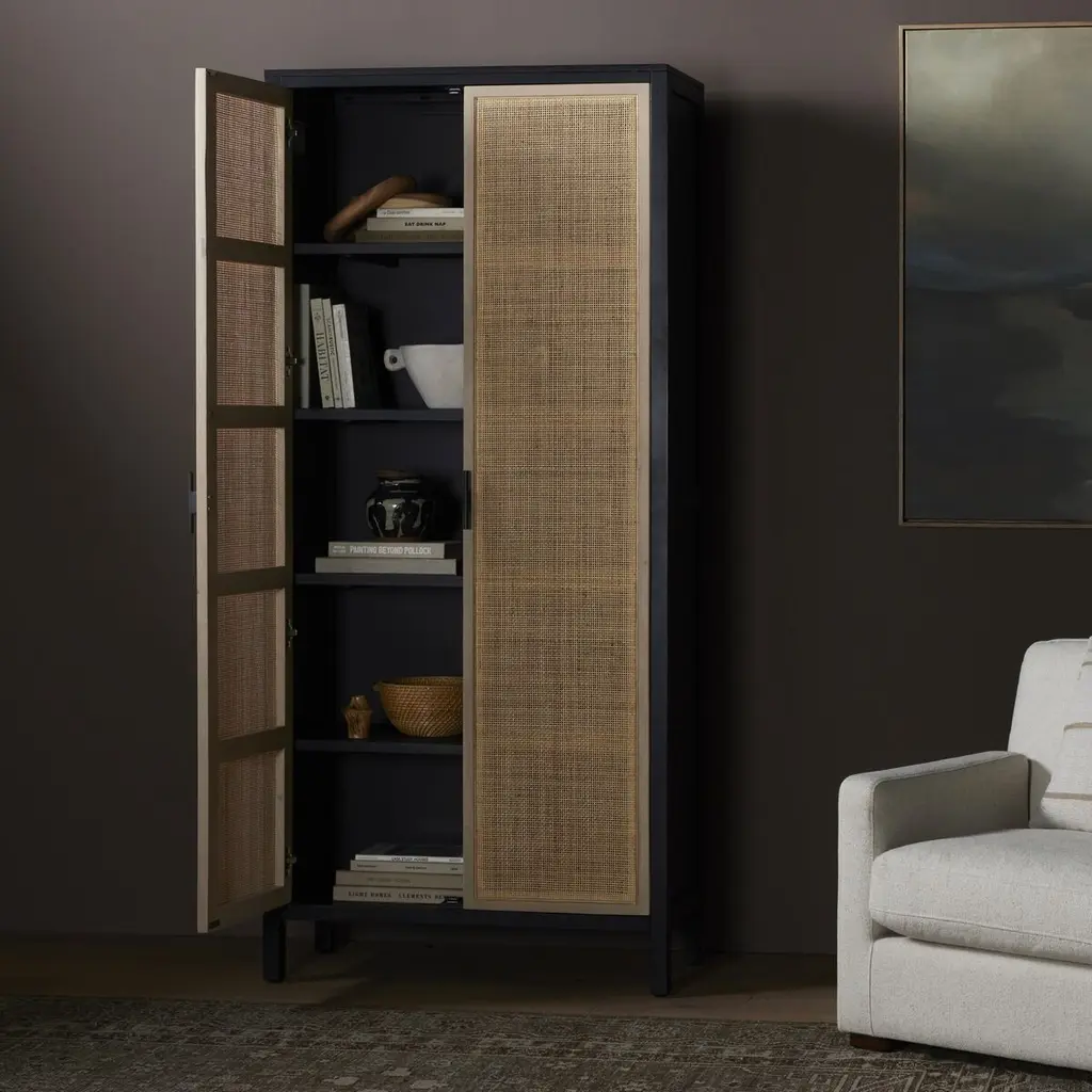 Talk about texture. This tall cabinet features spacious open shelving, with woven door fronts of natural cane for eye-catching contrast and a fashion-forward feel.