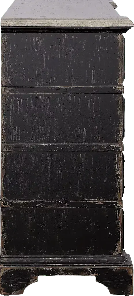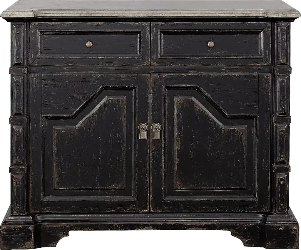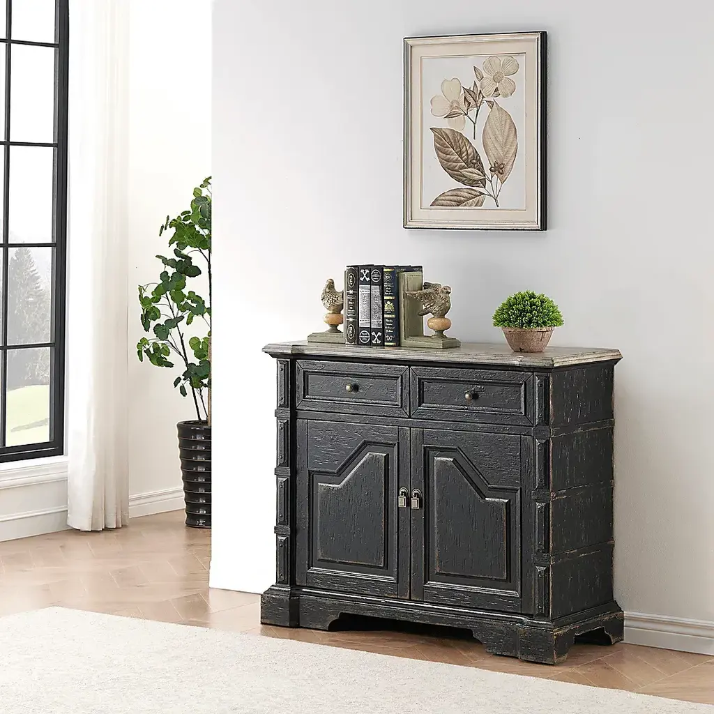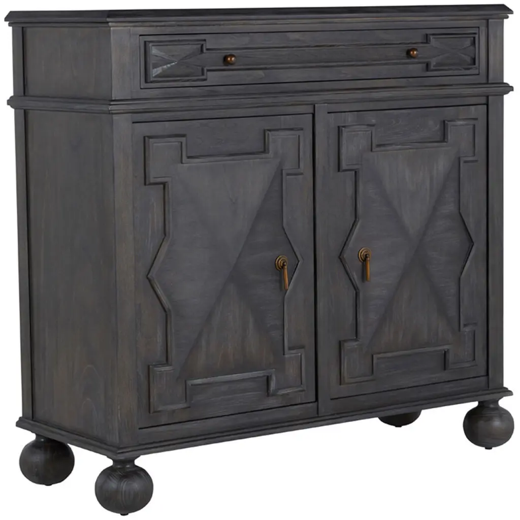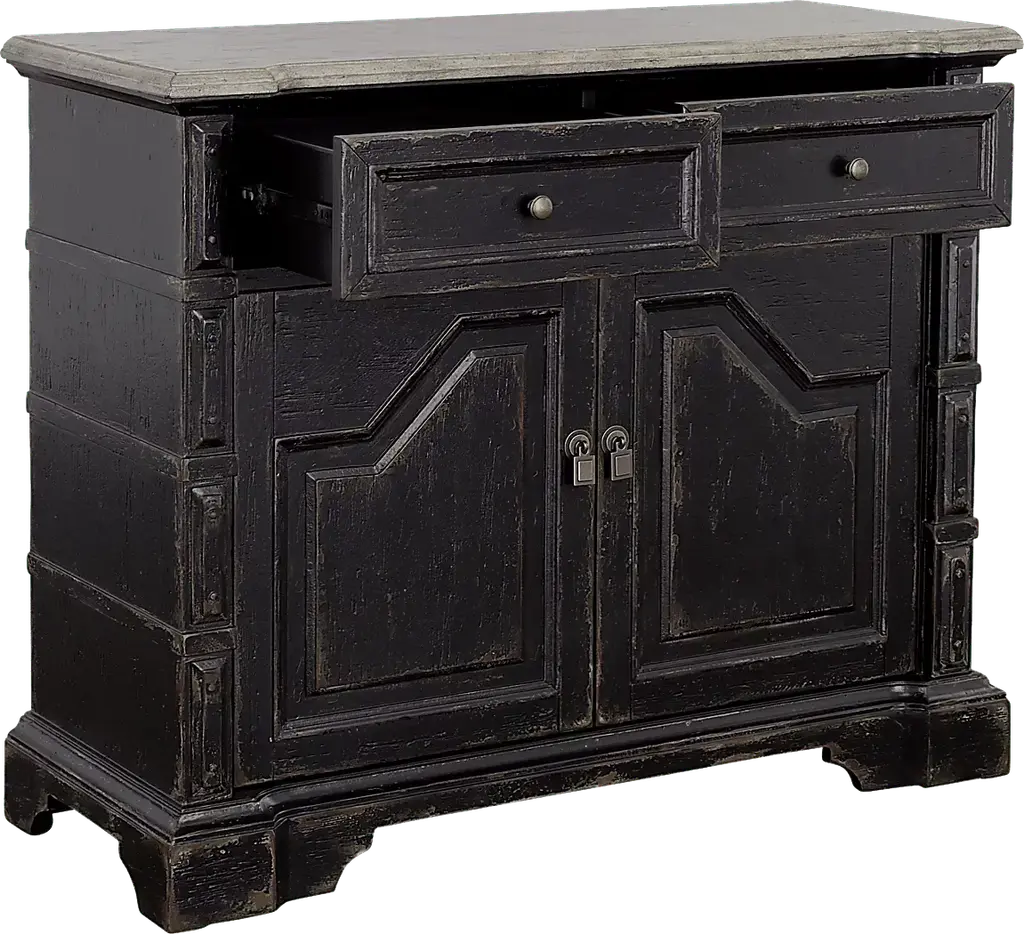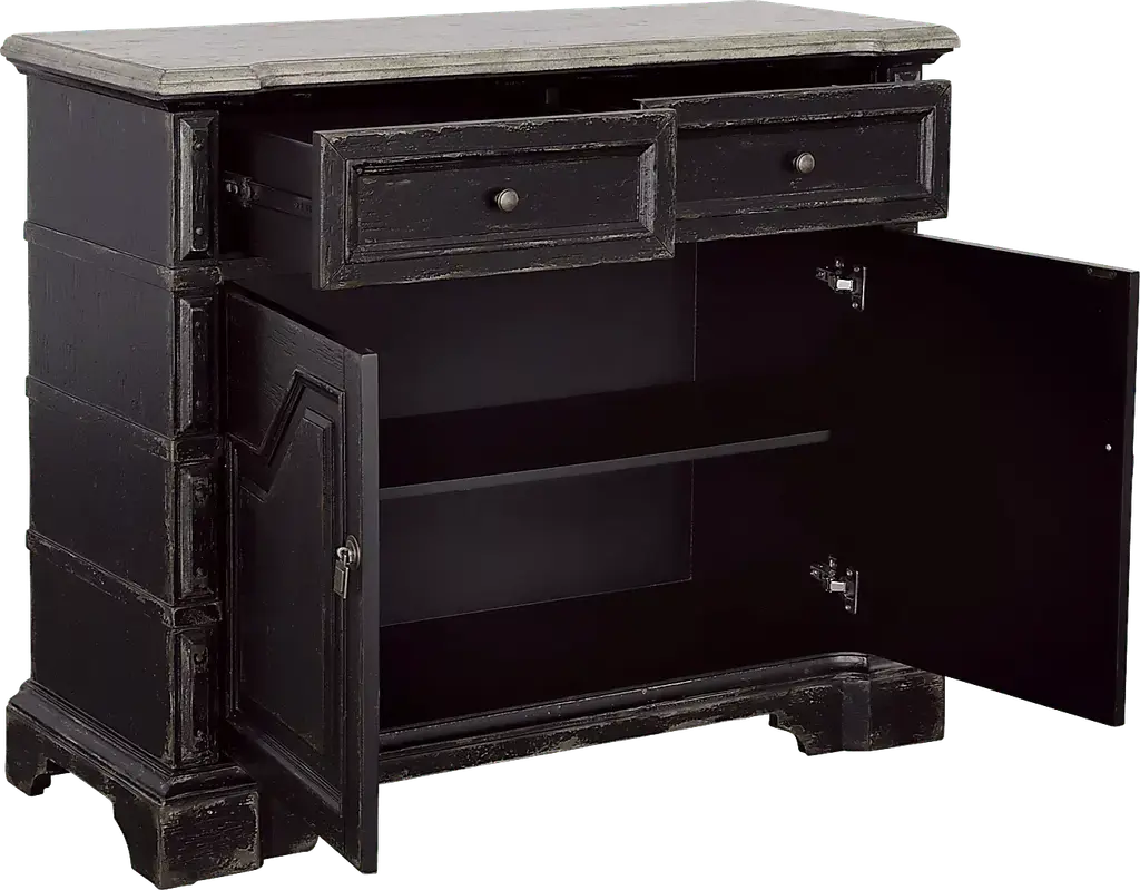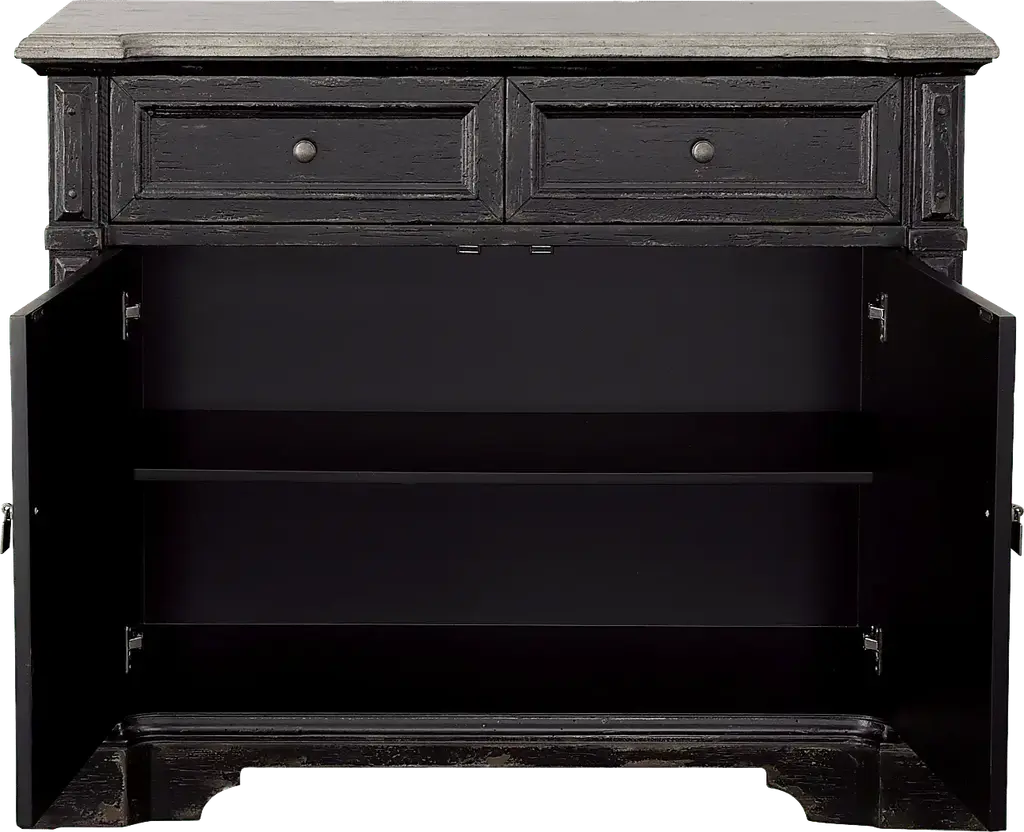 With a touch of traditional style and vintage appeal, this Thornbird two door cabinet is eye-catching and offers great utility. The frame and body of this cabinet have been finished in distressed midnight black while the top provides just the right amount of contrast with a weathered gray painted finish that shows subtle hints of wood graining. The interior cabinet space features an adjustable shelf that allows for storage of various sized items, and the two drawers are perfect for smaller items such as utensils or restaurant menus. Complete the look by displaying your family photos and decor on top. Customer assembly is required
