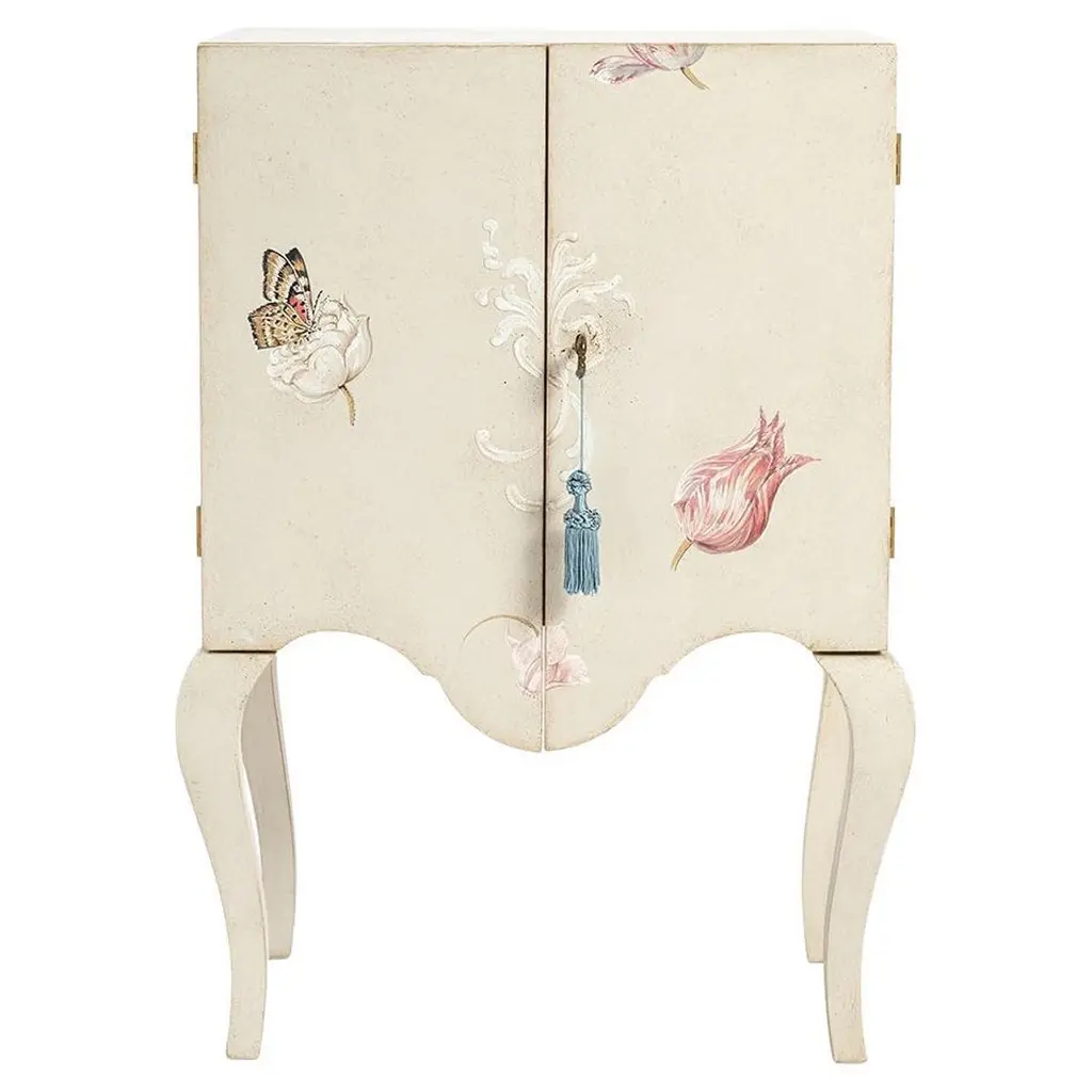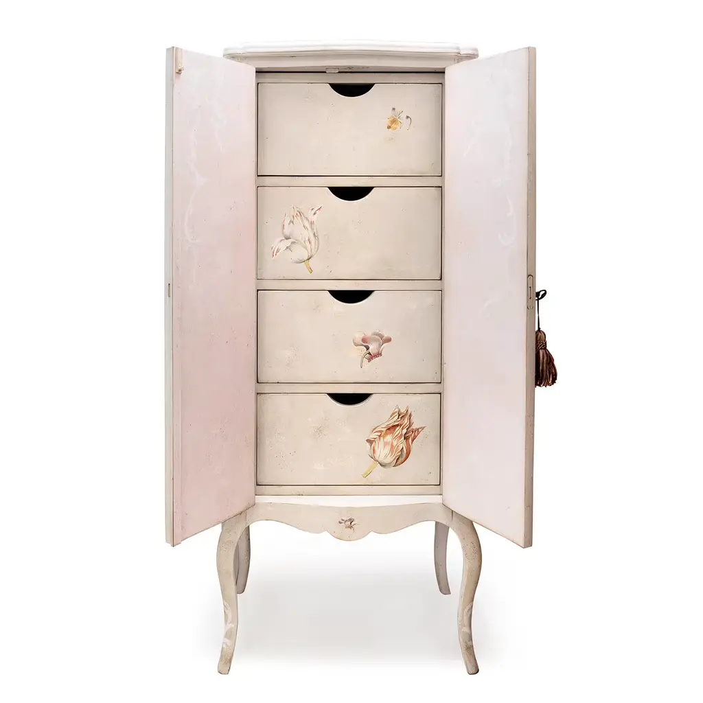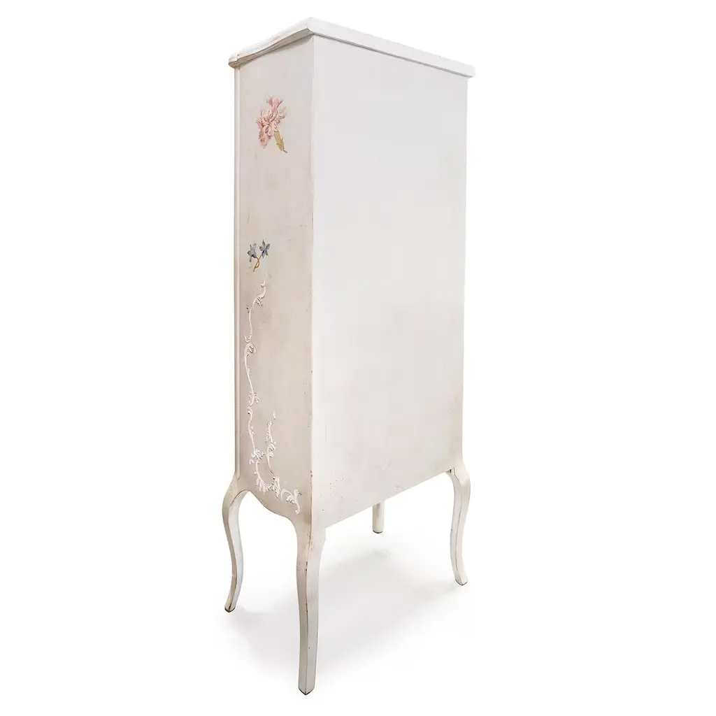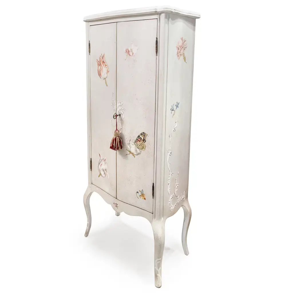 Entirely hand crafted and beautifully decorated using Venetian style techniques, the custom made Tiepolo Tall Cabinet is exceptionally stylish and charming in design. The colors and decorations can be applied according to the customer's requests in order to perfectly coordinate this piece with any decor. Extra protection may be applied to the surface on request.