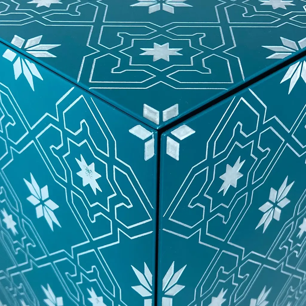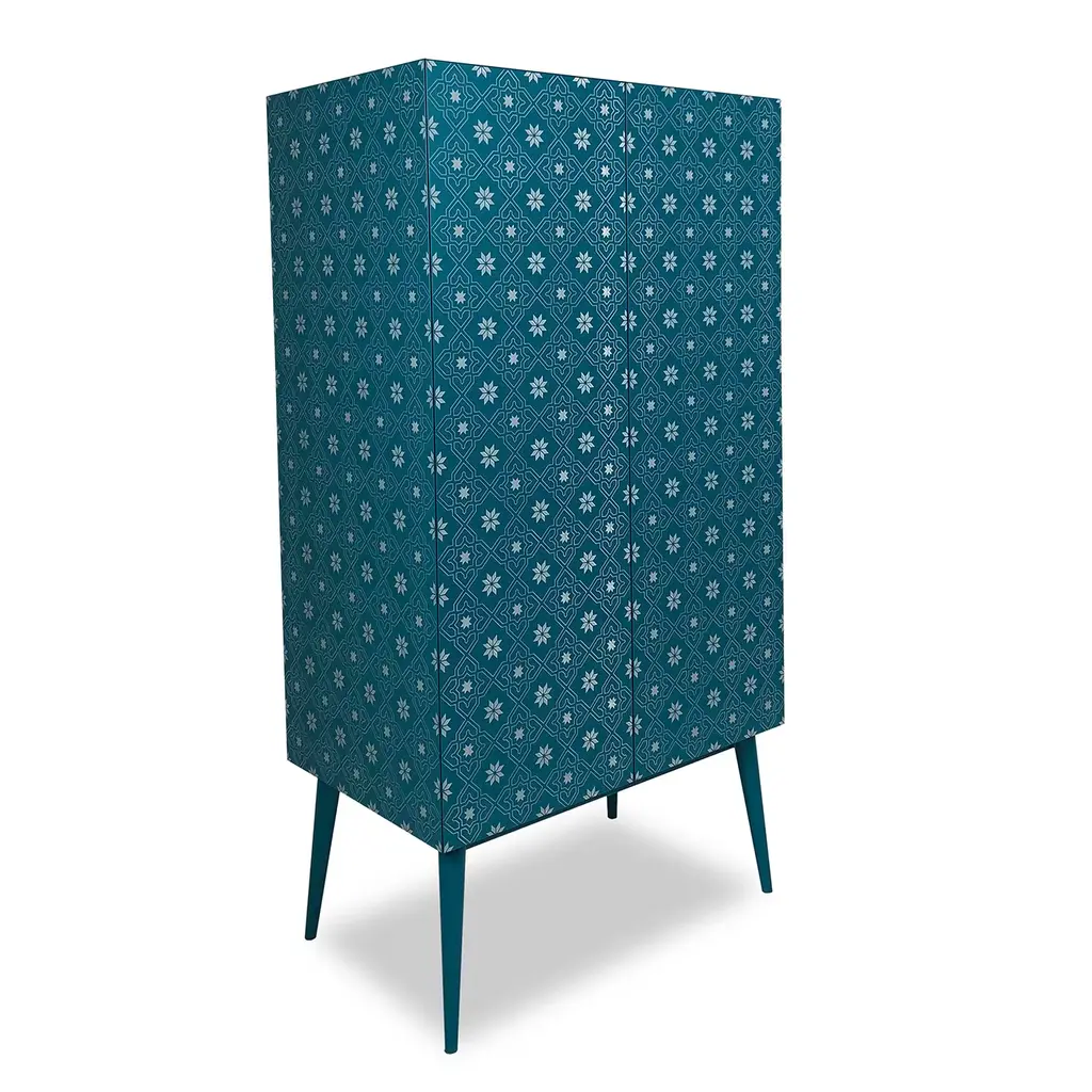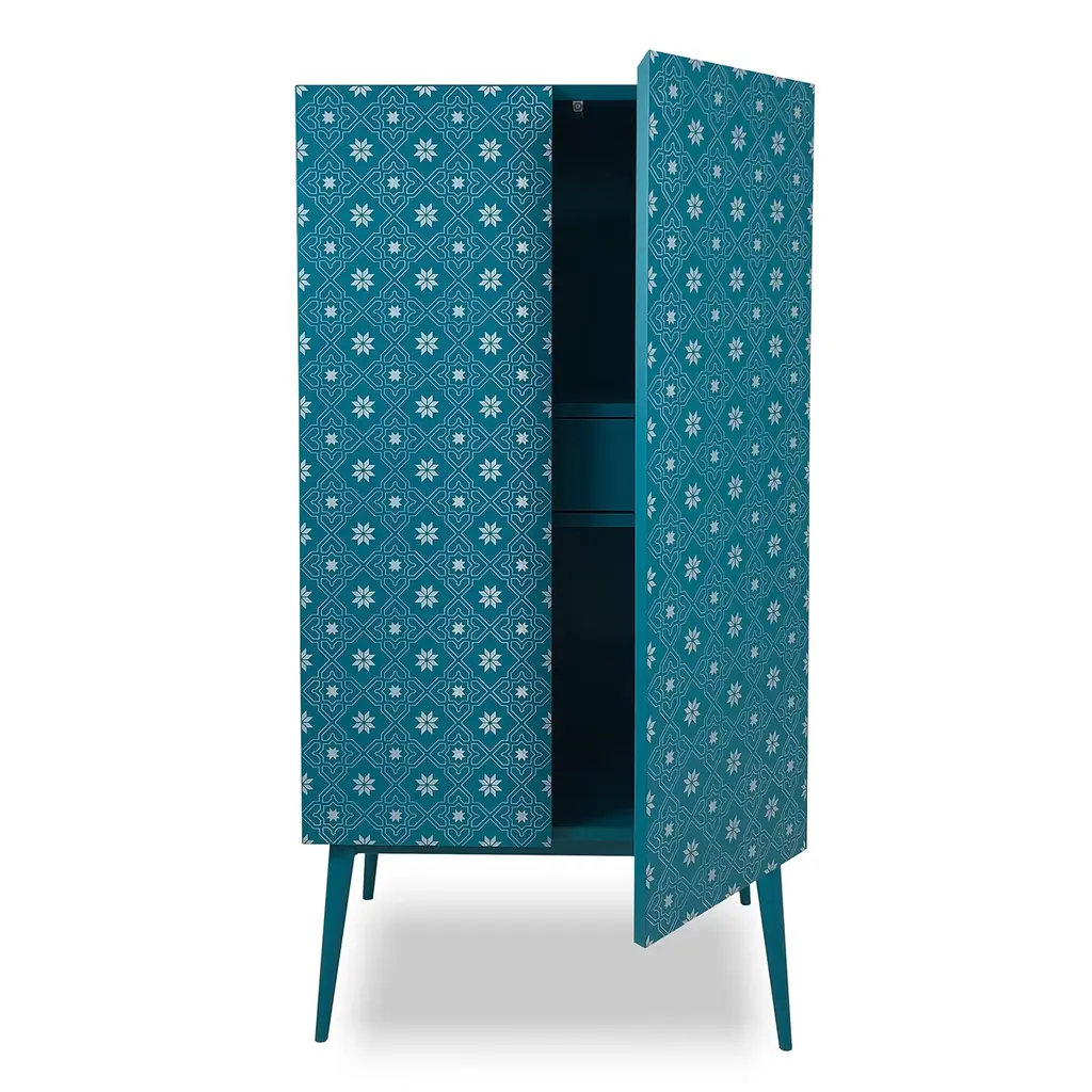 Boasting a refined azure color with white computerized engravings in a pattern that evokes the vintage tiles of old manors, this aesthetically balanced cabinet will be a colorful addition to any modern interior. The wooden frame in a two-color lacquered finish showcases two hinged doors with push-pull openings and an innovative 45° cut that allows the decoration to remain seamless. The steel base is lacquered to match the top. Pictured with a single drawer in the center and two wood shelves, the interior can be customized with three glass shelves, ask the Concierge for details.