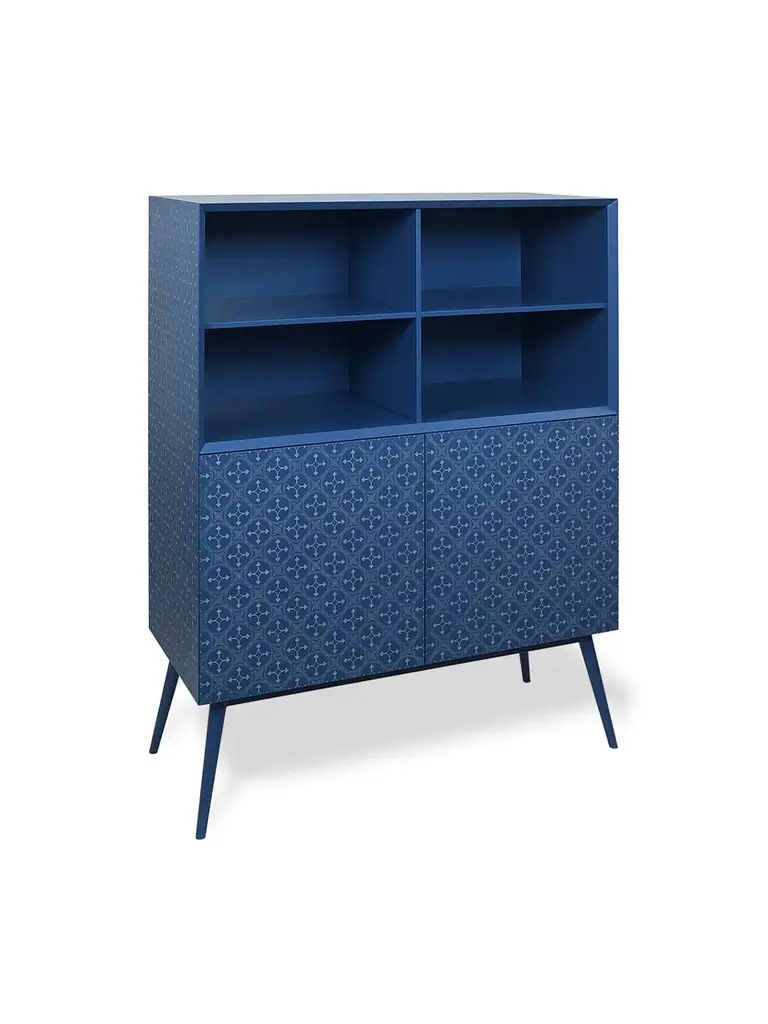 Living furniture Tiles 108 with open compartment, bookcase and two lower doors with push-open opening.Cone 30 base in turned steel and lacquered to match the container.The finish shown in the picture: incisa tiles with 7G decoration. All completely lacquered with two-tone matte finish (base color C33, engraving color C51). TILES is the collection of containers designed by Manuela Pelizzon. A collection that tells the story of region Puglia in Italy and is inspired by the cement tiles of the churches and farms of Salento. It is precisely the link with the Salento territory that shines through from the creations and the product created, an innovative and high-design product capable of releasing beauty and elegance, unique pieces with clean shapes but strong character. Thus was born a completely artisan product that was immediately appreciated, so much so that it became the "symbol" of Barba Design. The structure is completely fixed at 45 degrees, which offers the decoration of the container completely or partially wrapped. The decorations are impressed on the surface by computerized engraving. The finishes used are natural Canaletto walnut or one-color or twp-color matt lacquered finish.