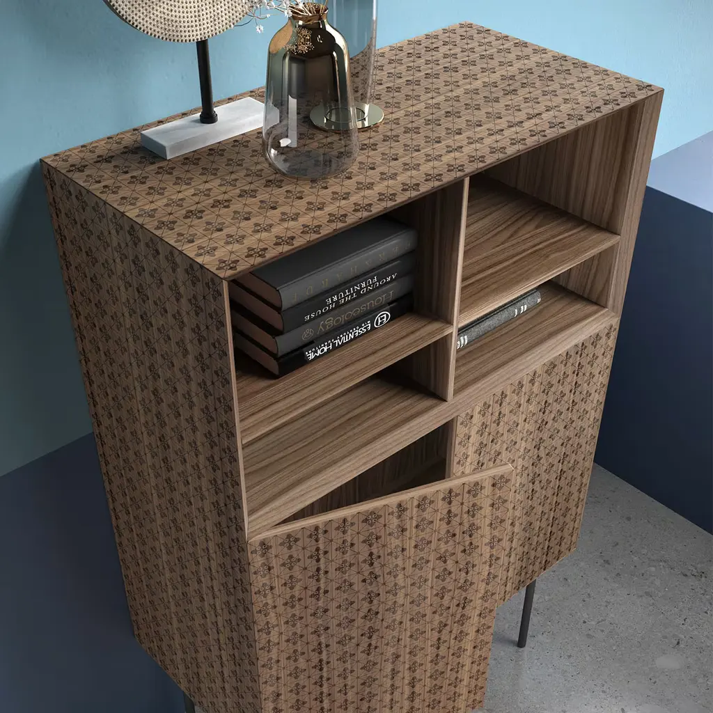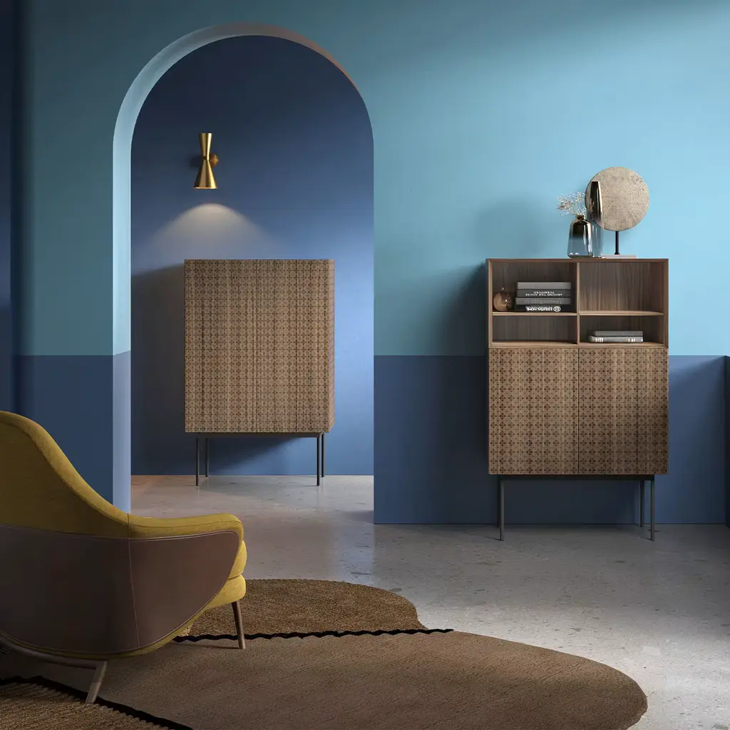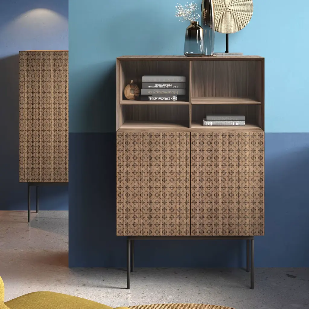 This cabinet is a study in calibrated excellence. Superb for a living or dining area, the sleek geometric silhouette provides optimal storage space while not compromising on style. The top half features four open shelves of varying heights while the bottom features an integrated cabinet to stow away essentials. The cabinet doors feature a repeating diamond-inspired motif with delicate fronds, for a sweet touch. Please contact the Concierge for further details.