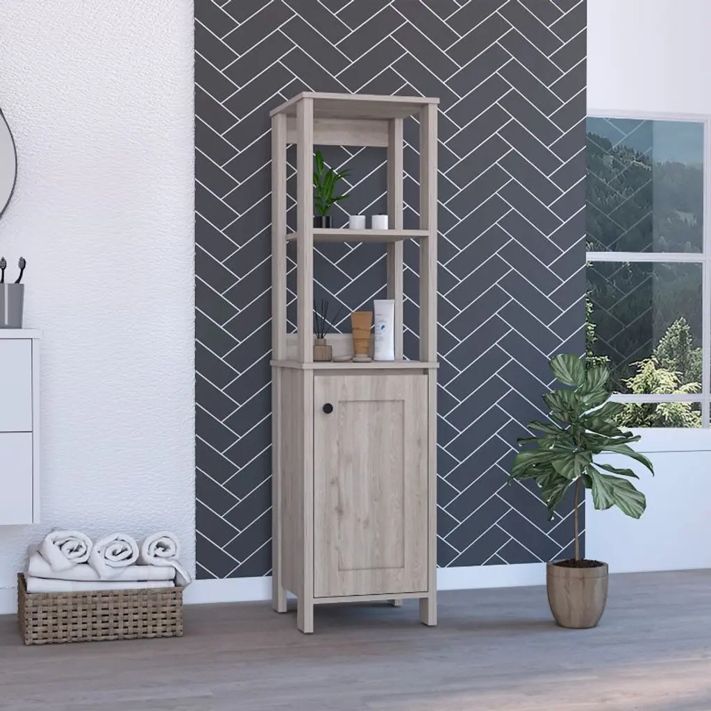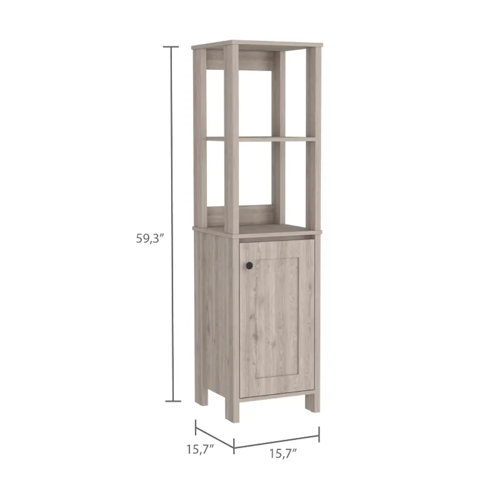Arctic Linen Cabinet, With Four Shelves, Single Door Cabinet Suppose you're looking for a stylish and ergonomic way to add extra storage to your bathroom. This unique cabinet is just the right size for storing towels, toiletries, or other necessities. Plus, the sleek light Gray particleboard finish will complement any decor. So why not add some extra organization to your life with the Arctic Linen Cabinet? With two ample external open shelves and two Interior shelves, it's ideal to ample your storage or exposes your favorite decoration. It's size (15,7''W X 15,7''D X 59,3''H) fits perfect in any bathroom.
