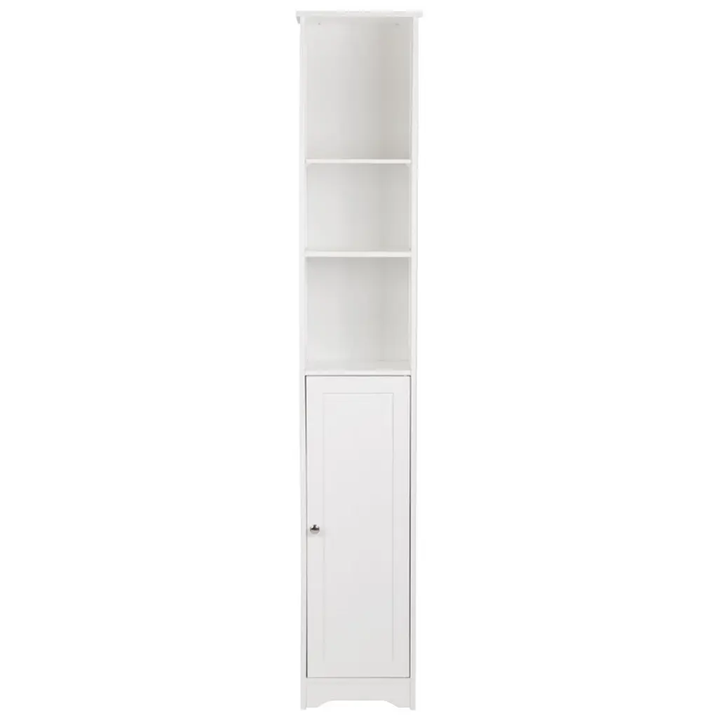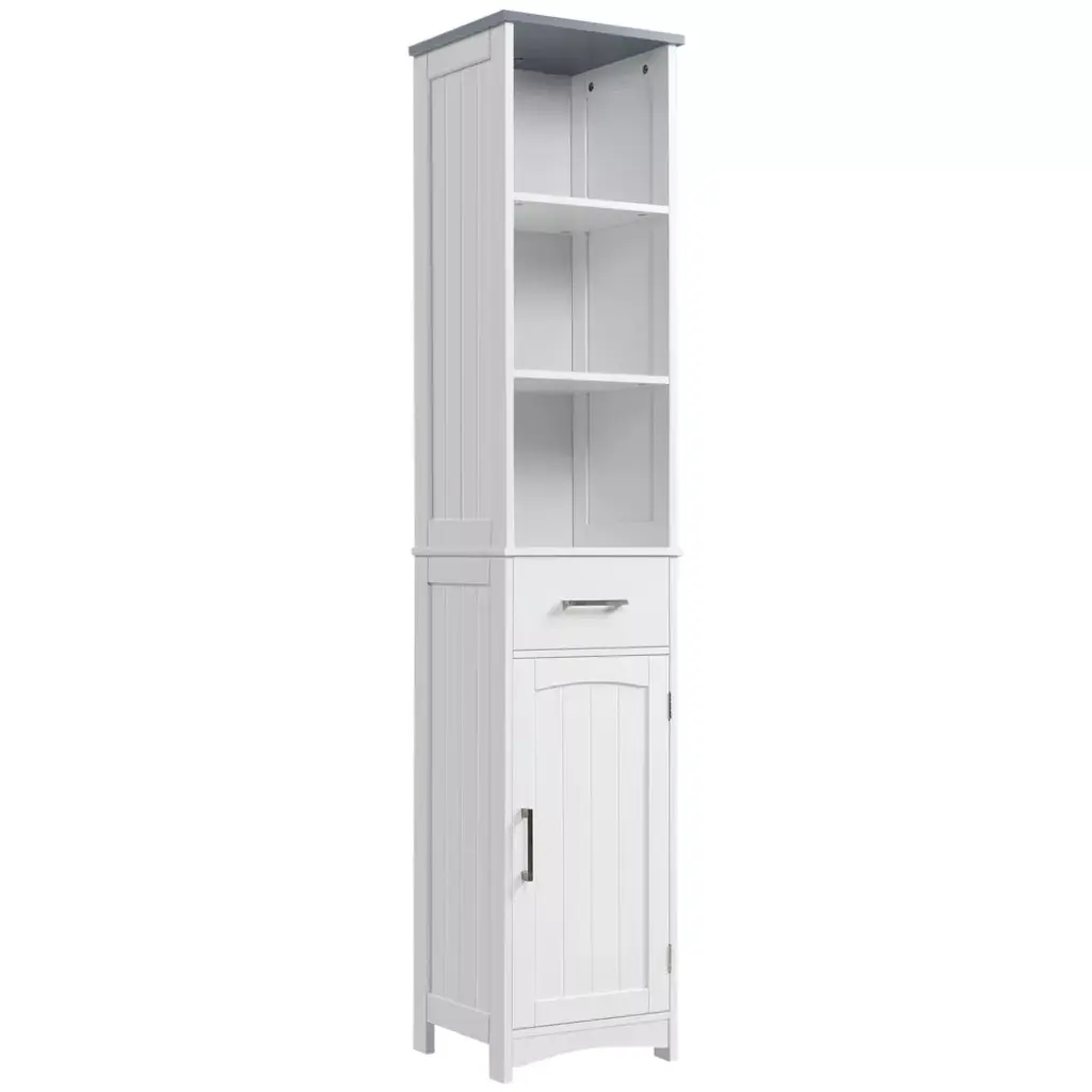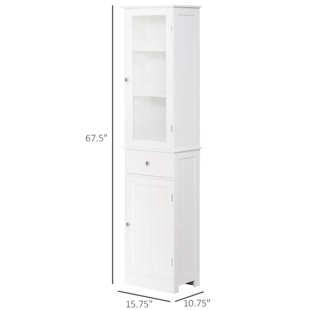 Product Details: Maximize storage in narrow spaces with the TIRAMISUBEST Slim Bathroom Storage Cabinet. Featuring a sleek white MDF design, this 67.5" tall cabinet includes 3 shelves, a middle drawer, and a bottom shelf for organizing toiletries, towels, or cleaning supplies. The acrylic door protects items from dust while maintaining a modern aesthetic. Anti-tip wall anchors ensure safety, and the compact 15.75" x 10.75" footprint fits beside sinks, toilets, or in laundry rooms. Durable P2-grade MDF and easy-clean surfaces make it perfect for high-moisture areas.