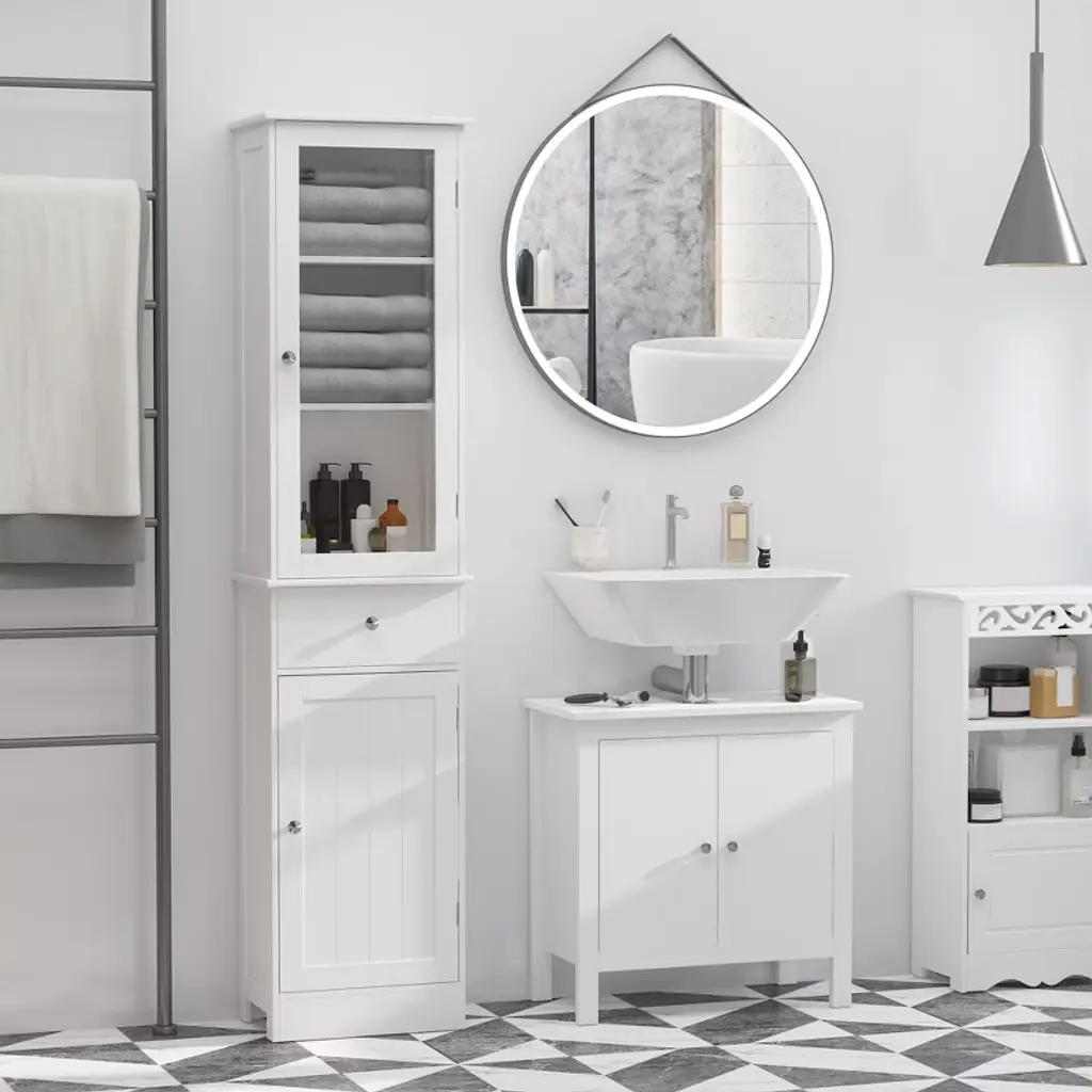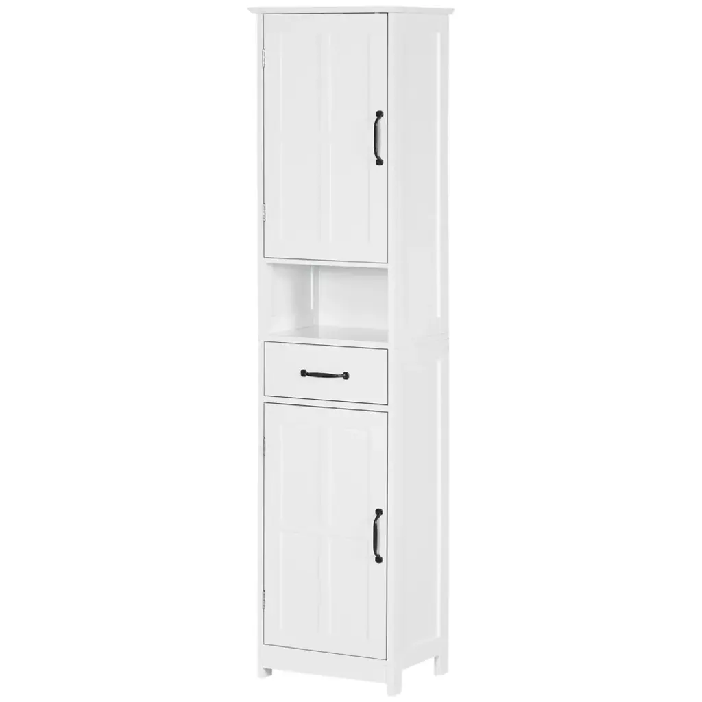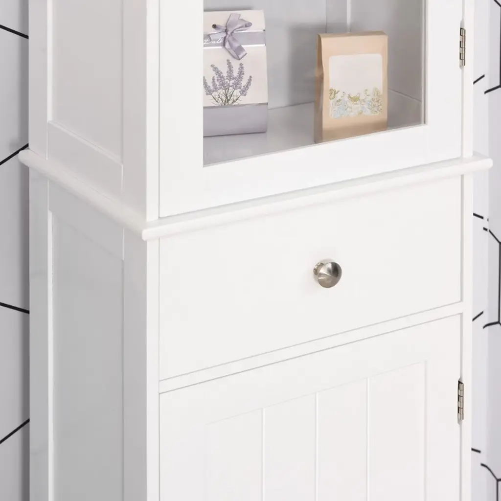 Product Details: Maximize storage in narrow spaces with the TIRAMISUBEST Slim Bathroom Storage Cabinet. Featuring a sleek white MDF design, this 67.5" tall cabinet includes 3 shelves, a middle drawer, and a bottom shelf for organizing toiletries, towels, or cleaning supplies. The acrylic door protects items from dust while maintaining a modern aesthetic. Anti-tip wall anchors ensure safety, and the compact 15.75" x 10.75" footprint fits beside sinks, toilets, or in laundry rooms. Durable P2-grade MDF and easy-clean surfaces make it perfect for high-moisture areas.