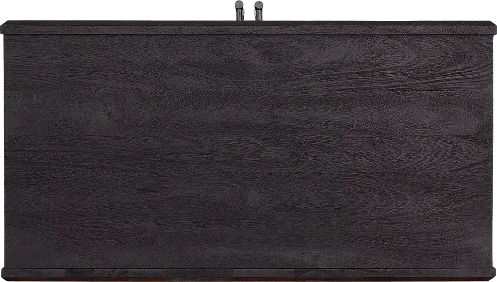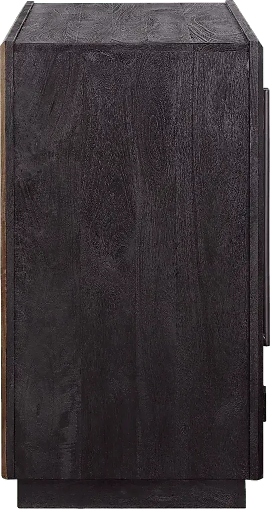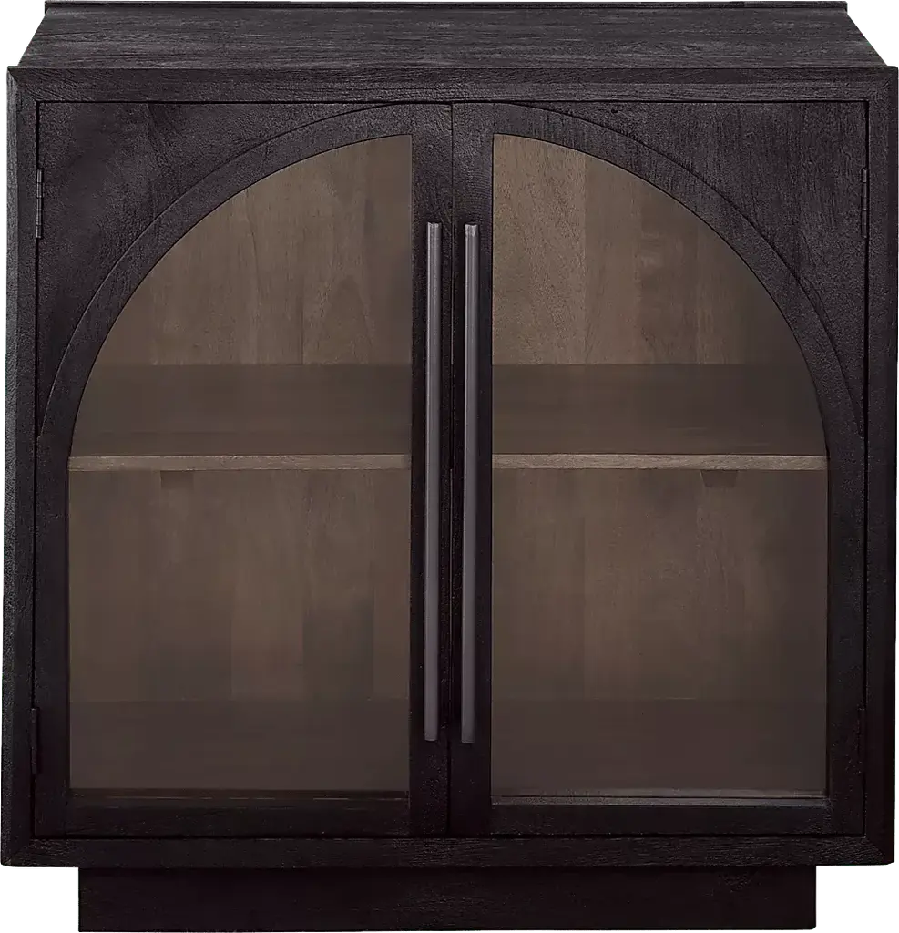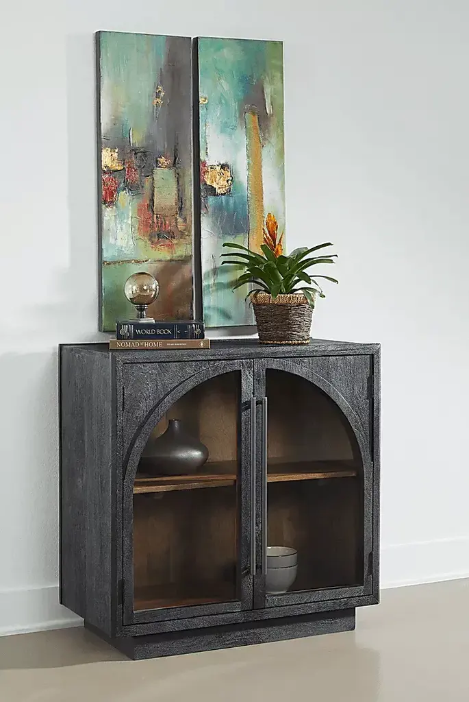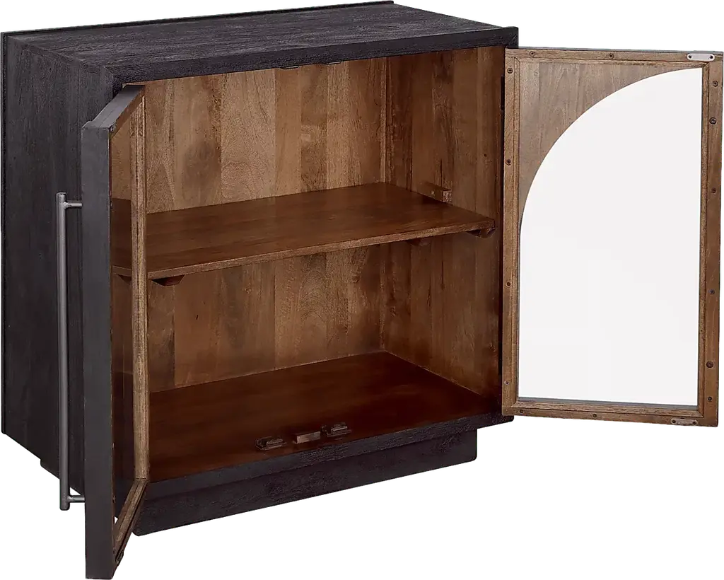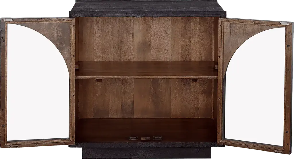 The Tomanent is a cabinet that makes a statement wherever it is placed. Expertly crafted from solid mango wood that features a black finish on the exterior while the interior provides contrast with its natural wood finish. The two doors form an arched design with glass insets that allow a shadowbox display area to showcase valued heirlooms. The sleek black powder coated iron door pulls add a final sophisticated touch. Customer assembly is required.