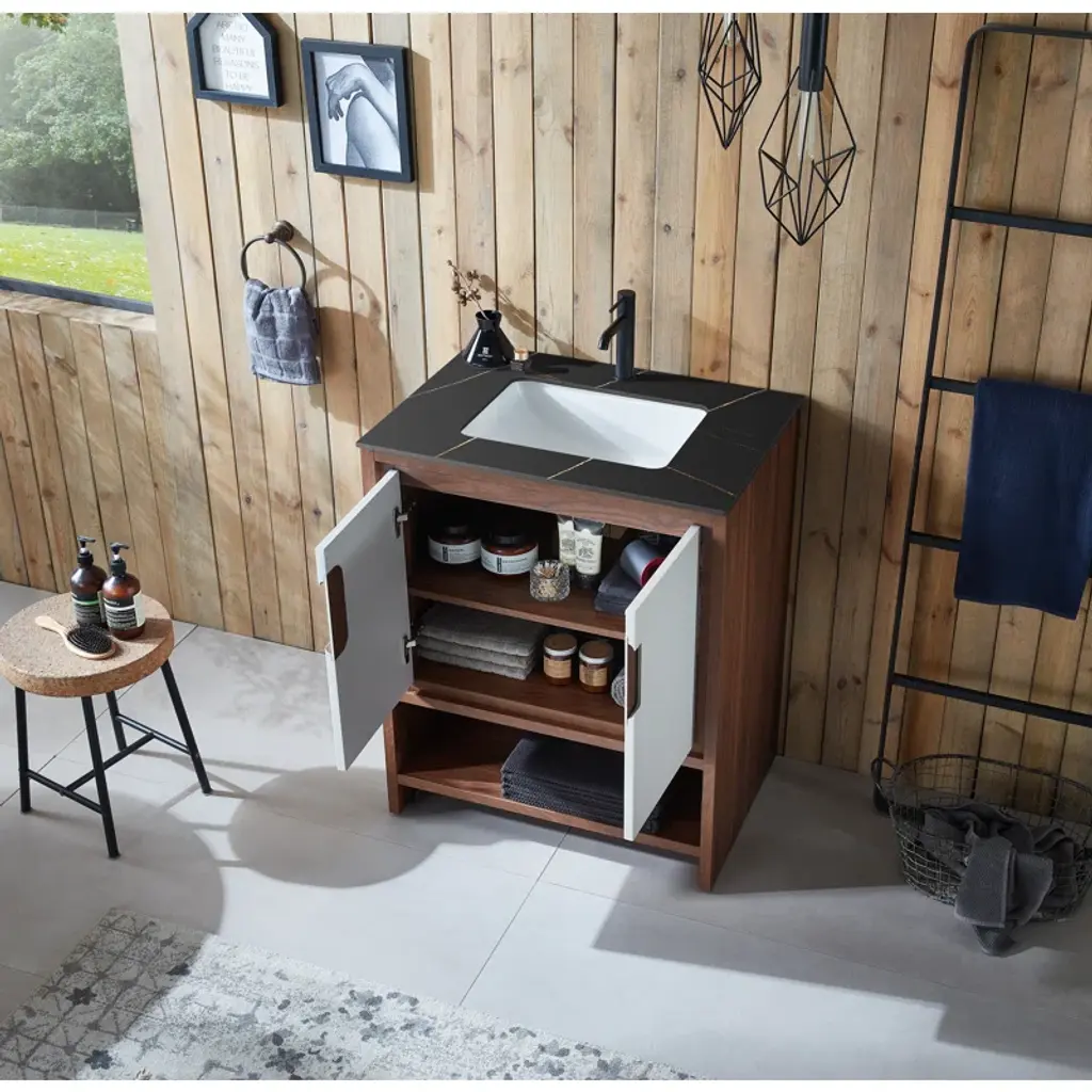 Tomesia 30” Walnut Modern Freestanding Bathroom Vanity (Black Countertop)