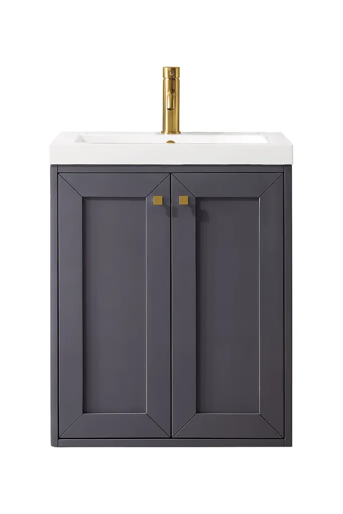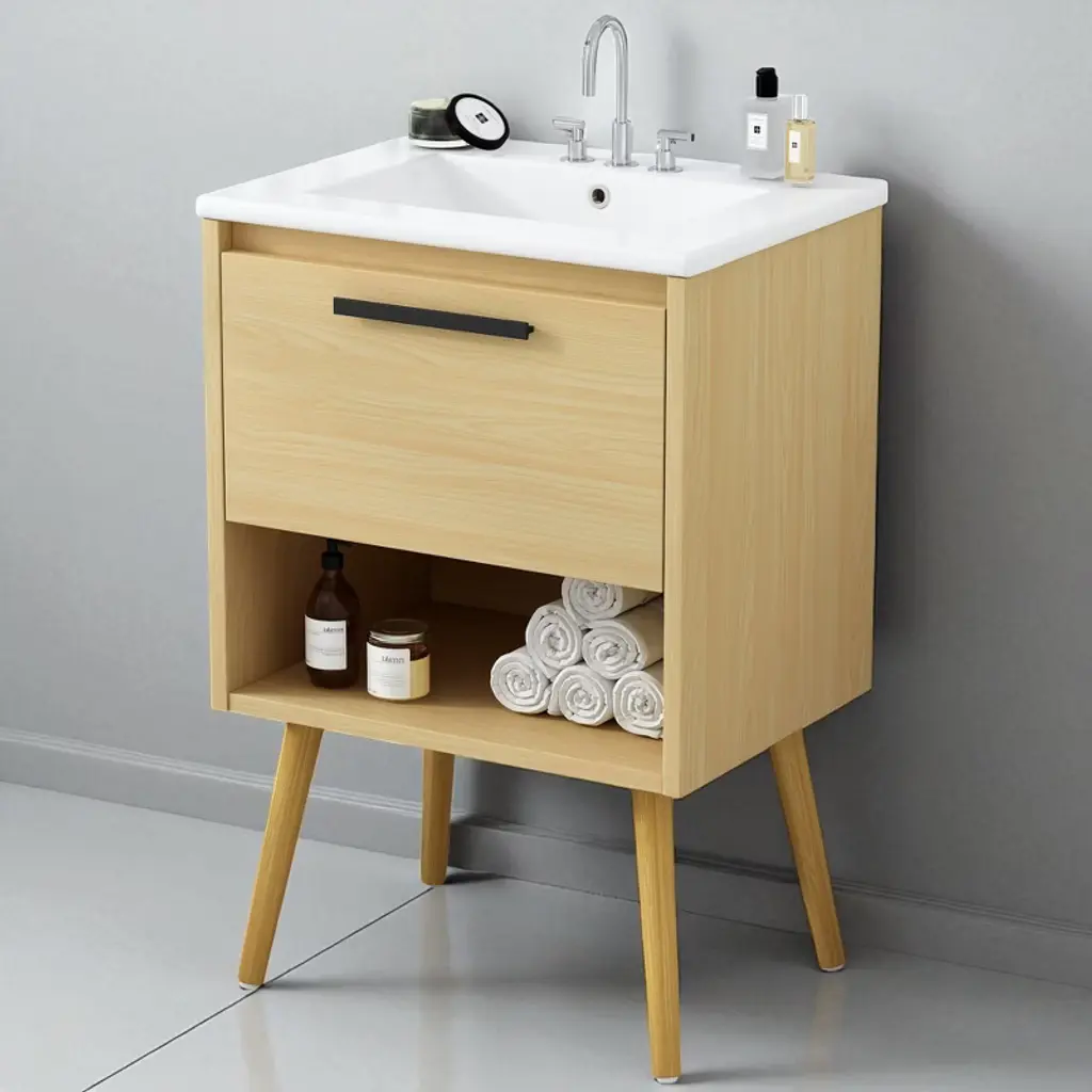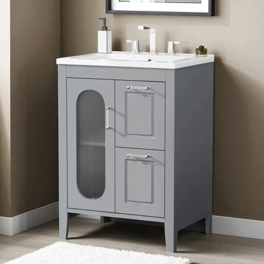 Tomesia strikes the perfect balance between rustic charm and contemporary style. Its warm wood paneling complements the Valspar-coated doors and a sleek, modern countertop. The premium sintered stone counter is equipped with ceramic undermount sinks. The concave design of the unique handles and door edges adds a distinctive, three-dimensional look to the piece. Double cabinet doors open to reveal multiple shelves and an open bottom shelf for additional storage.
