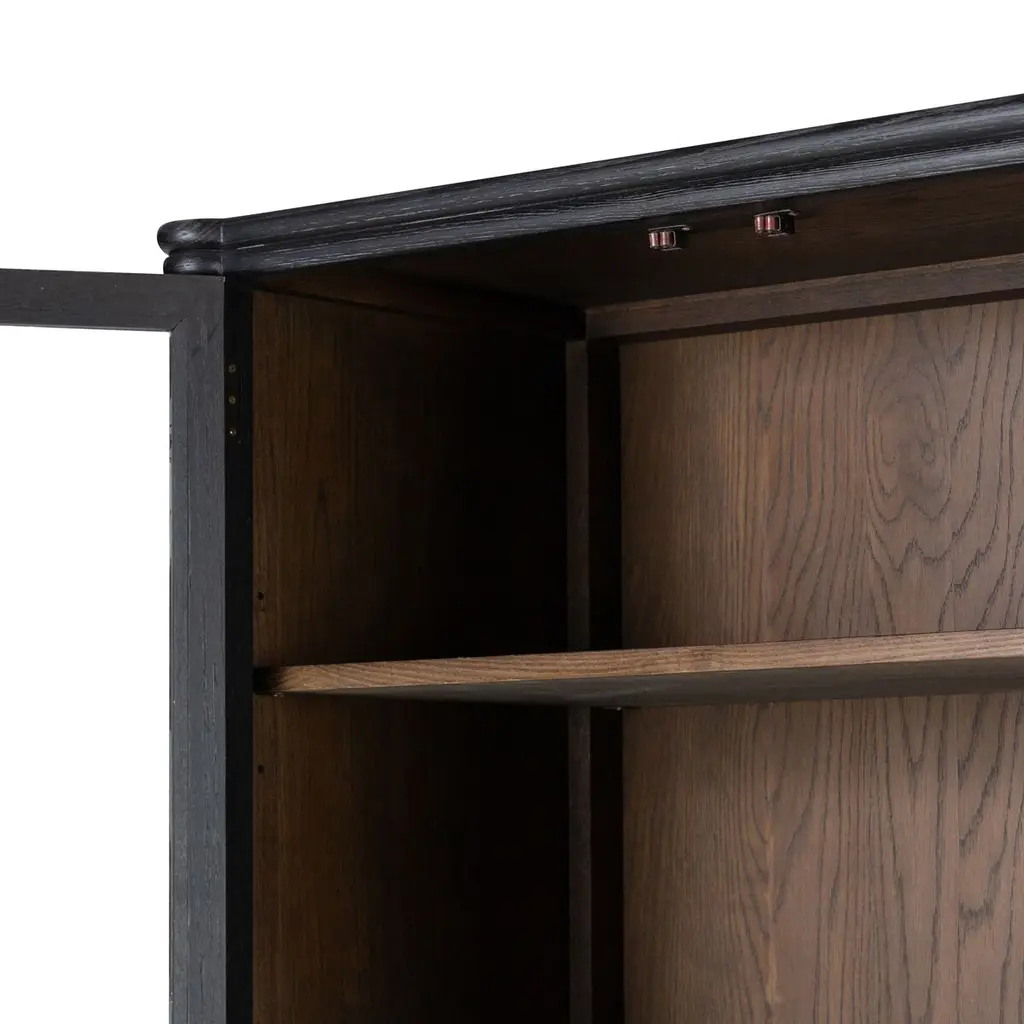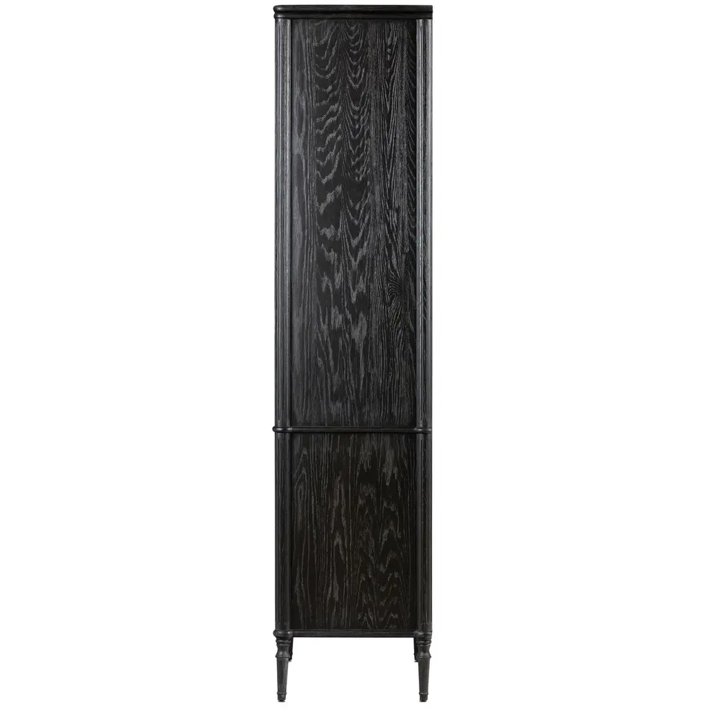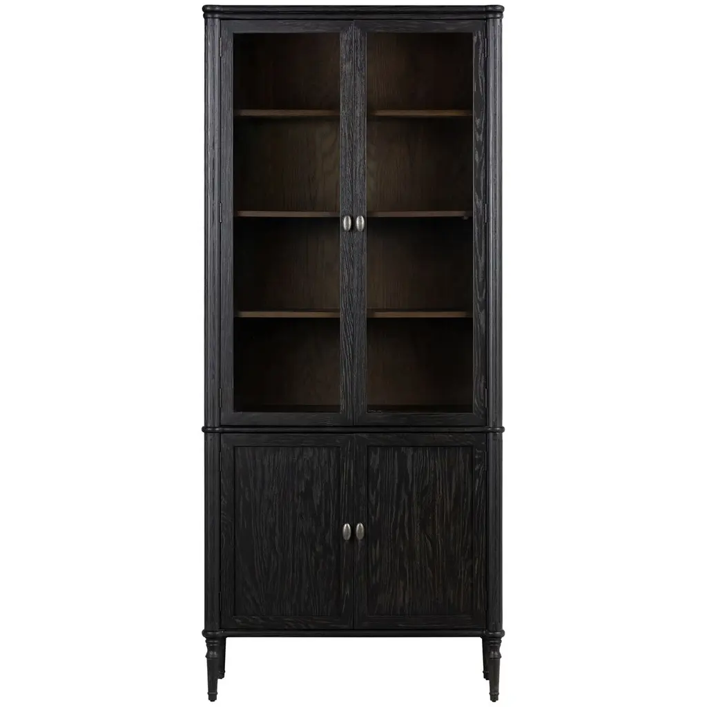 This cabinet's gently distressed black finish accentuates the distinctive grain of the oak, a hardwood prized for its beauty as well as its durability. Tapered spindle legs and framed panels give the cabinet an Old World elegance. In addition to the shelves visible behind the glass-front doors, there's another shelf hidden behind the lower doors.