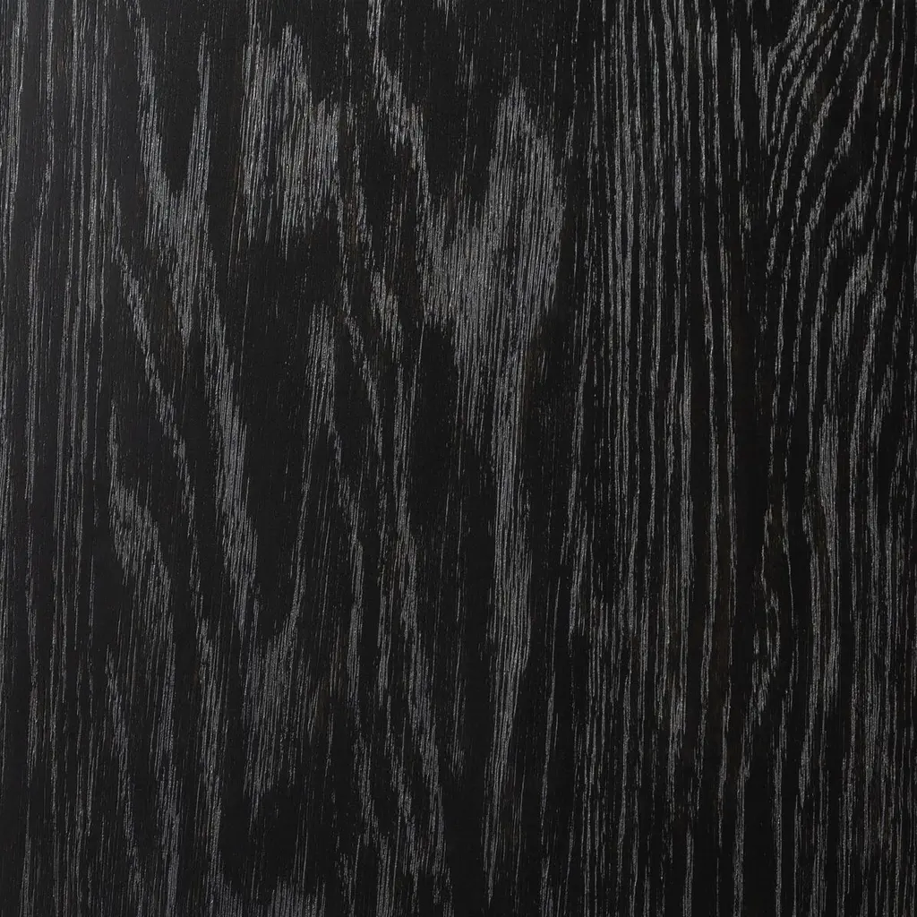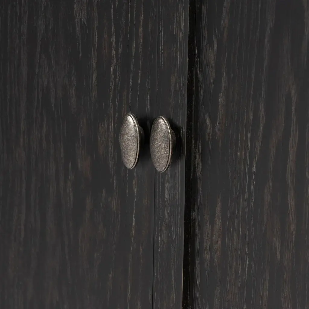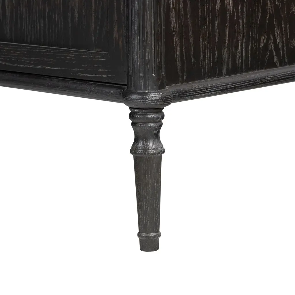 This cabinet's gently distressed black finish accentuates the distinctive grain of the oak, a hardwood prized for its beauty as well as its durability. Tapered spindle legs and framed panels give the cabinet an Old World elegance. In addition to the shelves visible behind the glass-front doors, there's another shelf hidden behind the lower doors.