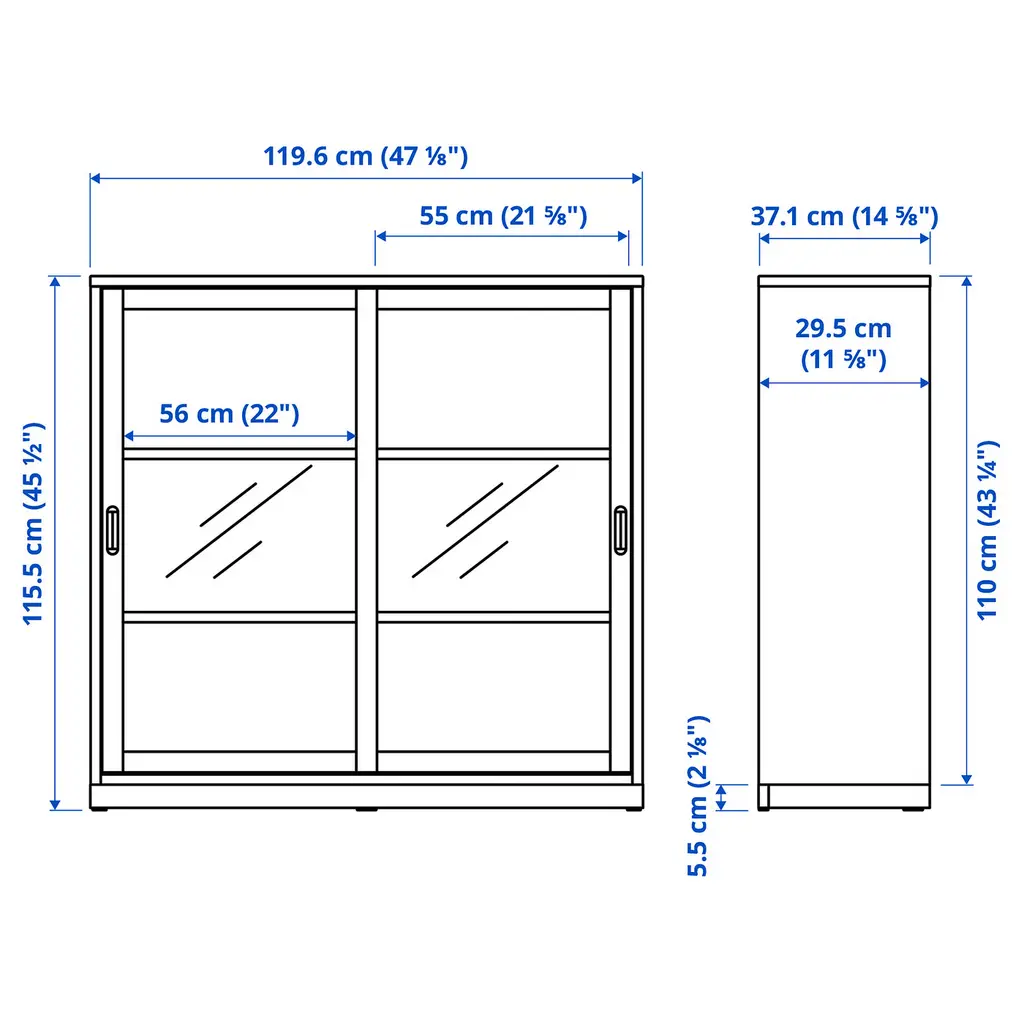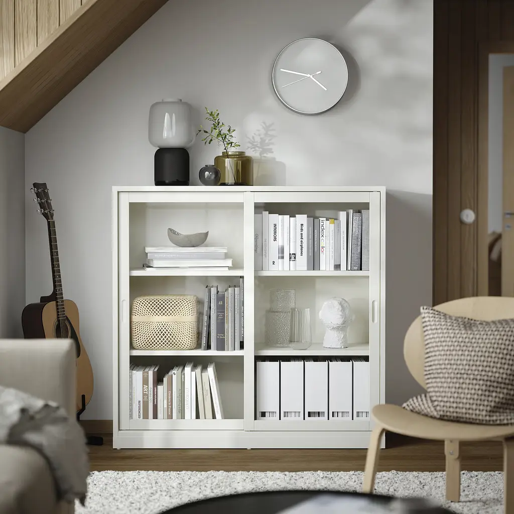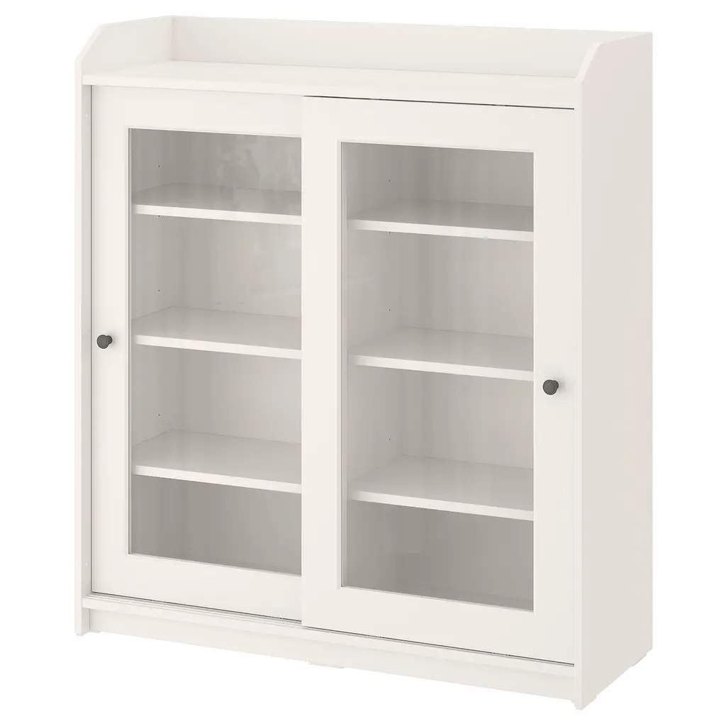 TONSTAD Cabinet with sliding glass doors - off-white 47 1/8x14 5/8x45 1/2 ". The integrated handle has clean lines and is an elegant detail that gives the furniture that little something extra. 2 movable shelves make it easy to adapt the space to your storage needs.