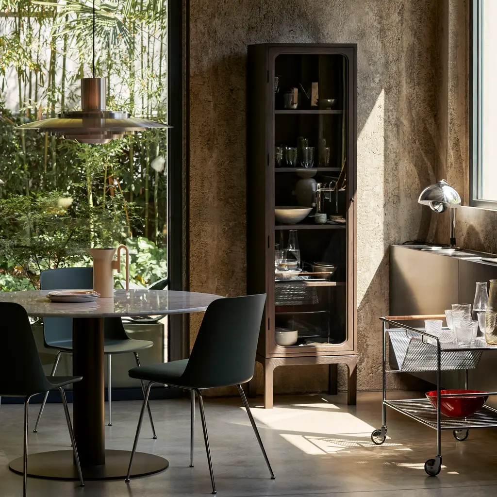 The Trace Cabinets SC87 and SC88, designed by Space Copenhagen, were inspired by Ithe idea of preserving life’s small, sentimental objects. Crafted from solid oak and oak veneer with tempered glass doors, these cabinets are available in either a single (SC87) or double (SC88) size. They feature brass hardware on the natural oak variant and bronzed brass on the dark-stained oak.