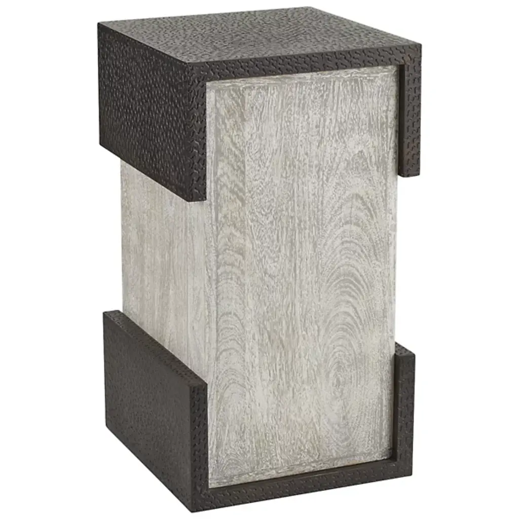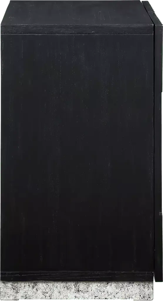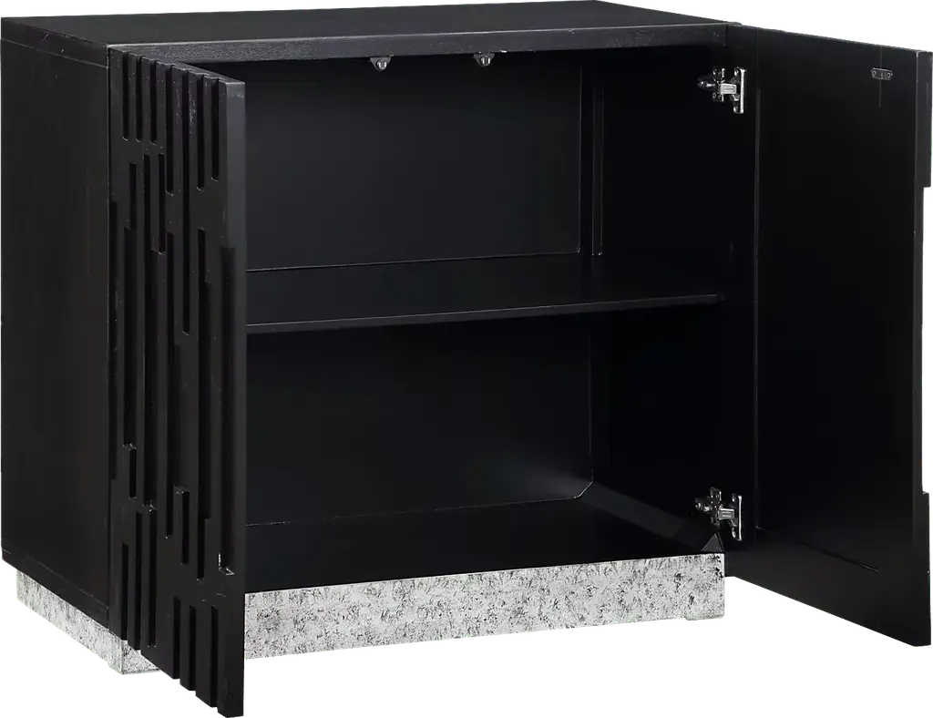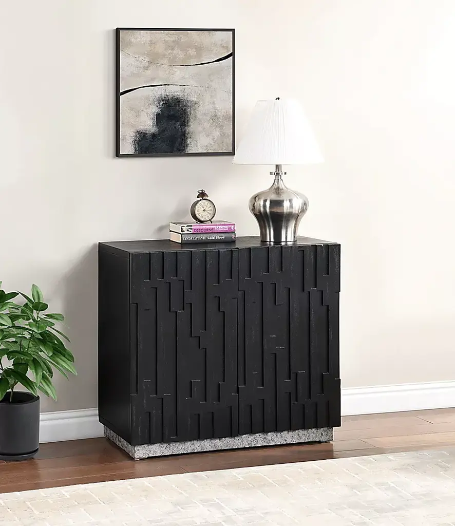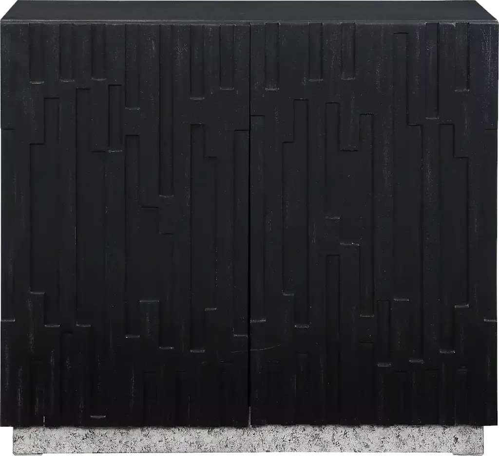 Add function and style to any space with this Trafford two-door accent cabinet. The weathered black finish and unique geometric patterned door fronts create an eye-catching display. The speckled white finished plinth base creates a subtle contrast while the discreet touch-latch hardware allows the doors to open with a simple push. You'll find that the spacious shelved interior provides ample storage space for all your needs. Customer assembly is required.