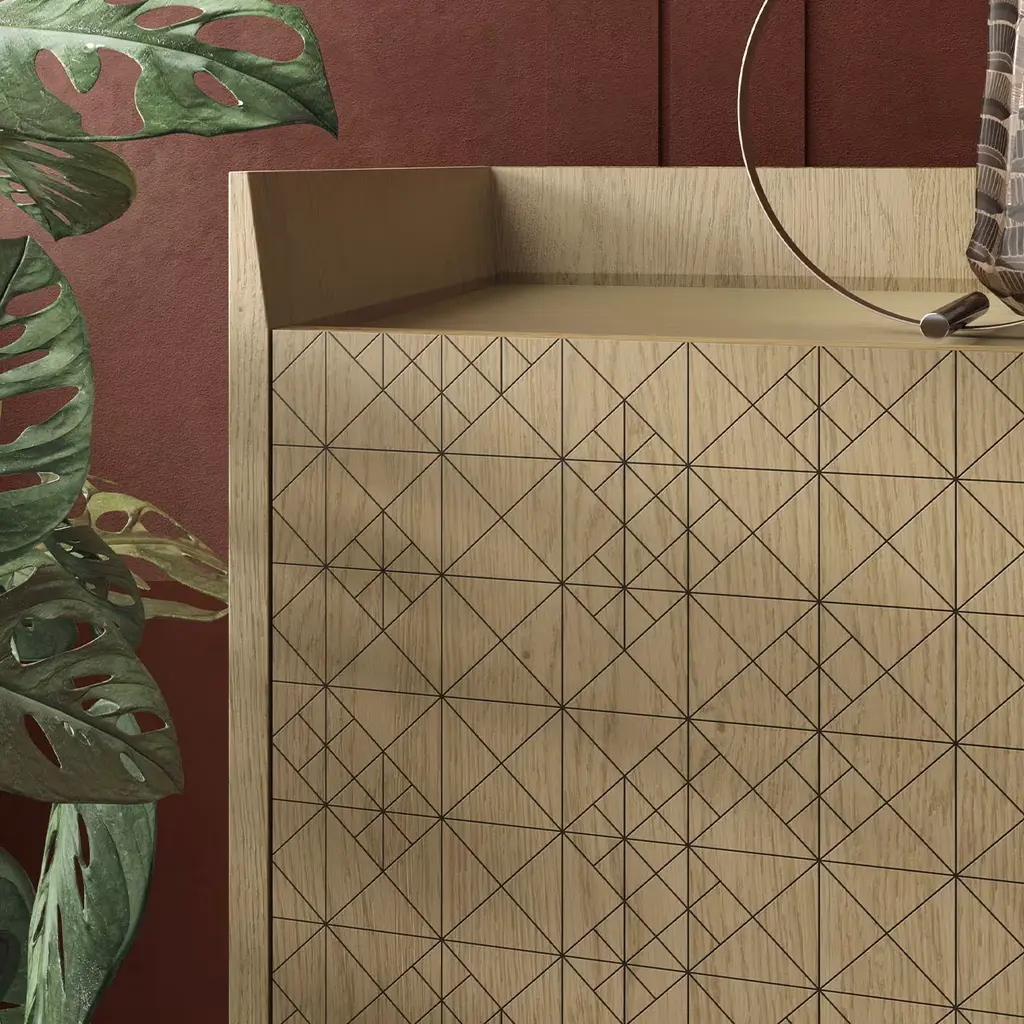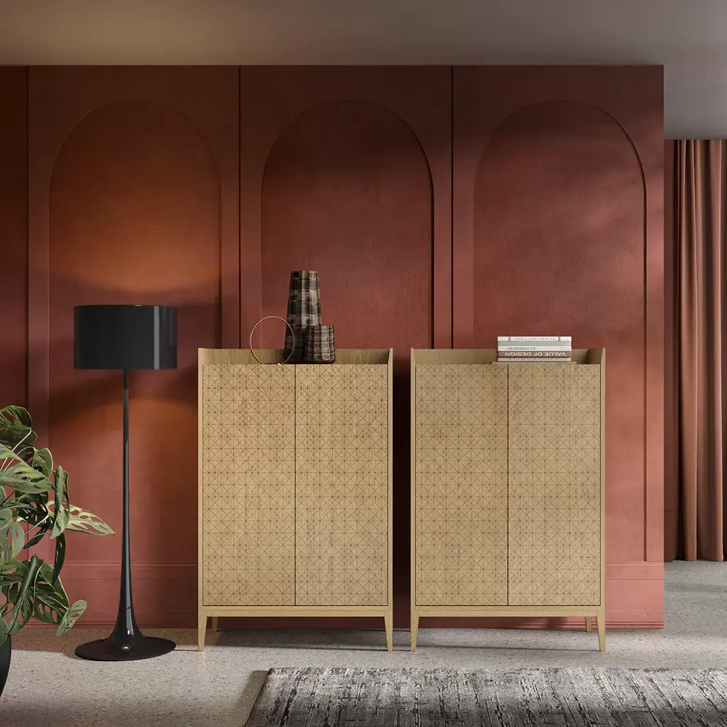 A superb complement to various decor styles, this pair of cabinets marges artisanal sensibility and contemporary inspiration. Drawing inspiration from the ancient Japanese "Kumiko" technique, the sleek profile features a tall, rectangular body with an integrated top shelf, all propped on dainty saber feet. Flaunting a natural Oak finish, the wood grain flows uninterrupted throughout the cabinet, enhancing the criss-crossed decorative design. Measures L 95 x H 150 x D 45 cm.