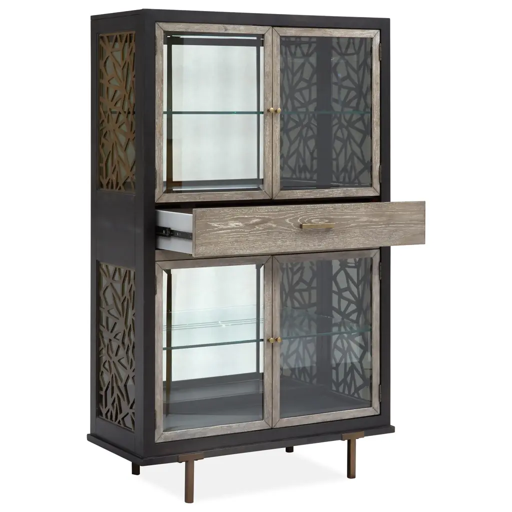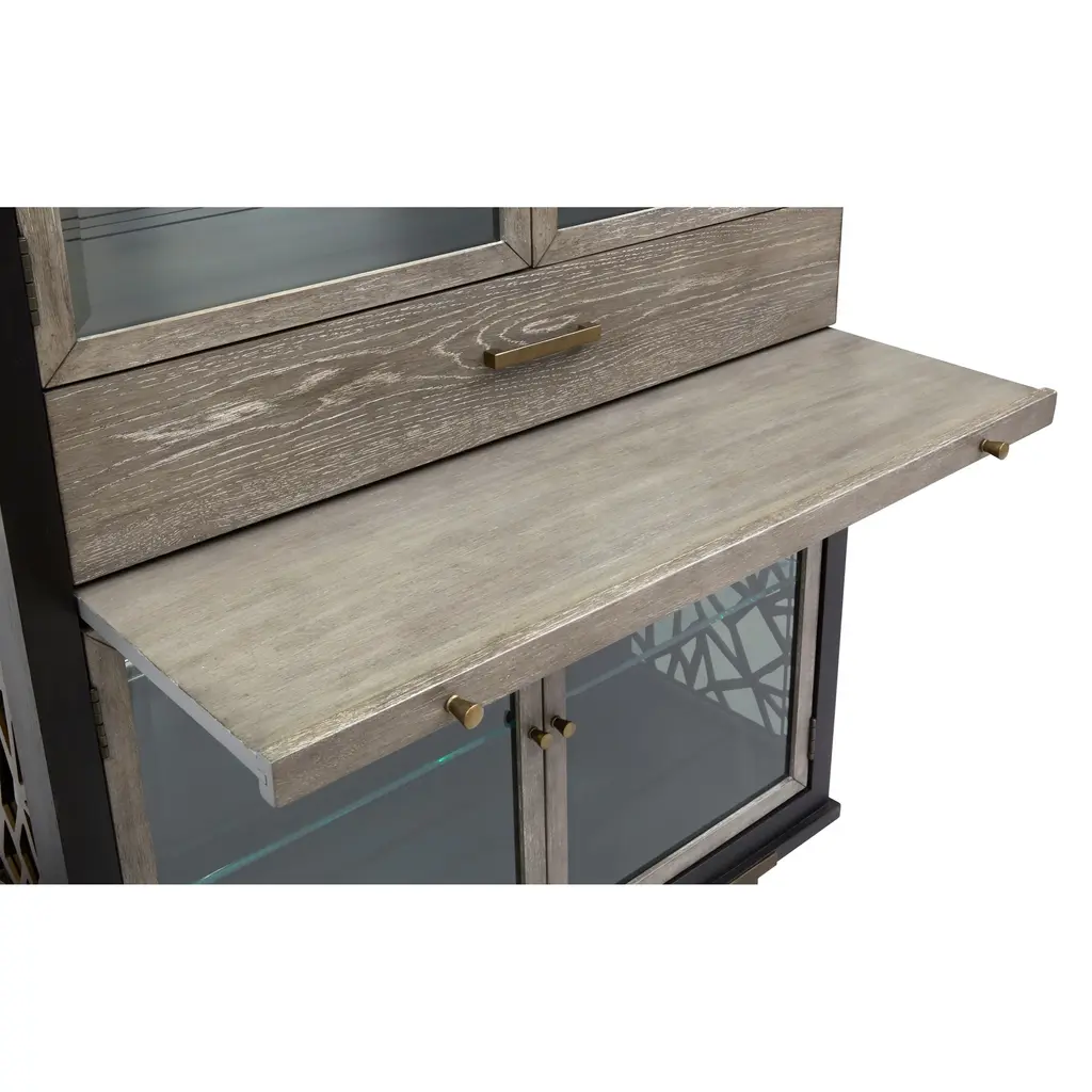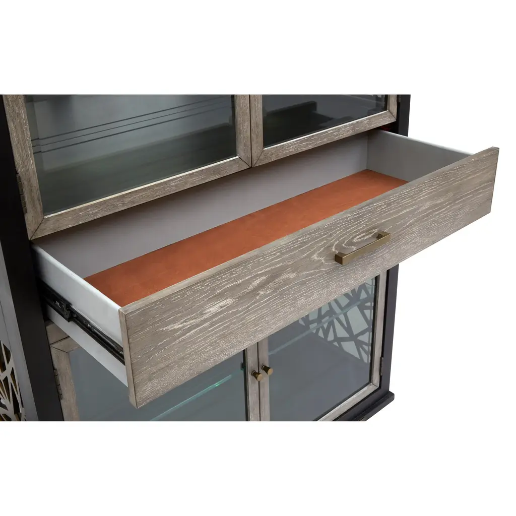 From the weathered two-tone wood finish to the abstract gold accents, this piece is sure to garner praise from all. Outfitted with both open and concealed storage options, this cabinet is perfect for showcasing your finest china while also keeping flatware and napkins neatly stocked away. Adding to the functionality is a pull-out shelf perfect for serving your favorite hors d'oeuvres for a family holiday or gathering with your friends. No matter the event, this cabinet is sure to not only meet but exceed your needs and expectations.