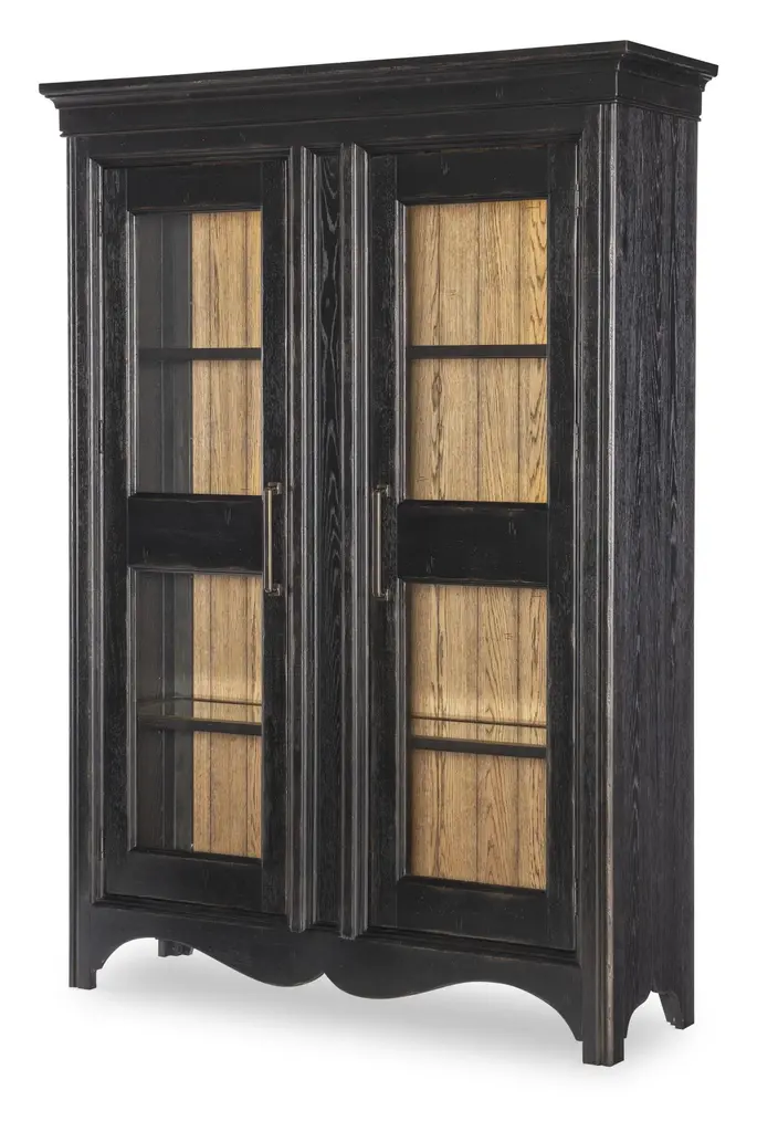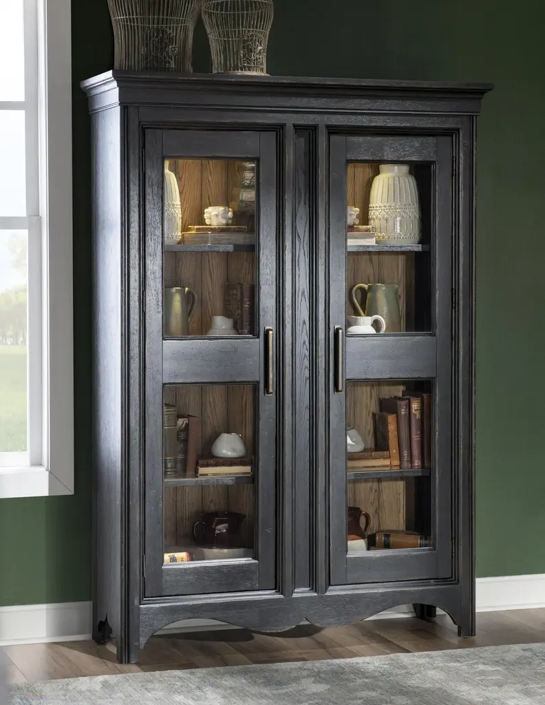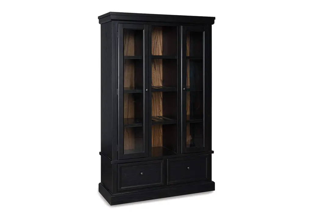 This beautifully crafted storage and display cabinet is perfect for showcasing your favorite treasures and keeping them dust-free. Made from select hardwoods and oak veneer, it boasts a sturdy construction that will withstand the test of time. The Kettle Black and Barnwood Oak finish gives it a unique, transitional look that will complement any room's décor.The cabinet features two glass front doors, allowing you to easily view your displayed items, and three adjustable wood-framed glass shelves, providing ample space to store and showcase your belongings. The cast iron finished hardware adds a touch of elegance and sophistication to the overall design.With built-in lighting, you can highlight your favorite pieces and create a warm ambiance in the room. The adjustable shelves allow you to customize the storage space to fit your needs, making it perfect for displaying decorative items, fine china, or other treasured possessions.Whether you're looking to add a touch of sophistication to your dining room, living room, or entryway, this glass front display cabinet is sure to impress. Its transitional design style makes it versatile and easy to incorporate into any existing décor, and its high-quality construction ensures it will remain a beautiful and functional piece of furniture for years to come.