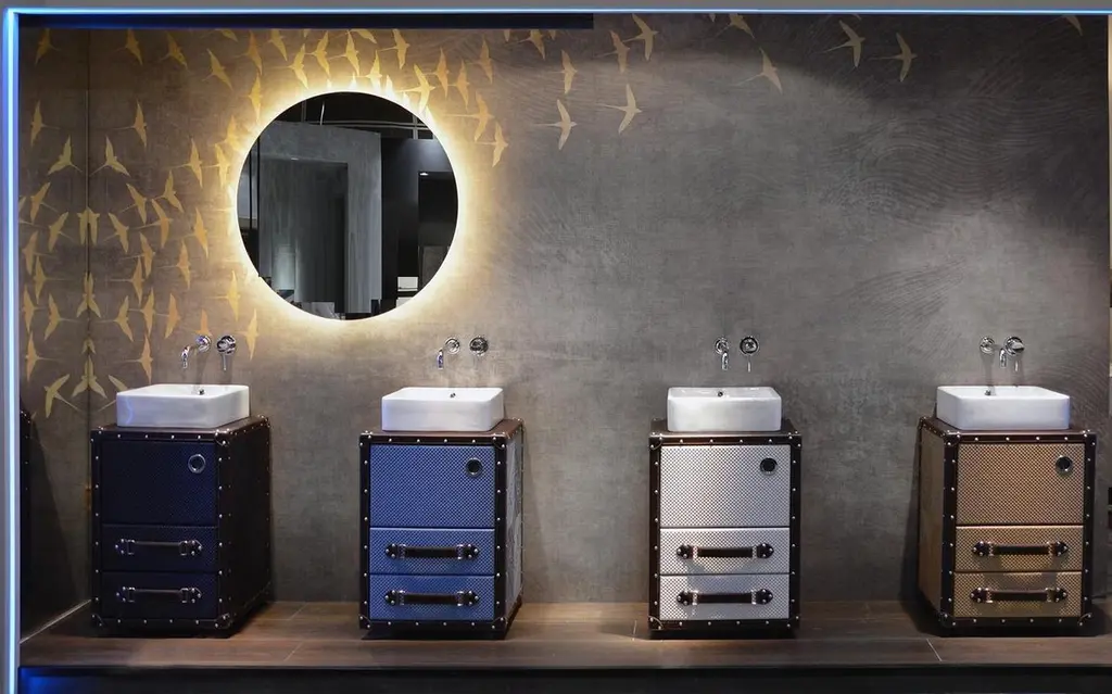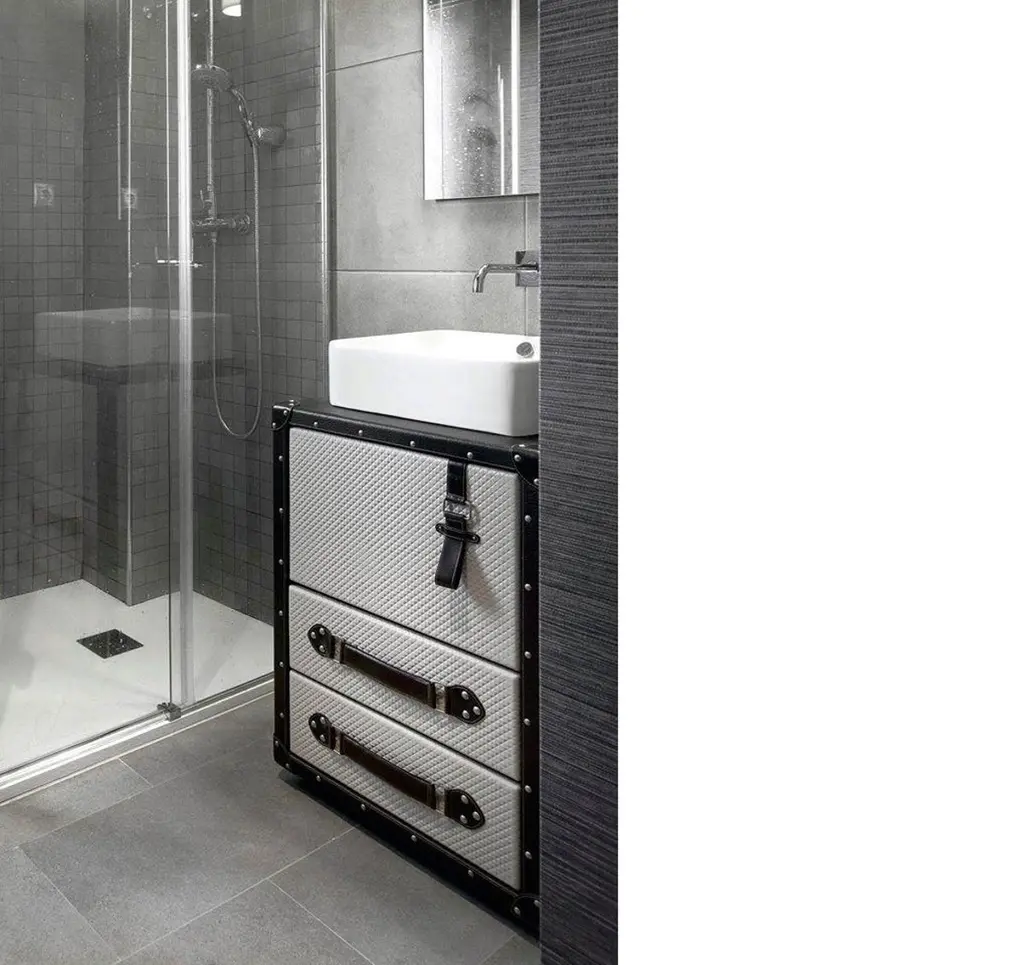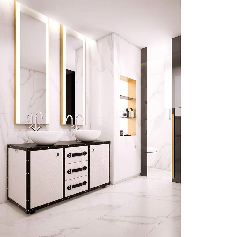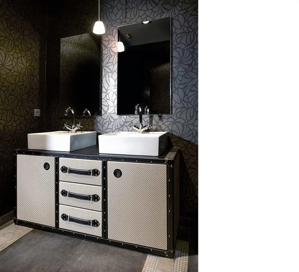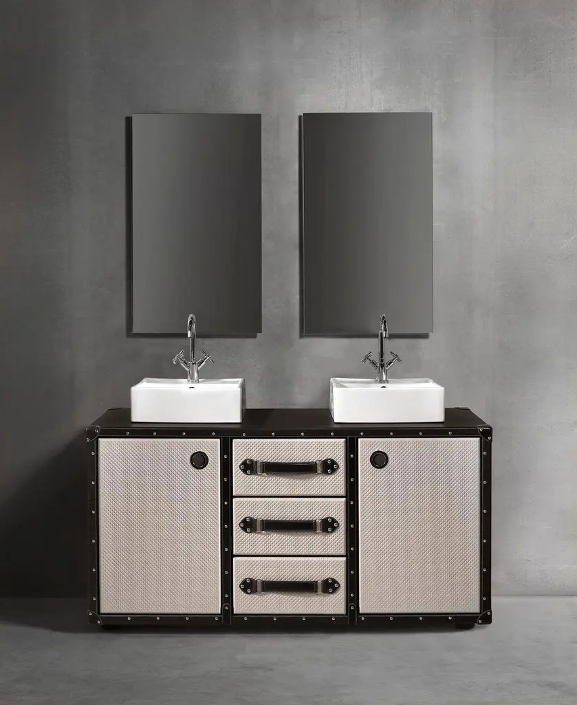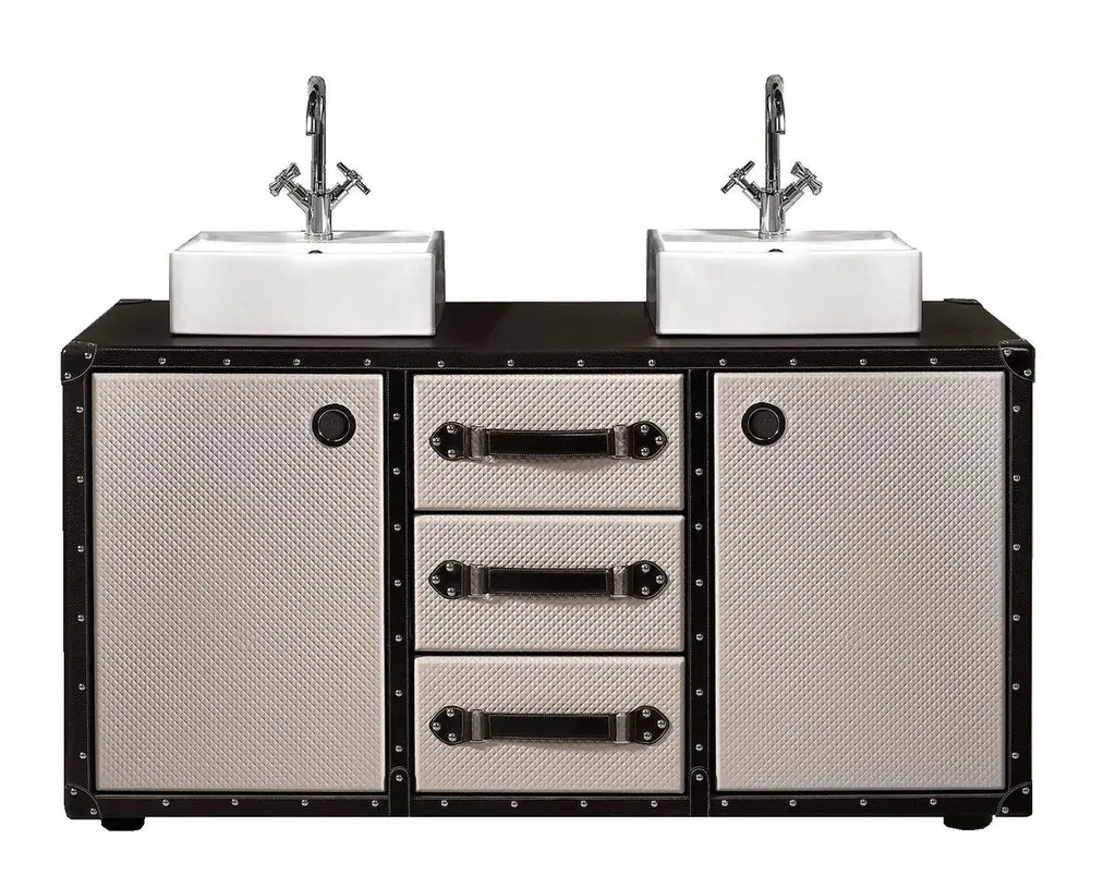 There are projects that demands high levels of design and finishes on all the decorative or functional elements that will be used.This bathroom vanity is handcrafted as a unique and unrepeatable unit by skilled Artisans using top quality materials and a care until perfection throughout the entire manufacturing process.The elegant style of it's clean lines, soft and warm tones and the materials used guarantee the unique appearance of this piece. In this collection the leather take on a special role.This Luxury bathroom vanity designed as part of Luxury Bath creations is suitable for a high end master bathroom project. The structure of the vanity is made of MDF. The interior made of natural wood veneer ebony finish. Entire furniture upholstered with engrave waterproof leather.It is suitable for a custom project using 50 leather colors available, even you can to combine drawers, doors and structure separately.Three functional drawers full extension with soft close and two soft close doors. Square vessel sinks are not included. Mirror and faucets not included in price.The Traveler double bathroom cabinet is a functional piece with great storage capacity. Composed of two doors with nickel and engraved leather inlaid handles, and three drawers with handles reminiscent of suitcases. Extremely versatile for both classic and contemporary bathrooms.Technical Characteristics: Countertop: Hydro-repellent leather.Structure: Bleached laminated with engraved leather.Doors and drawer fronts: Bilaminate with engraved leather.Please contact us if you have any questions about customization and pricing. We will be glad to check with the factory’s technical team if sizes, finishes, and colors can be customized. We do our best to expedite production and to ship and deliver product within the listed lead time, however current lead times might be longer due to global shipping backlog and delays. These delays are out of our control and cannot be a reason to cancel an order.