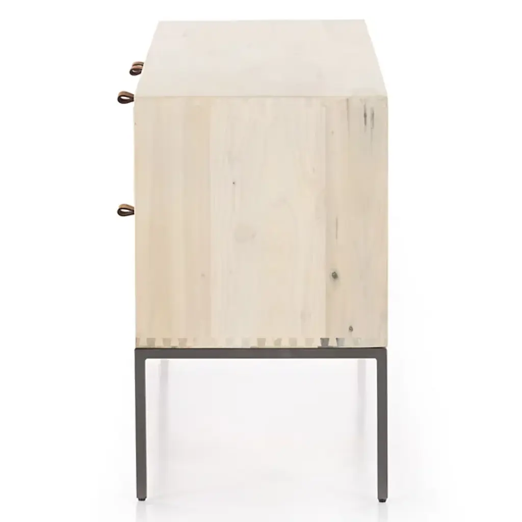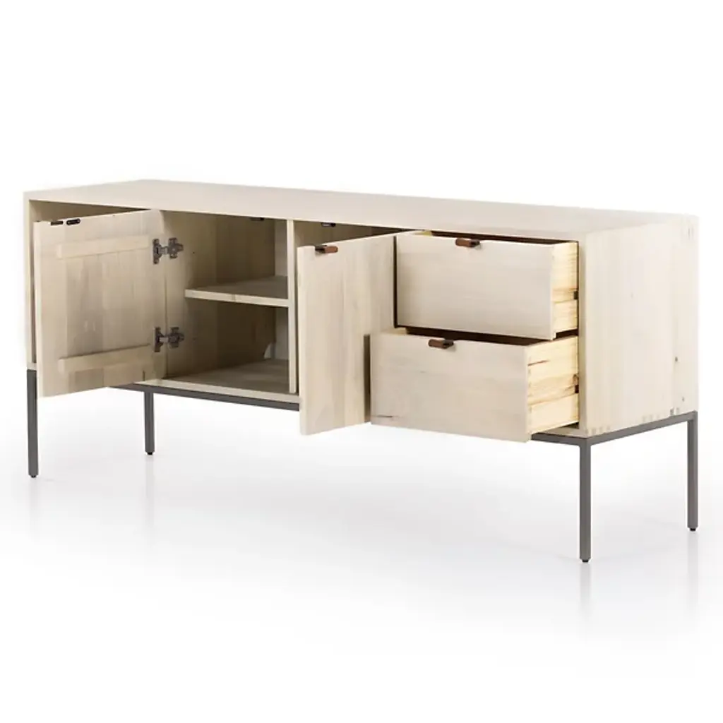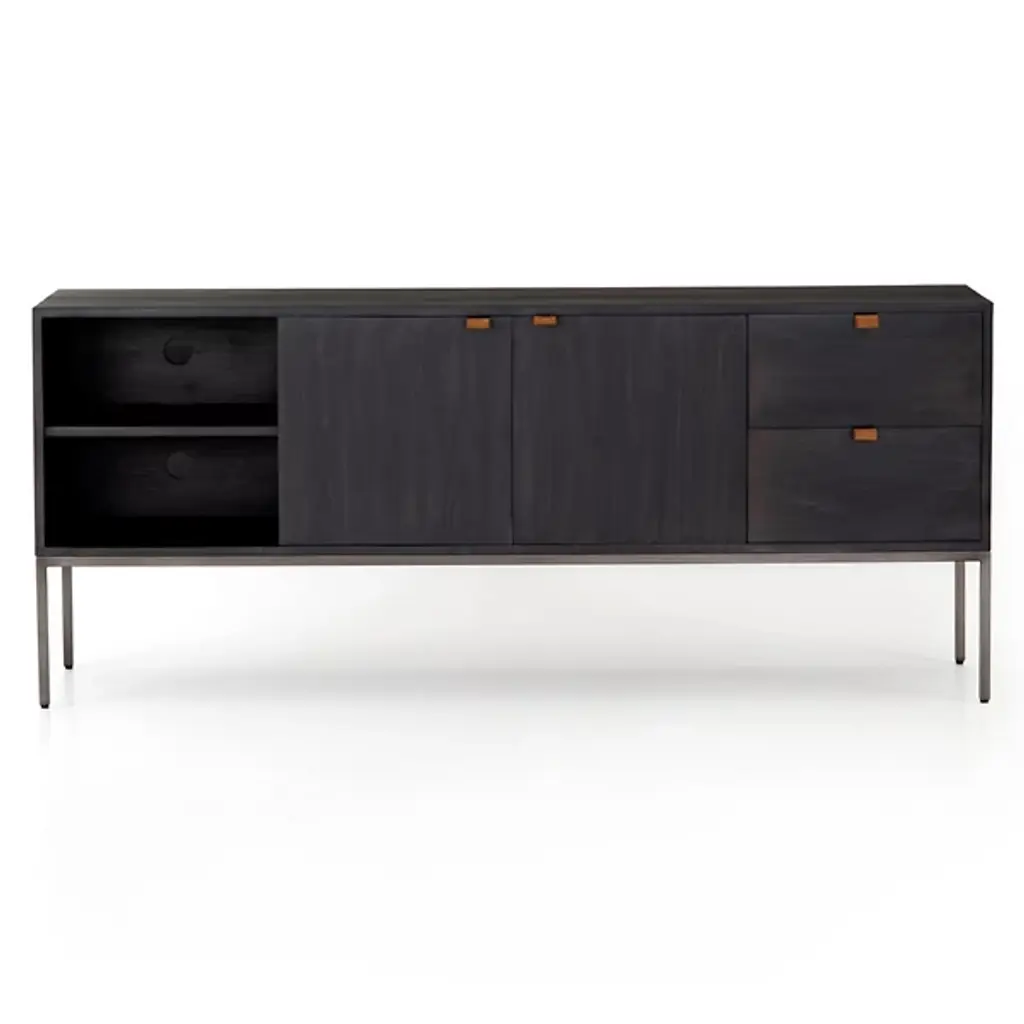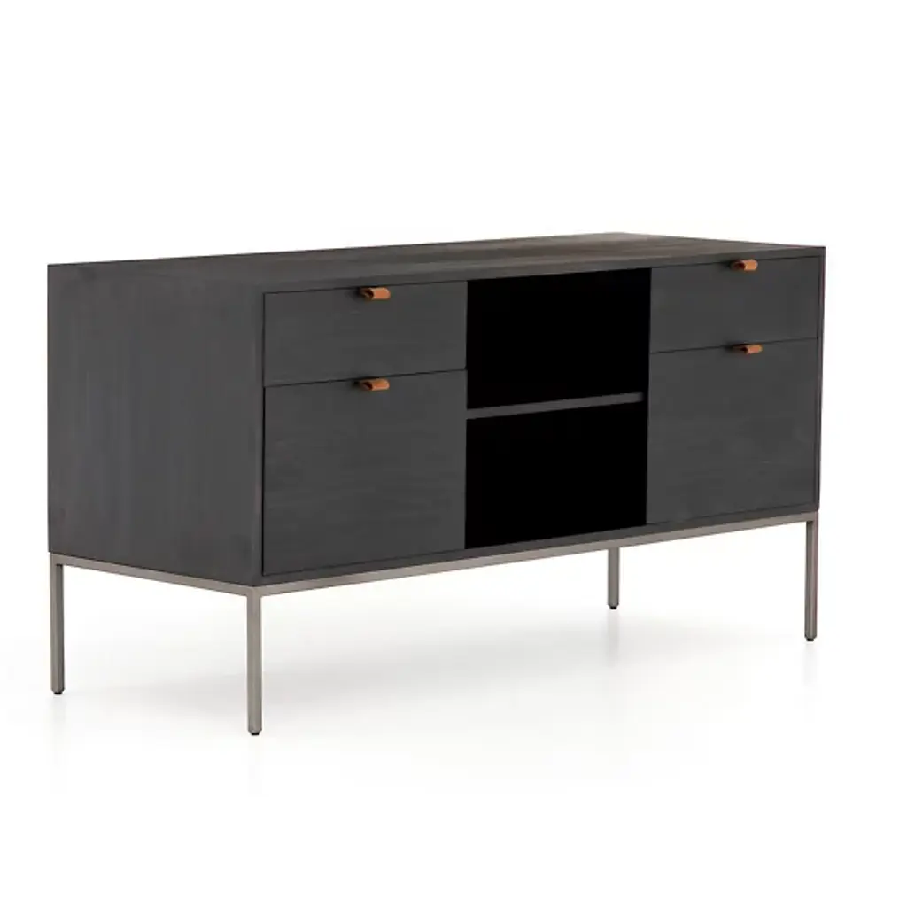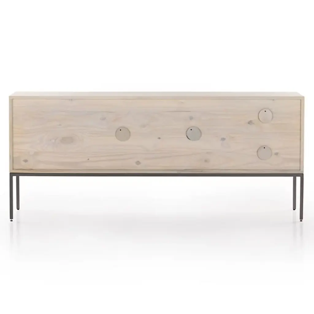 The Trey Media Cabinet from Four Hands draws inspiration from mid-century design and offers solid poplar construction. This console provides ample storage, spacious cabinetry, open shelving, and dual drawers. Top-grain leather pulls, secured by metal elements, add textural contrast, while cord management cutouts ensure a tidy setup. Complete with adjustable and fixed shelves, this piece matches rustic modern and classic traditional elements, making it a versatile addition to any living space.
