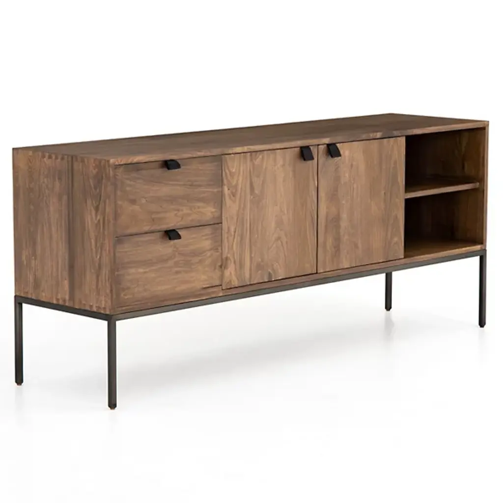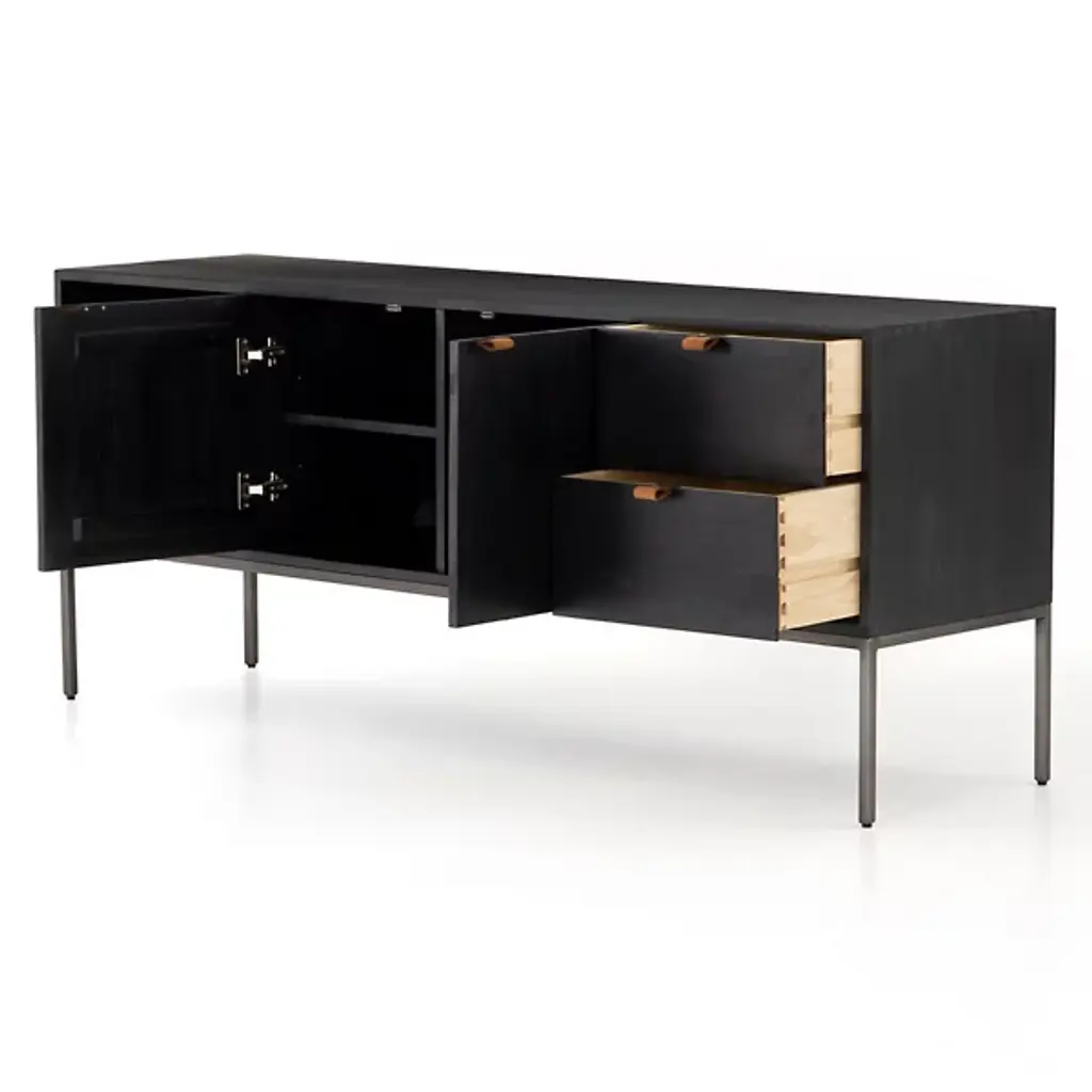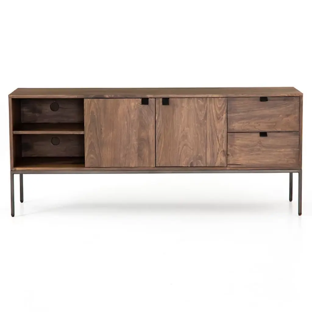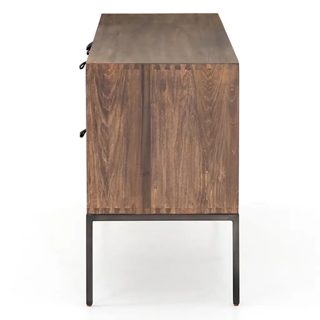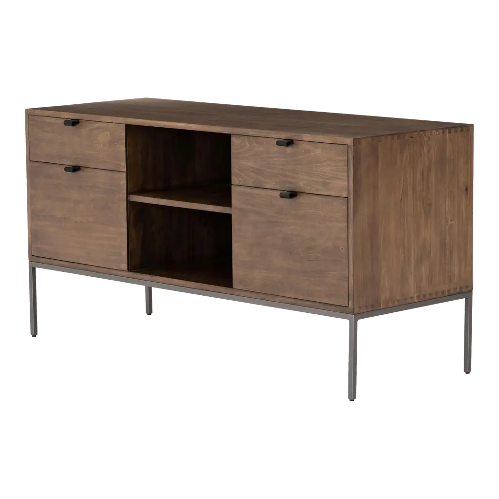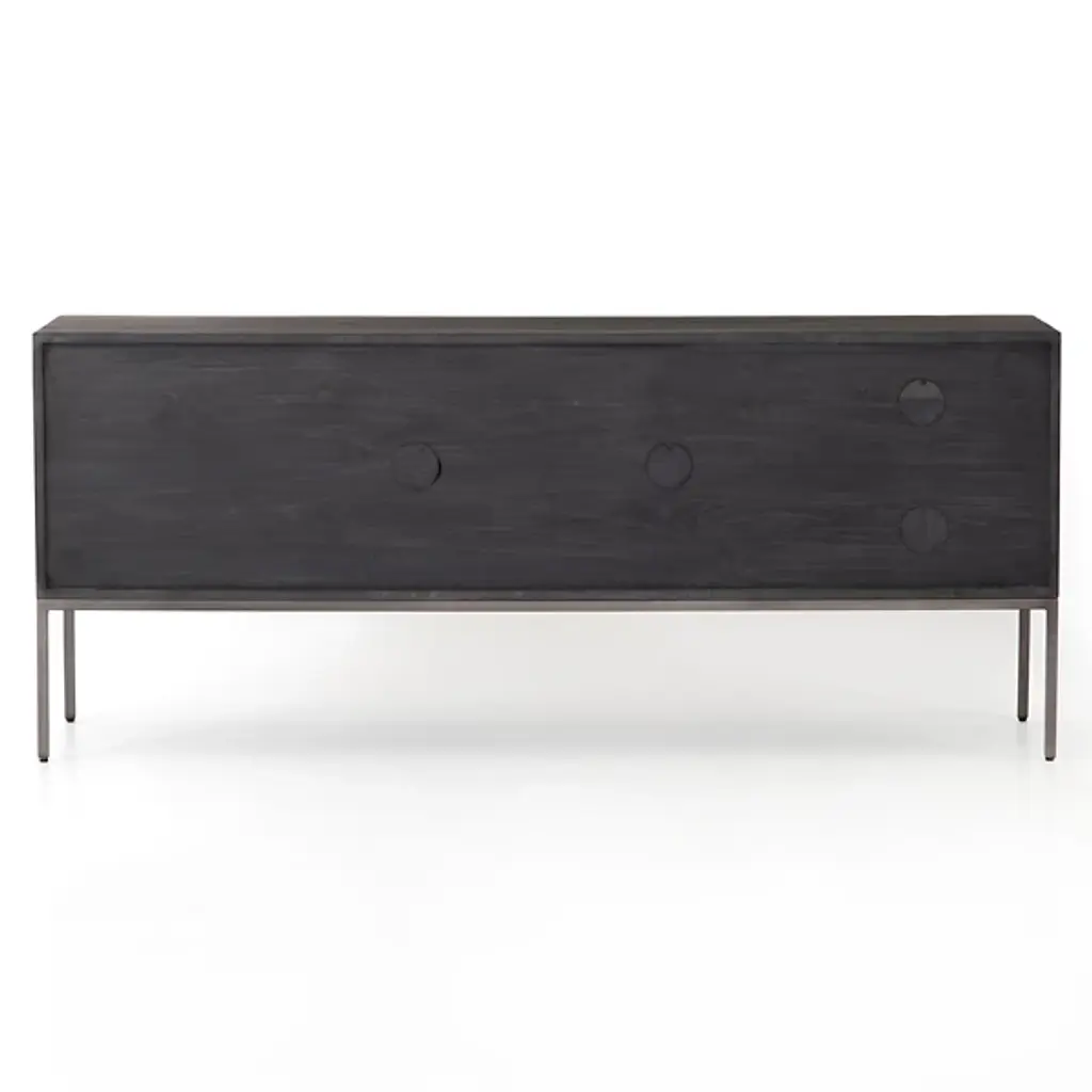 The Trey Media Cabinet from Four Hands draws inspiration from mid-century design and offers solid poplar construction. This console provides ample storage, spacious cabinetry, open shelving, and dual drawers. Top-grain leather pulls, secured by metal elements, add textural contrast, while cord management cutouts ensure a tidy setup. Complete with adjustable and fixed shelves, this piece matches rustic modern and classic traditional elements, making it a versatile addition to any living space.