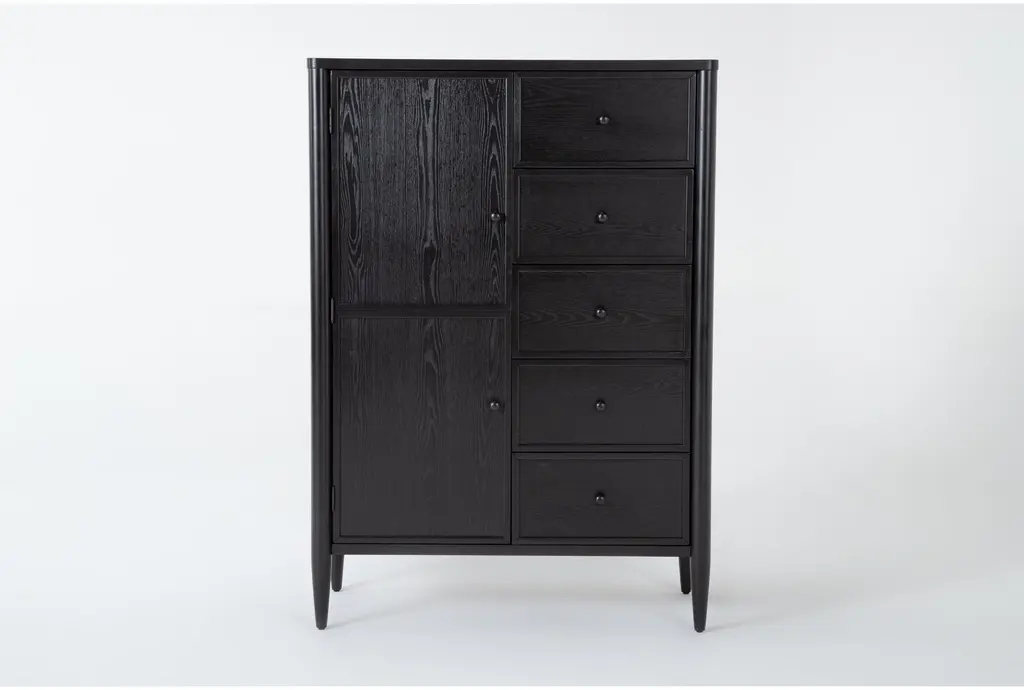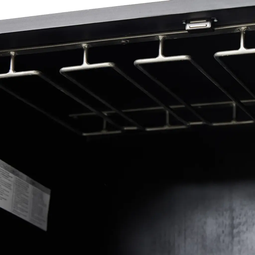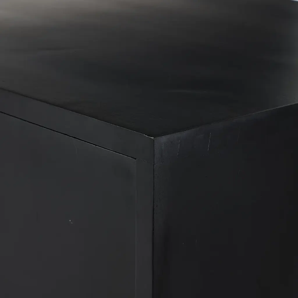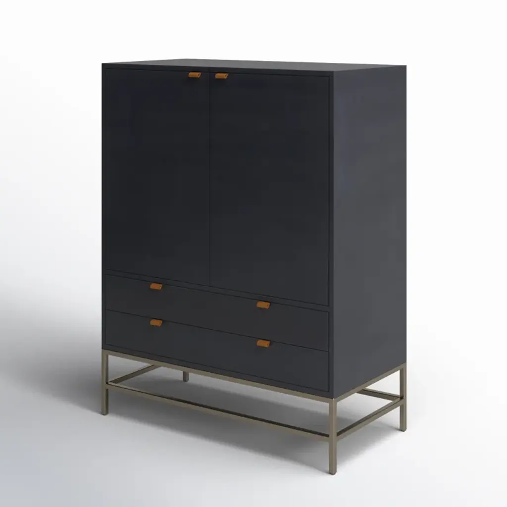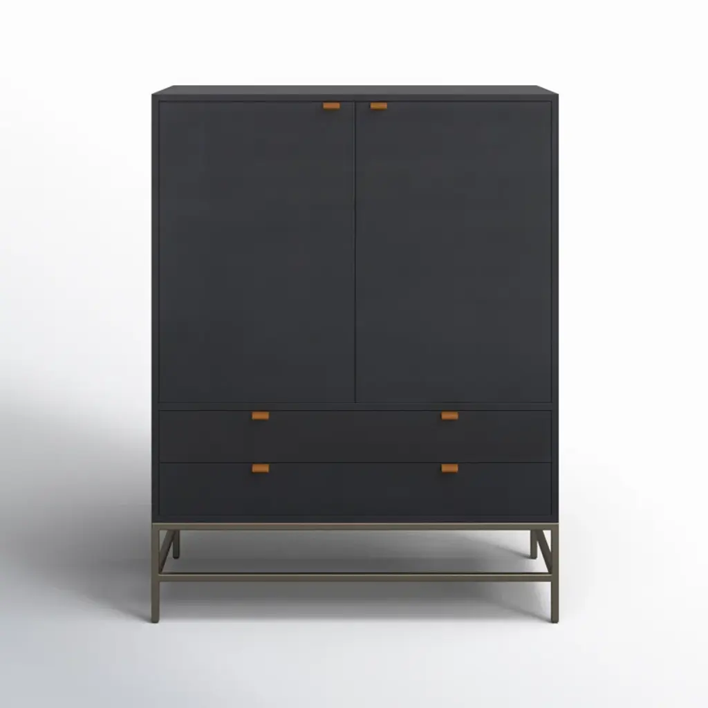 Asymmetry creates a dynamic, modern aesthetic to this bar cabinet. Impulses from mid-century are reinvented with a mix of warm woods and hard iron.