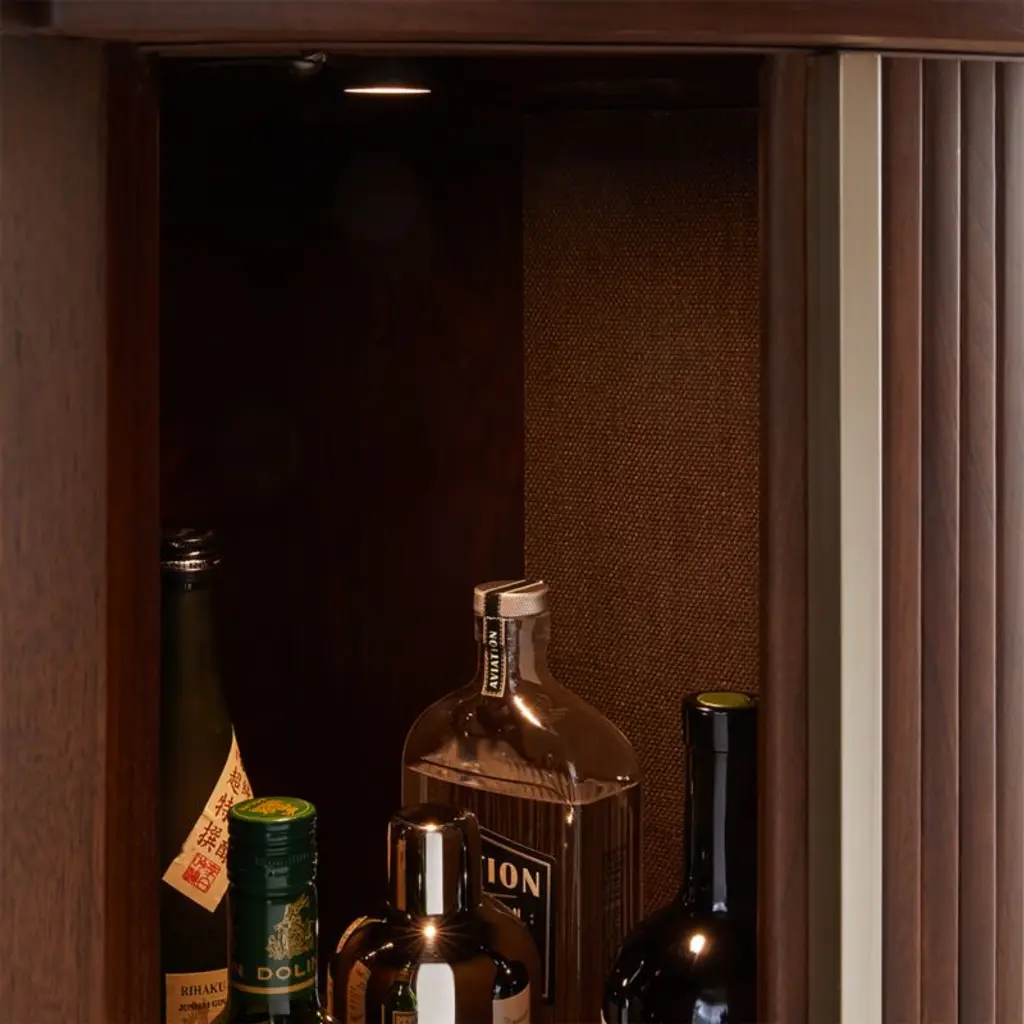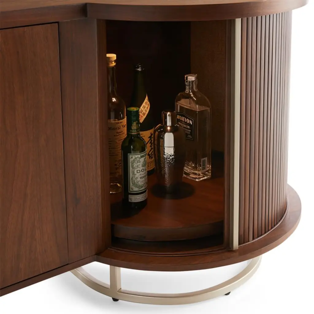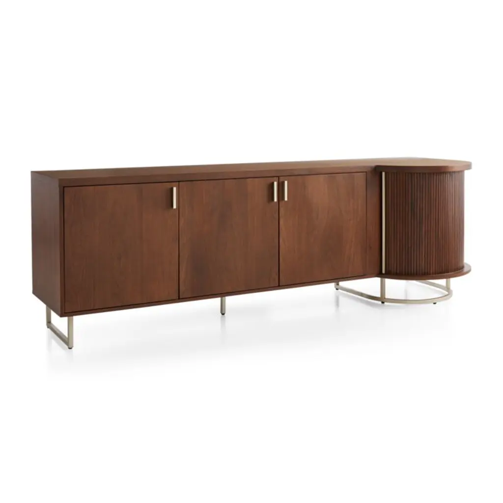 A clear winner for its mid-century vibe and swanky silhouette, our Trifecta cabinet multitasks in the living room or den as a media cabinet and bar. This one-of-a-kind cabinet makes the most of beautifully grained solid walnut and walnut veneer in a modern-meets-retro design that sweeps flat-front doors into a round cabinet outfitted with a sliding tambour door. Interior lighting and a lazy Susan make a dramatic display of bottles and barware, while adjustable shelves and cord cutouts behind the cabinet doors accommodate media components.