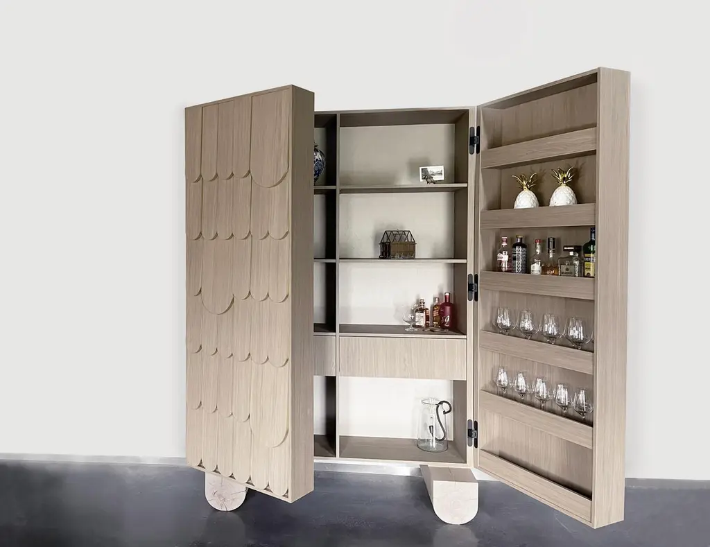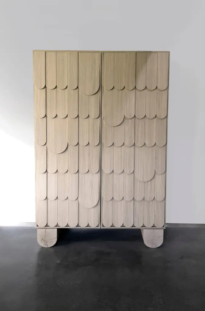 Trunk Cabinet by Atelier Ruben Van MegenDimensions: W 158 x D 64 x H 235 cmMaterials: Oak (base), MDF, HPL, Brass.Ruben van Megen (1984) graduated from the Design Academy in Eindhoven in 2012, with the focus ‘public space’. Before that, he studied in Rotterdam, at het HMC College. His passion for design and fascination for developing new materials are a guarantee for high profile and unique work. Hence, starting his own design studio, Atelier Ruben van Megen, was self evident. In 2015, the first furniture collection “Uno” was born. In 2016, the second furniture collection, Café 6116, followed. Acknowledgment of the ‘Atelier Ruben van Megen-style’ became reality when the dining table from the Café 6116 was rewarded with a Red Dot Award; one of the most prestigious international labels for high quality design. The design has also won an A’ Design Award and Talente Award. Café 6116 is unique because it is inspired by re-use of materials and precious memories of the former owners. On top of that: the contemporary series is just stunningly executed. In 2018, Atelier Ruben van Megen launched the chairs ‘Antimacassar III’ and ‘The Cord Connection’ and in 2020, ‘Sandcastles’ followed; a range of designs made out of sand. The work of Atelier Ruben van Megen is often international presented. For example, during the Salone del Mobile in Milano, New York Design Week (NYCxDesign), the London Design Festival and Dutch Design Week. The pieces are included in the collections of several international galleries and are regularly displayed in various museums. The designs are carefully produced in our own workshop, only the best materials are used. For specialized techniques, we collaborate with companies in our own region. Occasionally, we lecture about designing, entrepreneurship, and international business in the creative branch.