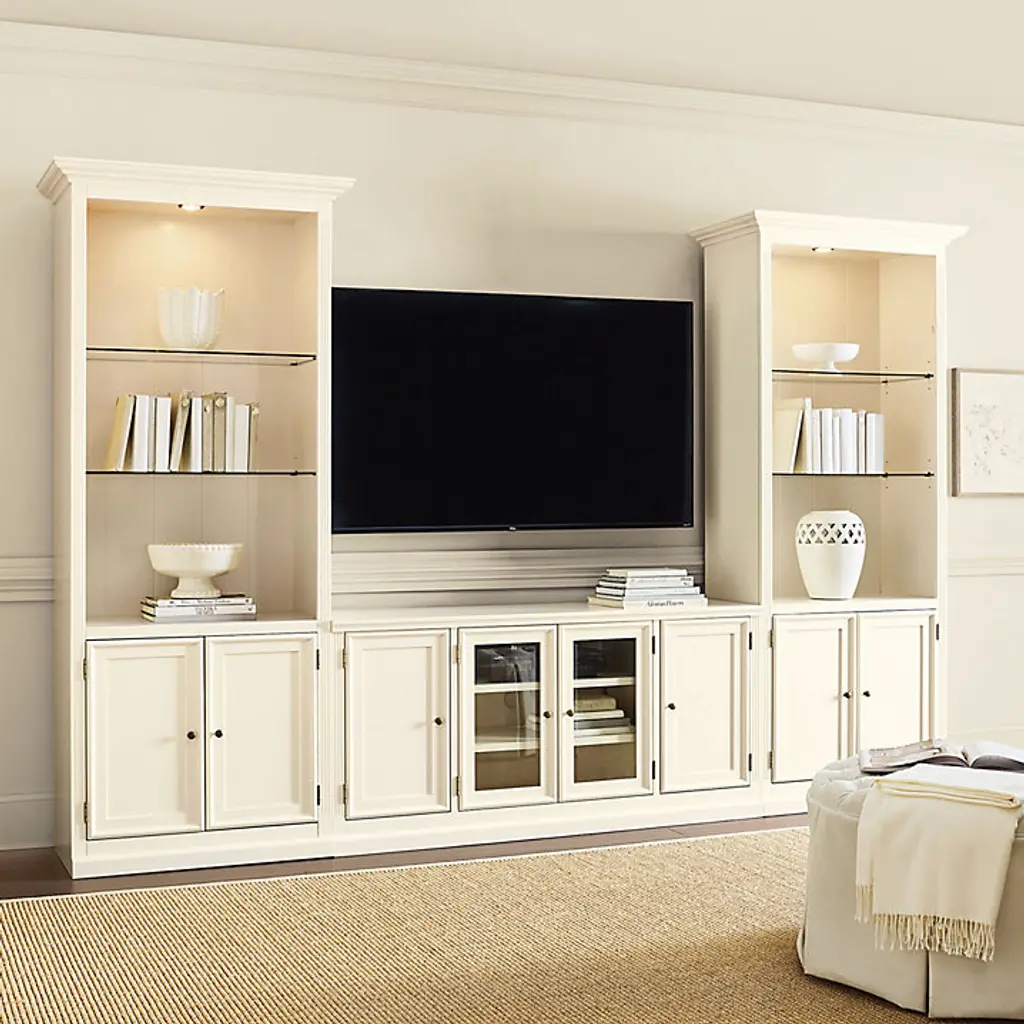 Our Tuscan home office furniture blends modern versatility with the classic looks of a custom built-in. Each piece in the collection works with every other, so you can design a workstation or storage solution to fit your space and needs perfectly. Create an integrated home entertainment center with the Tuscan 3-Piece Large Media Group. The Console's center cabinet has beveled glass door fronts, so remotes work even when doors are closed. Outside cabinets have solid doors for hidden storage. Bookcases feature two adjustable glass shelves each with recessed lights above. Light adjusts to three levels with a simple touch. Each cabinet has one adjustable shelf. Cord management throughout makes component hook-up neat and easy. Tuscan 3-Piece Large Media Group features: