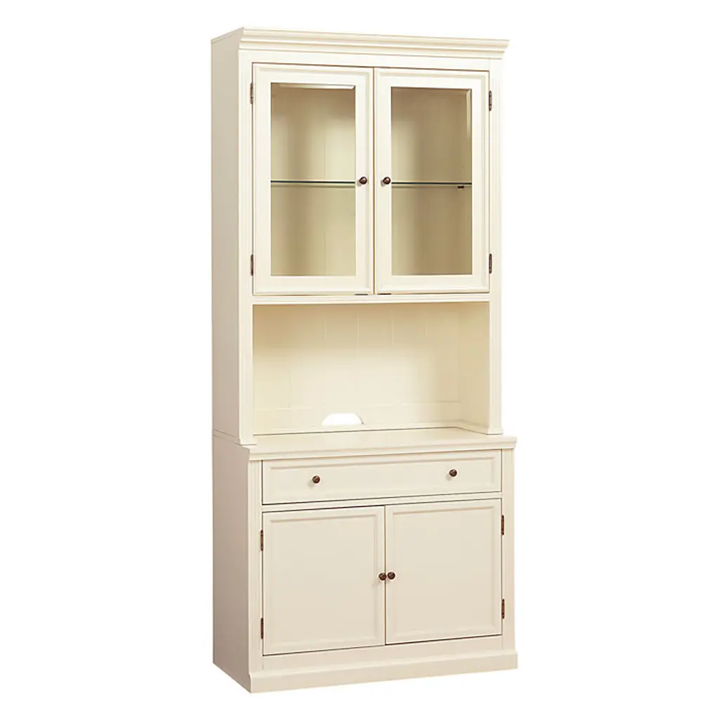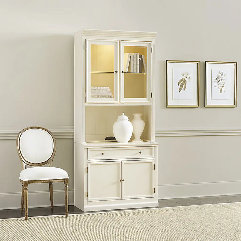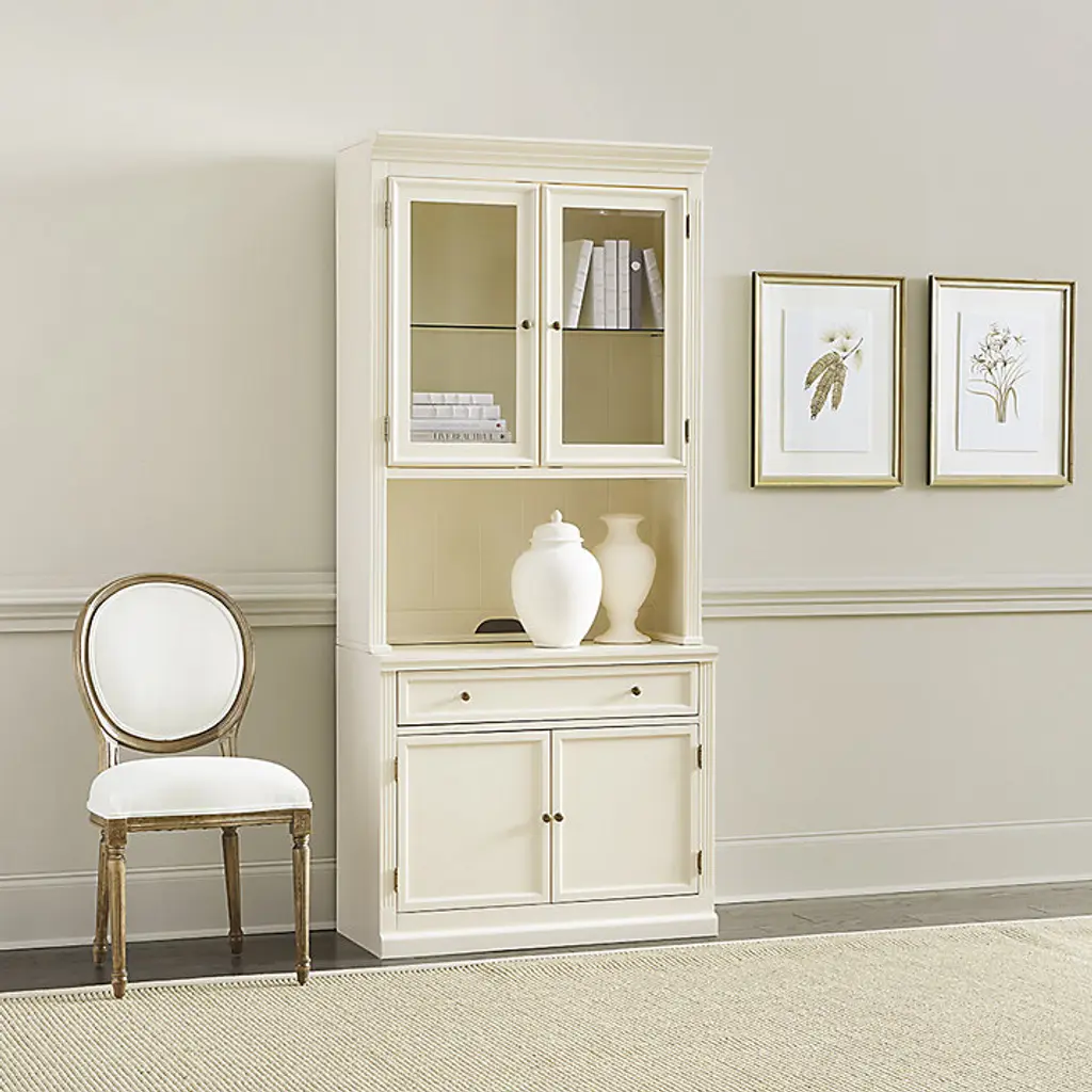 Our modular Tuscan home office furniture blends modern versatility with the classic looks of a custom built-in. Each piece in the collection works with every other, so you can design a storage solution or workstation to fit your space and needs perfectly. The Tuscan Cabinet & Hutch with Doors offers a balanced combination of display and storage in the home office, family room, bedroom or kitchen. Behind its double beveled glass doors, the Hutch features one adjustable glass shelf for a light open look. Cable management below keeps everything neat and clutter-free. Paneled interior gives this versatile piece a finely crafted look that works with virtually any decor. Double cabinet doors conceal one adjustable shelf for stacking and storing. A single drawer above holds office supplies and everyday essentials. Stand multiple Cabinets & Hutches side-by-side to make a custom-length hutch/credenza with as much storage and display as you need. Flush sides make it seamless and easy. Tuscan Cabinet & Hutch with Doors features: