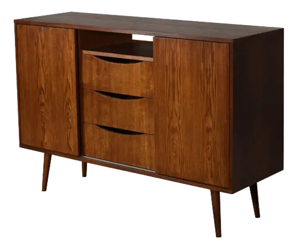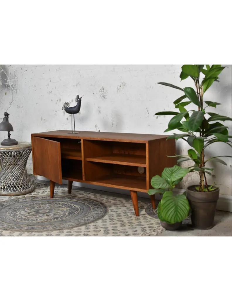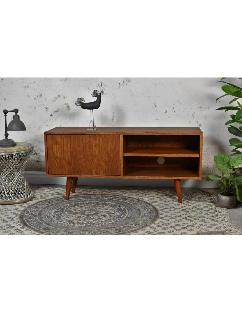 TV Mini Small Cabinet by PastformDimensions: D 35 x W 100 x H 55 cm.Materials: Stained and varnished wood.Available in different wood color finishes: Whiskey, Rum, BPA, Nobel, Brandy, Schwarz, Nevada, Honey, Dark Brown and Natura. Available in three different widths: 100/120/140 cm. Please contact us.The furniture is entirely made of wood covered with oak veneer. Our furniture is made of only natural materials, so individual models may differ in the arrangement of grain and color. TV Mini Brown Chest of Drawers is finished with stain and varnish.Rooted in a good traditionThe Pastform Furniture studio dates back to the 1990s. Having in mind the idea of a traditional family company, Dawid Gełeta established a carpenter’s shop in 1997. The company specializes in the manual production of utility furniture. Times have changed and with them, fashion has changed. In 2016 we decided to change the direction, following the growing demand for vintage furniture.My name is Mateusz Gełeta, I am the son of the carpenter who founded the company. From an early age, I have watched my dad’s work. He put his whole heart into creating furniture, polishing every detail with his strong hands and making sure that nothing escaped our attention before sending the product to the customer. He made sure that every piece of furniture was perfect and refined. We remain true to these principles.Following the blow, I decided to create a harmonious combination of modern quality with the classic style of the 1960s. This is why I designed and created a unique collection of wonderful furniture, which, in addition to its well-thought-out functionality, also creates a perfect design and composes original arrangements.The golden age of interior designIn the 1960s interiors used to take on a very characteristic touch. All over the world, this style was called a mid-century modern, locally it was simply – retro furniture. Simple, elegant minimalistic form, without unnecessary decorations and splendor. Decorating with the idea of an uncomplicated composition, it allows for an undisturbed selection of the arrangement accessories and emphasizes a high level of functional comfort. One might say – a perfect piece of furniture. Comfortable, hiding surprisingly many items despite quite neat dimensions, made of noble species of wood and created by hand, with a focus on carefully refined details. No wonder its popularity is growing so much.Unique, refined, with a soulEach piece of the Pastform collection represents a unique style. Thoughtful concept of usable comfort, refined details, carefully selected raw materials, and proven accessories. We use only high-quality boards which we veneer with oak, American walnut, and other durable wood species. They are carefully oiled with the best, hard, ecological oil waxes, giving the furniture its final shape. This technology brings out the natural beauty of wood, exposes the grain and unique design of each piece, highlights the beautiful color, and allows to achieve timeless durability.This is how unique, thoughtful, and refined furniture with a soul is created.Thinking about futureWe are trying to positively create the world of which we are a part, contributing to a better tomorrow. We cooperate with local suppliers, support small companies and production plants, care for ecology, and respect the needs of the land. We always strive to establish long-lasting, based-on-trust relationships with customers and contractors.Flexible, with openness and heart on handWe sincerely like what we do. Playing with the shape, structure, and texture of wood is fascinating. Creating new arrangements and coming up with innovations that will meet your expectations. We are proud of our products and we are happy to present you with our collection of refined furniture.All our vintage furniture can be made on request – fulfilling the boldest dreams and fantasies. See our offer and if you want to know more, feel free to contact us. We are waiting for you!