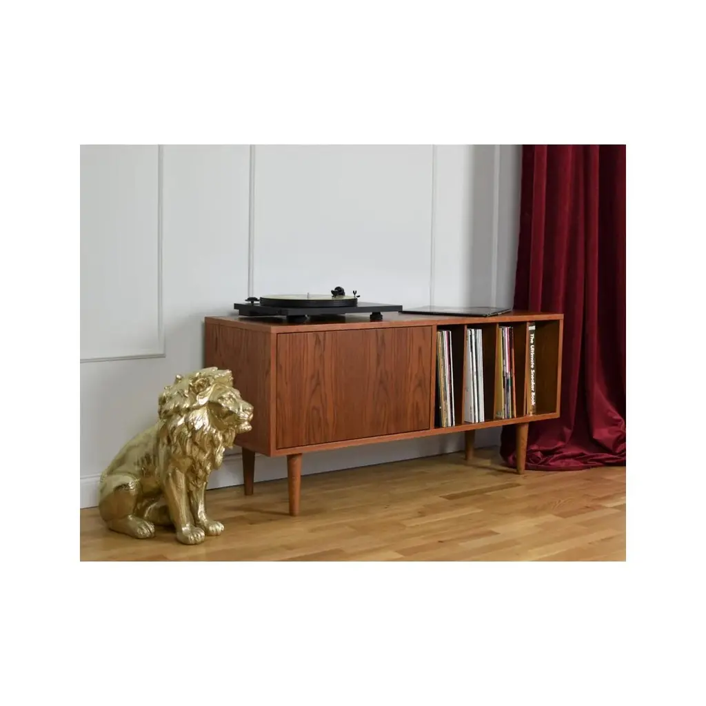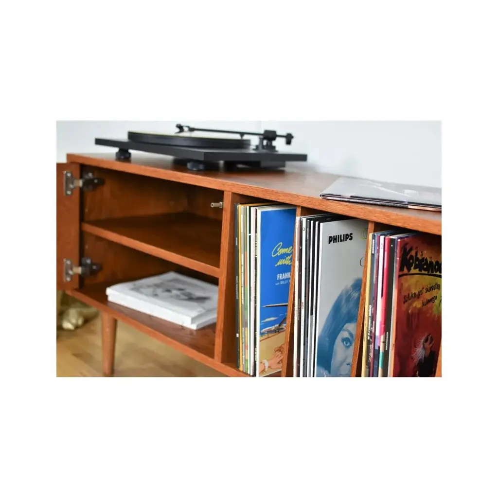 TV Mini Vinyl Small Cabinet by PastformDimensions: D 35 x W 90 x H 57 cm.Materials: Stained and varnished wood.Available in different wood color finishes: Whiskey, Rum, BPA, Nobel, Brandy, Schwarz, Natura, Honey, Dark Brown, Nevada, and Cognac. Available in four different widths: 90/100/120/140 cm. Please contact us.TV Mini Brown High Chest of Drawers is perfect for small apartments where every square meter is as precious as gold. Despite its relatively small dimensions, it can hold a lot. Although it is a typical TV cabinet with a wide top, shelves, and cabinet closed with a door, it is not limited only to acting as a “stand” for audio-video equipment. It will also be perfect, for storing vinyl records.We love working with wood and we cannot imagine that our furniture could be made of any other material. This material is not only beautiful and noble but also solid, which is especially important for furniture. The TV Mini Vinyl chest of drawers in vintage style meets the highest standards of both aesthetics and functionality.The furniture is entirely made of wood covered with oak veneer. Our furniture is made of only natural materials, so individual models may differ in the arrangement of grain and color. TV Mini Vinyl is finished with stain and varnish.Rooted in a good traditionThe Pastform Furniture studio dates back to the 1990s. Having in mind the idea of a traditional family company, Dawid Gełeta established a carpenter’s shop in 1997. The company specializes in the manual production of utility furniture. Times have changed and with them, fashion has changed. In 2016 we decided to change the direction, following the growing demand for vintage furniture.My name is Mateusz Gełeta, I am the son of the carpenter who founded the company. From an early age, I have watched my dad’s work. He put his whole heart into creating furniture, polishing every detail with his strong hands and making sure that nothing escaped our attention before sending the product to the customer. He made sure that every piece of furniture was perfect and refined. We remain true to these principles.Following the blow, I decided to create a harmonious combination of modern quality with the classic style of the 1960s. This is why I designed and created a unique collection of wonderful furniture, which, in addition to its well-thought-out functionality, also creates a perfect design and composes original arrangements.The golden age of interior designIn the 1960s interiors used to take on a very characteristic touch. All over the world, this style was called a mid-century modern, locally it was simply – retro furniture. Simple, elegant minimalistic form, without unnecessary decorations and splendor. Decorating with the idea of an uncomplicated composition, it allows for an undisturbed selection of the arrangement accessories and emphasizes a high level of functional comfort. One might say – a perfect piece of furniture. Comfortable, hiding surprisingly many items despite quite neat dimensions, made of noble species of wood and created by hand, with a focus on carefully refined details. No wonder its popularity is growing so much.Unique, refined, with a soulEach piece of the Pastform collection represents a unique style. Thoughtful concept of usable comfort, refined details, carefully selected raw materials, and proven accessories. We use only high-quality boards which we veneer with oak, American walnut, and other durable wood species. They are carefully oiled with the best, hard, ecological oil waxes, giving the furniture its final shape. This technology brings out the natural beauty of wood, exposes the grain and unique design of each piece, highlights the beautiful color, and allows to achieve timeless durability.This is how unique, thoughtful, and refined furniture with a soul is created.Thinking about futureWe are trying to positively create the world of which we are a part, contributing to a better tomorrow. We cooperate with local suppliers, support small companies and production plants, care for ecology, and respect the needs of the land. We always strive to establish long-lasting, based-on-trust relationships with customers and contractors.Flexible, with openness and heart on handWe sincerely like what we do. Playing with the shape, structure, and texture of wood is fascinating. Creating new arrangements and coming up with innovations that will meet your expectations. We are proud of our products and we are happy to present you with our collection of refined furniture.All our vintage furniture can be made on request – fulfilling the boldest dreams and fantasies. See our offer and if you want to know more, feel free to contact us. We are waiting for you!