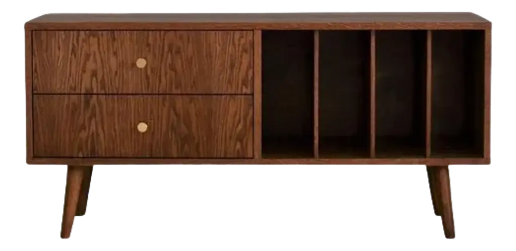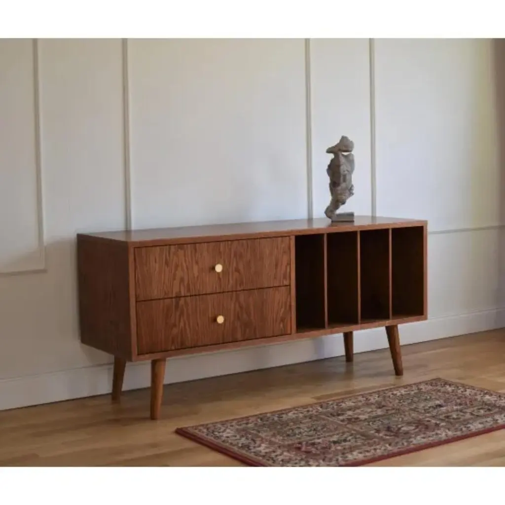 TV Mini Vinyl Small Cabinet With Drawers by PastformDimensions: D 35 x W 100 x H 57 cm.Materials: Stained and varnished wood.Available in different wood color finishes: Whiskey, Rum, BPA, Nobel, Brandy, Schwarz, Natura, Honey, Dark Brown, Nevada, and Cognac. Available in four different widths: 90/100/120/140/150 cm. Please contact us.TV Mini Brown High Chest of Drawers is perfect for small apartments where every square meter is as precious as gold. Despite its relatively small dimensions, it can hold a lot. Although it is a typical TV cabinet with a wide top, shelves, and cabinet closed with a door, it is not limited only to acting as a “stand” for audio-video equipment. It will also be perfect, for storing vinyl records.We love working with wood and we cannot imagine that our furniture could be made of any other material. This material is not only beautiful and noble but also solid, which is especially important for furniture. The TV Mini Vinyl chest of drawers in vintage style meets the highest standards of both aesthetics and functionality.The furniture is entirely made of wood covered with oak veneer. Our furniture is made of only natural materials, so individual models may differ in the arrangement of grain and color. TV Mini Vinyl is finished with stain and varnish.Rooted in a good traditionThe Pastform Furniture studio dates back to the 1990s. Having in mind the idea of a traditional family company, Dawid Gełeta established a carpenter’s shop in 1997. The company specializes in the manual production of utility furniture. Times have changed and with them, fashion has changed. In 2016 we decided to change the direction, following the growing demand for vintage furniture.My name is Mateusz Gełeta, I am the son of the carpenter who founded the company. From an early age, I have watched my dad’s work. He put his whole heart into creating furniture, polishing every detail with his strong hands and making sure that nothing escaped our attention before sending the product to the customer. He made sure that every piece of furniture was perfect and refined. We remain true to these principles.Following the blow, I decided to create a harmonious combination of modern quality with the classic style of the 1960s. This is why I designed and created a unique collection of wonderful furniture, which, in addition to its well-thought-out functionality, also creates a perfect design and composes original arrangements.The golden age of interior designIn the 1960s interiors used to take on a very characteristic touch. All over the world, this style was called a mid-century modern, locally it was simply – retro furniture. Simple, elegant minimalistic form, without unnecessary decorations and splendor. Decorating with the idea of an uncomplicated composition, it allows for an undisturbed selection of the arrangement accessories and emphasizes a high level of functional comfort. One might say – a perfect piece of furniture. Comfortable, hiding surprisingly many items despite quite neat dimensions, made of noble species of wood and created by hand, with a focus on carefully refined details. No wonder its popularity is growing so much.Unique, refined, with a soulEach piece of the Pastform collection represents a unique style. Thoughtful concept of usable comfort, refined details, carefully selected raw materials, and proven accessories. We use only high-quality boards which we veneer with oak, American walnut, and other durable wood species. They are carefully oiled with the best, hard, ecological oil waxes, giving the furniture its final shape. This technology brings out the natural beauty of wood, exposes the grain and unique design of each piece, highlights the beautiful color, and allows to achieve timeless durability.This is how unique, thoughtful, and refined furniture with a soul is created.Thinking about futureWe are trying to positively create the world of which we are a part, contributing to a better tomorrow. We cooperate with local suppliers, support small companies and production plants, care for ecology, and respect the needs of the land. We always strive to establish long-lasting, based-on-trust relationships with customers and contractors.Flexible, with openness and heart on handWe sincerely like what we do. Playing with the shape, structure, and texture of wood is fascinating. Creating new arrangements and coming up with innovations that will meet your expectations. We are proud of our products and we are happy to present you with our collection of refined furniture.All our vintage furniture can be made on request – fulfilling the boldest dreams and fantasies. See our offer and if you want to know more, feel free to contact us. We are waiting for you!