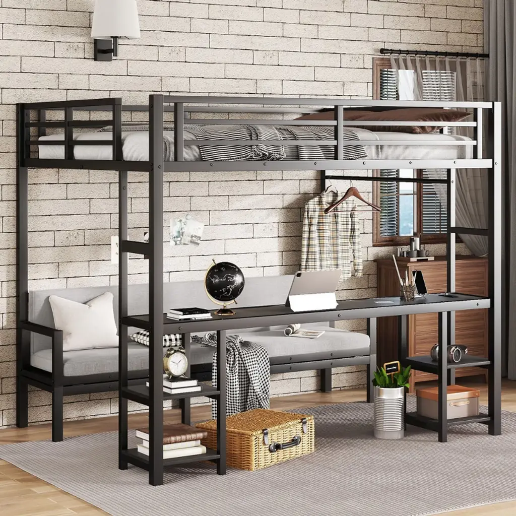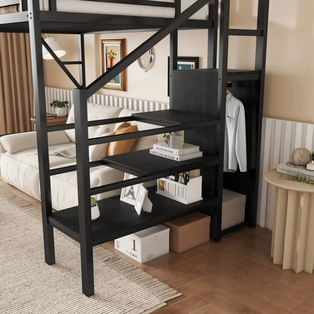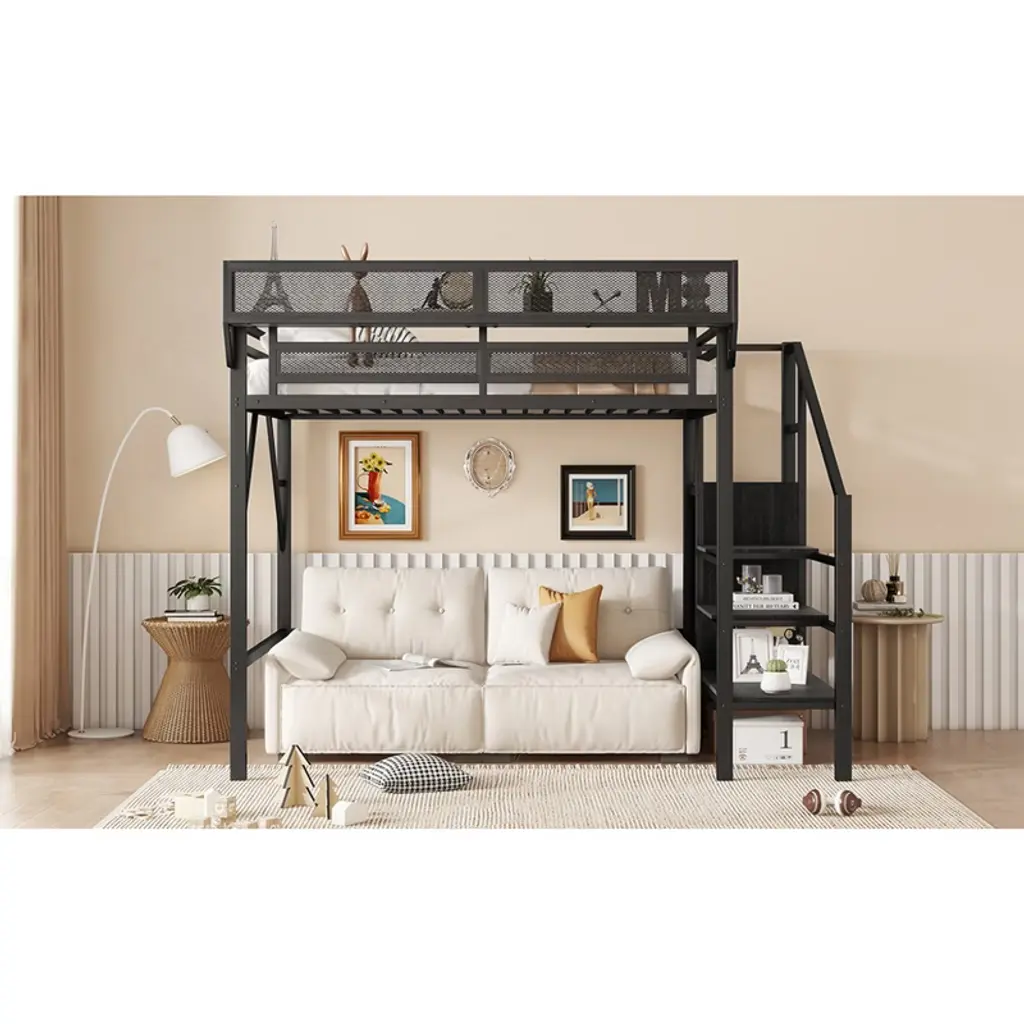 Product Features Twin Loft Bed with Storage Shelves for Upper: The twin metal loft bed is equipped with a storage shelf next to the upper bed, providing extra storage space. This shelf is ideal for keeping books, gadgets, or small items within easy reach. It has a mesh surround to prevent items from falling, adding functionality without compromising space.Metal Twin Loft Bed with Staircase: The metal twin size loft bed comes with a staircase that includes built-in storage compartments—convenient for storing items like shoes, toys, or blankets. The steps ensure safe and easy access to the upper bed, boosting both practicality and safety. The stairs can be installed on either the right or left side to fit your room layout.Under Space of Metal Loft Bed: The area under the twin loft bed offers 54.3 inches of height, creating extra space for multi-functional use. You can place storage cabinets, a small sofa, or a desk underneath—maximizing the use of limited space and creating a versatile living area.Metal Loft Bed with Wardrobe: The staircase integrates a built-in wardrobe function, providing additional storage for clothes and accessories. This clever design adds more functionality to the metal twin loft bed, making it a perfect solution for small bedrooms.Durable and Sturdy Construction: Crafted from high-quality metal, this twin size loft bed is durable and sturdy. The metal material ensures long-lasting use and stability, while also boasting a sleek, modern appearance that fits well in any bedroom. Weight capacity is specified in the product details below. Descriptions This twin size loft bed features built-in storage shelves next to the upper bed, plus a staircase and wardrobe. Its sturdy metal design ensures stability and durability, making your bedtime routine more organized and efficient. Specification Description & Dimensions Material: MetalOverall Dimensions: 94.3” x 47.8” x 73.4” (L x W x H)Size: Twin SizeHeight of Upper Guardrail: 11.3"Clearance Under the Bed: 54.3"Recommended Mattress Thickness: 6” (not included)Weight Capacity: 250LBSNet Weight: 125.4 lbsGross Weight: 136.84 lbsBox Spring Required: No