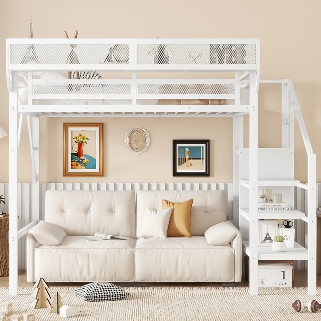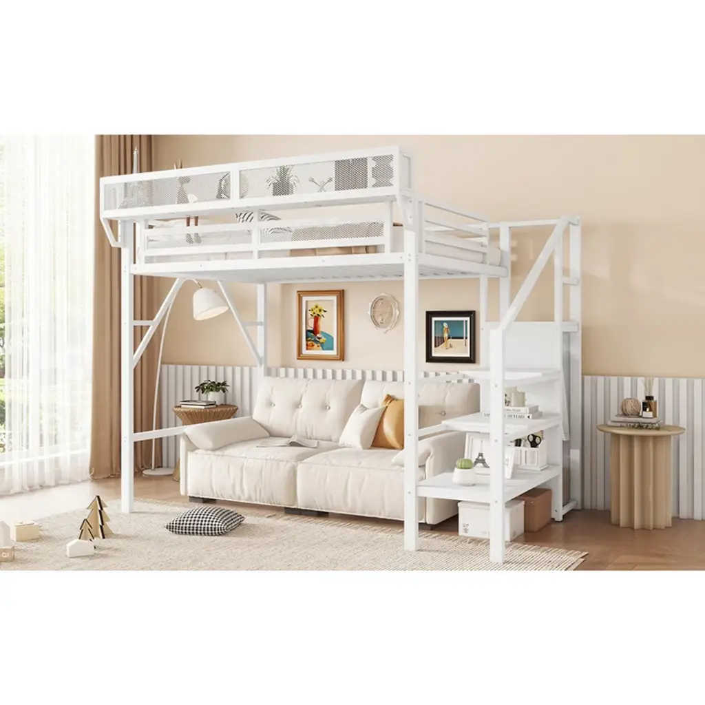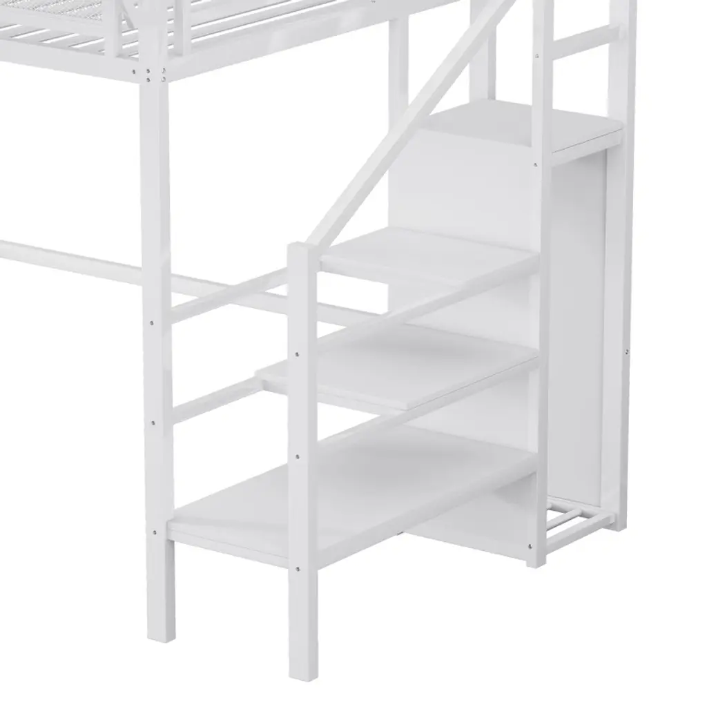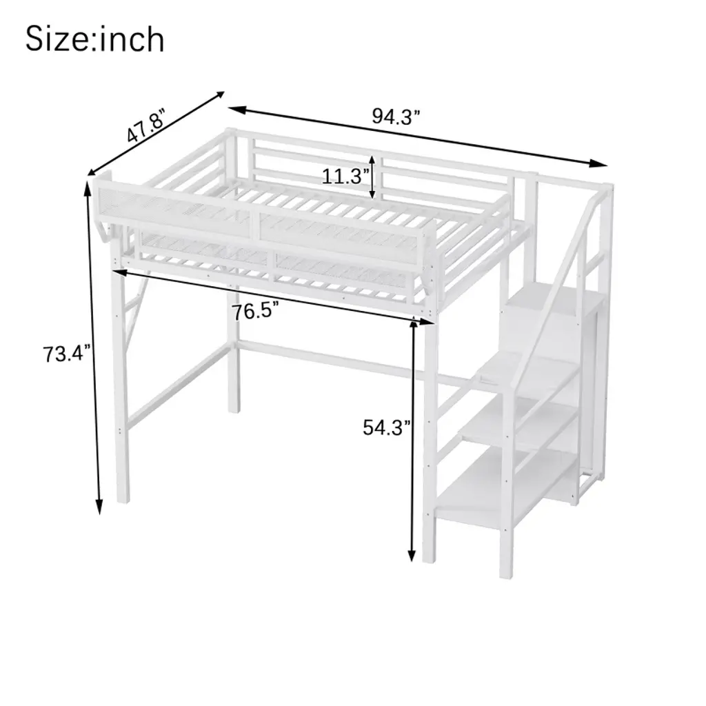 Product Features Twin Loft Bed with Storage Shelves for Upper: The twin metal loft bed is equipped with a storage shelf next to the upper bed, providing extra storage space. This shelf is ideal for keeping books, gadgets, or small items within easy reach. It has a mesh surround to prevent items from falling, adding functionality without compromising space.Metal Twin Loft Bed with Staircase: The metal twin size loft bed comes with a staircase that includes built-in storage compartments—convenient for storing items like shoes, toys, or blankets. The steps ensure safe and easy access to the upper bed, boosting both practicality and safety. The stairs can be installed on either the right or left side to fit your room layout.Under Space of Metal Loft Bed: The area under the twin loft bed offers 54.3 inches of height, creating extra space for multi-functional use. You can place storage cabinets, a small sofa, or a desk underneath—maximizing the use of limited space and creating a versatile living area.Metal Loft Bed with Wardrobe: The staircase integrates a built-in wardrobe function, providing additional storage for clothes and accessories. This clever design adds more functionality to the metal twin loft bed, making it a perfect solution for small bedrooms.Durable and Sturdy Construction: Crafted from high-quality metal, this twin size loft bed is durable and sturdy. The metal material ensures long-lasting use and stability, while also boasting a sleek, modern appearance that fits well in any bedroom. Weight capacity is specified in the product details below. Descriptions This twin size loft bed features built-in storage shelves next to the upper bed, plus a staircase and wardrobe. Its sturdy metal design ensures stability and durability, making your bedtime routine more organized and efficient. Specification Description & Dimensions Material: MetalOverall Dimensions: 94.3” x 47.8” x 73.4” (L x W x H)Size: Twin SizeHeight of Upper Guardrail: 11.3"Clearance Under the Bed: 54.3"Recommended Mattress Thickness: 6” (not included)Weight Capacity: 250LBSNet Weight: 125.4 lbsGross Weight: 136.84 lbsBox Spring Required: No