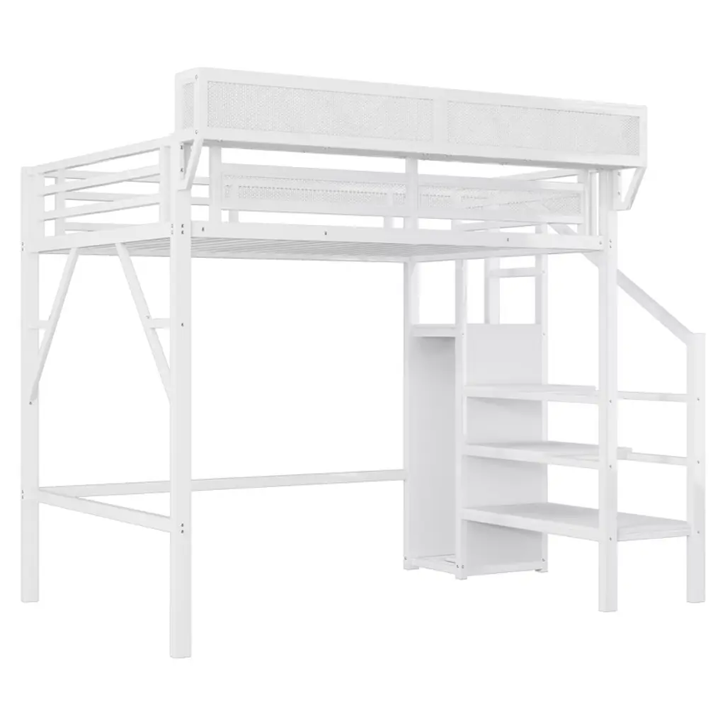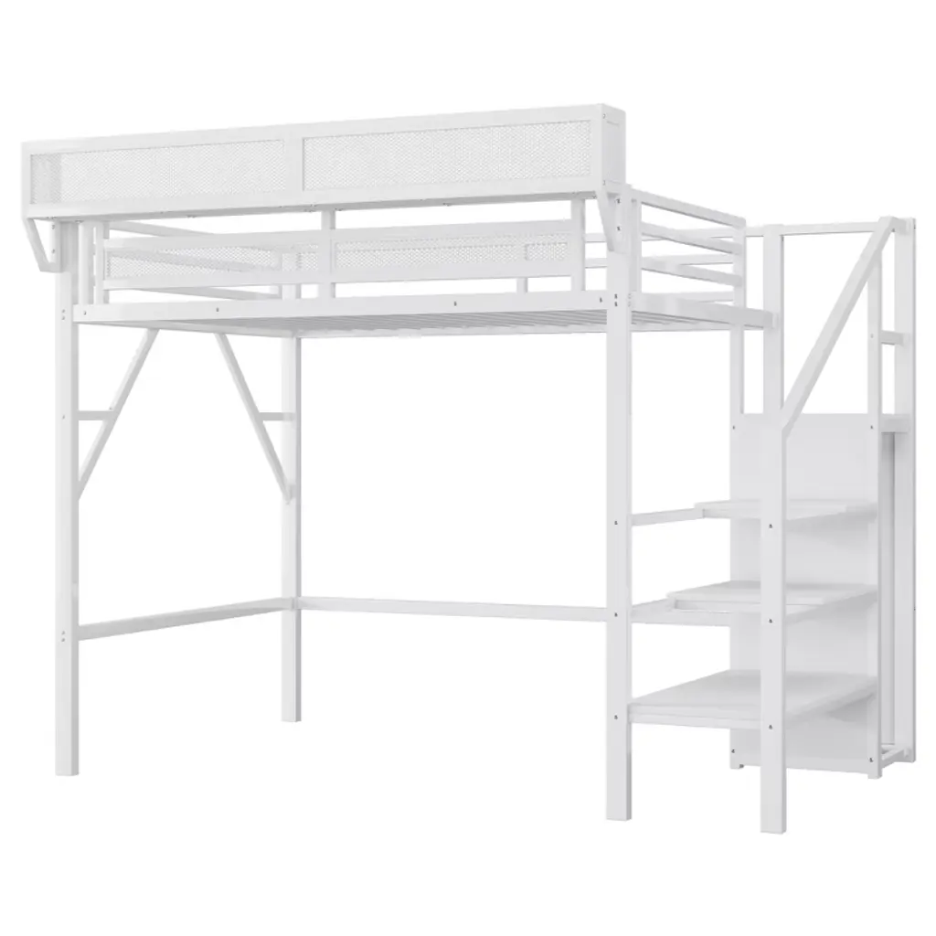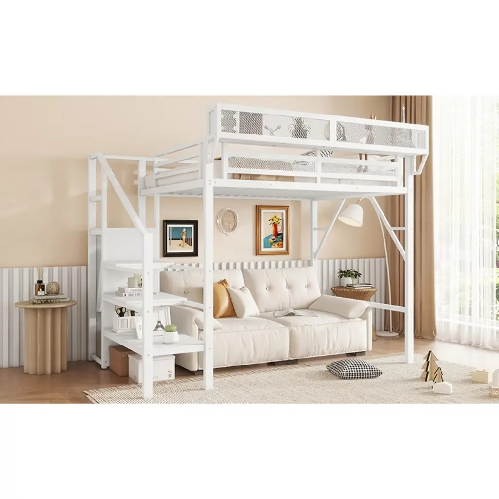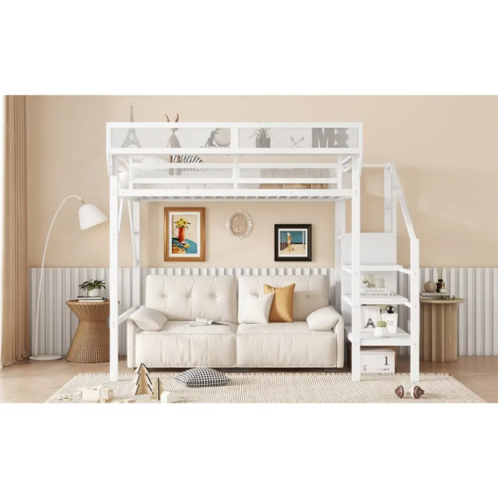 Product Features Twin Loft Bed with Storage Shelves for Upper: The twin metal loft bed is equipped with a storage shelf next to the upper bed, providing extra storage space. This shelf is ideal for keeping books, gadgets, or small items within easy reach. It has a mesh surround to prevent items from falling, adding functionality without compromising space.Metal Twin Loft Bed with Staircase: The metal twin size loft bed comes with a staircase that includes built-in storage compartments—convenient for storing items like shoes, toys, or blankets. The steps ensure safe and easy access to the upper bed, boosting both practicality and safety. The stairs can be installed on either the right or left side to fit your room layout.Under Space of Metal Loft Bed: The area under the twin loft bed offers 54.3 inches of height, creating extra space for multi-functional use. You can place storage cabinets, a small sofa, or a desk underneath—maximizing the use of limited space and creating a versatile living area.Metal Loft Bed with Wardrobe: The staircase integrates a built-in wardrobe function, providing additional storage for clothes and accessories. This clever design adds more functionality to the metal twin loft bed, making it a perfect solution for small bedrooms.Durable and Sturdy Construction: Crafted from high-quality metal, this twin size loft bed is durable and sturdy. The metal material ensures long-lasting use and stability, while also boasting a sleek, modern appearance that fits well in any bedroom. Weight capacity is specified in the product details below. Descriptions This twin size loft bed features built-in storage shelves next to the upper bed, plus a staircase and wardrobe. Its sturdy metal design ensures stability and durability, making your bedtime routine more organized and efficient. Specification Description & Dimensions Material: MetalOverall Dimensions: 94.3” x 47.8” x 73.4” (L x W x H)Size: Twin SizeHeight of Upper Guardrail: 11.3"Clearance Under the Bed: 54.3"Recommended Mattress Thickness: 6” (not included)Weight Capacity: 250LBSNet Weight: 125.4 lbsGross Weight: 136.84 lbsBox Spring Required: No