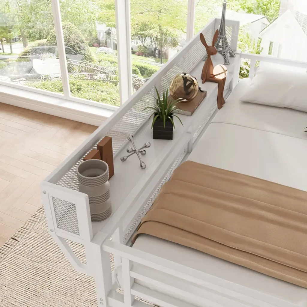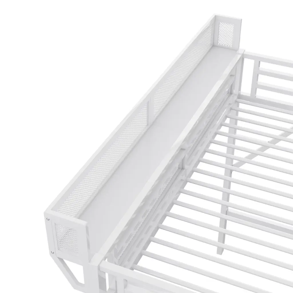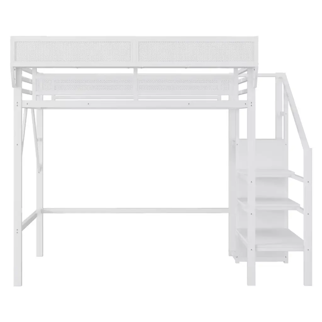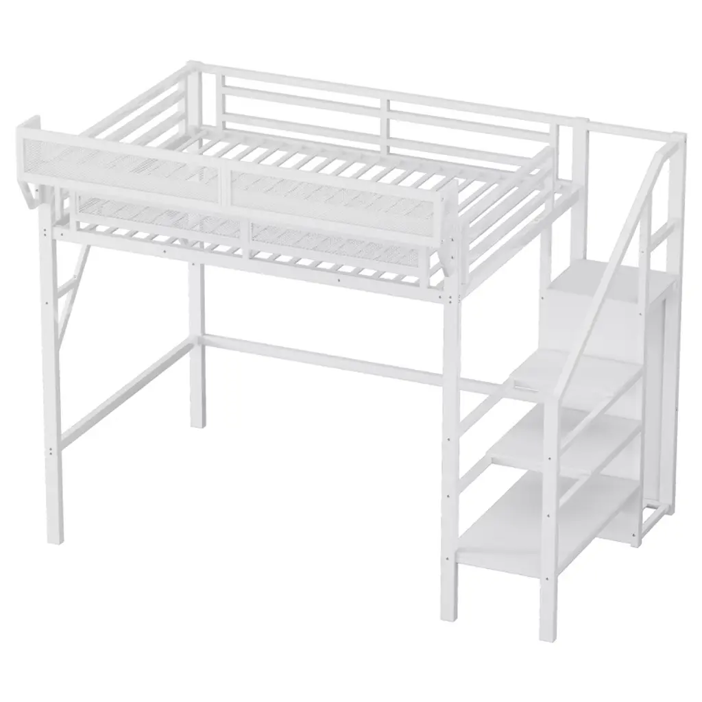 Product Features Twin Loft Bed with Storage Shelves for Upper: The twin metal loft bed is equipped with a storage shelf next to the upper bed, providing extra storage space. This shelf is ideal for keeping books, gadgets, or small items within easy reach. It has a mesh surround to prevent items from falling, adding functionality without compromising space.Metal Twin Loft Bed with Staircase: The metal twin size loft bed comes with a staircase that includes built-in storage compartments—convenient for storing items like shoes, toys, or blankets. The steps ensure safe and easy access to the upper bed, boosting both practicality and safety. The stairs can be installed on either the right or left side to fit your room layout.Under Space of Metal Loft Bed: The area under the twin loft bed offers 54.3 inches of height, creating extra space for multi-functional use. You can place storage cabinets, a small sofa, or a desk underneath—maximizing the use of limited space and creating a versatile living area.Metal Loft Bed with Wardrobe: The staircase integrates a built-in wardrobe function, providing additional storage for clothes and accessories. This clever design adds more functionality to the metal twin loft bed, making it a perfect solution for small bedrooms.Durable and Sturdy Construction: Crafted from high-quality metal, this twin size loft bed is durable and sturdy. The metal material ensures long-lasting use and stability, while also boasting a sleek, modern appearance that fits well in any bedroom. Weight capacity is specified in the product details below. Descriptions This twin size loft bed features built-in storage shelves next to the upper bed, plus a staircase and wardrobe. Its sturdy metal design ensures stability and durability, making your bedtime routine more organized and efficient. Specification Description & Dimensions Material: MetalOverall Dimensions: 94.3” x 47.8” x 73.4” (L x W x H)Size: Twin SizeHeight of Upper Guardrail: 11.3"Clearance Under the Bed: 54.3"Recommended Mattress Thickness: 6” (not included)Weight Capacity: 250LBSNet Weight: 125.4 lbsGross Weight: 136.84 lbsBox Spring Required: No