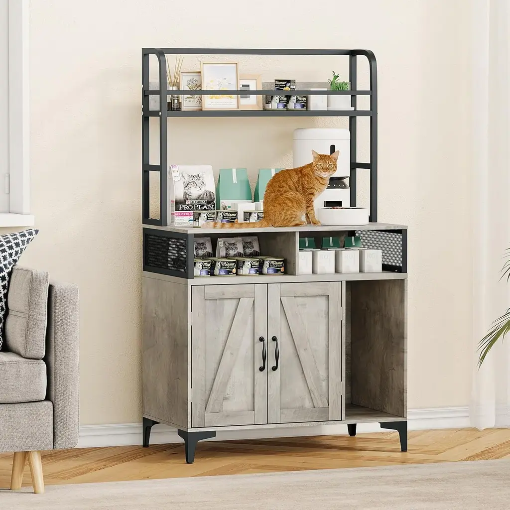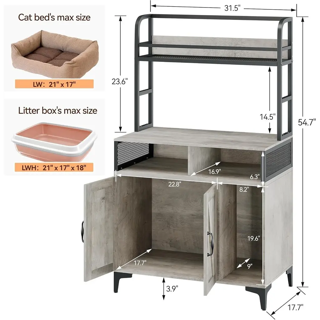 Expand Your Storage Space: Comes with storage rack to store magazines, cat foods, toys, scoops, or other pet supplies. Besides, Each shelf has baffle to stop things falling down. The under of the cabinet has two storage shelves that provide a good place for some storage of cat supplies, knick-knacks, or other small items.Multifunctional Cat Furniture: This cat house with storage is not only a hidden litter box but also can serve as a bookshelf and storage cabinet for your living room, bedroom, bathroom, etc. Say goodbye to smell and mess, to keep your house neat and cozy.Right to Privacy: Cats are inherently hyper-vigilant. With litter box on the inside, the cat litter box enclosure provides your cats their own safe spot where they can have their privacy for potty time and feel safe in the process.Sturdy and Durable- Made with a sturdy MDF panel and high-quality iron, this cat furniture is more sturdy and stable. The surface of the panel is dirt-resistant, waterproof and easy to clean.Product information:31.5"L x 17.7"W x 54.7"H(inclued leg 3.9"). Inner size: 22.8" L x 17.7" W x 19.6" H. Entrance size: 9"W x 19.6H".Suitable for cats around 12 lbs. The hidden litter box furniture will come with detailed instructions and provided tools to assemble it easily.