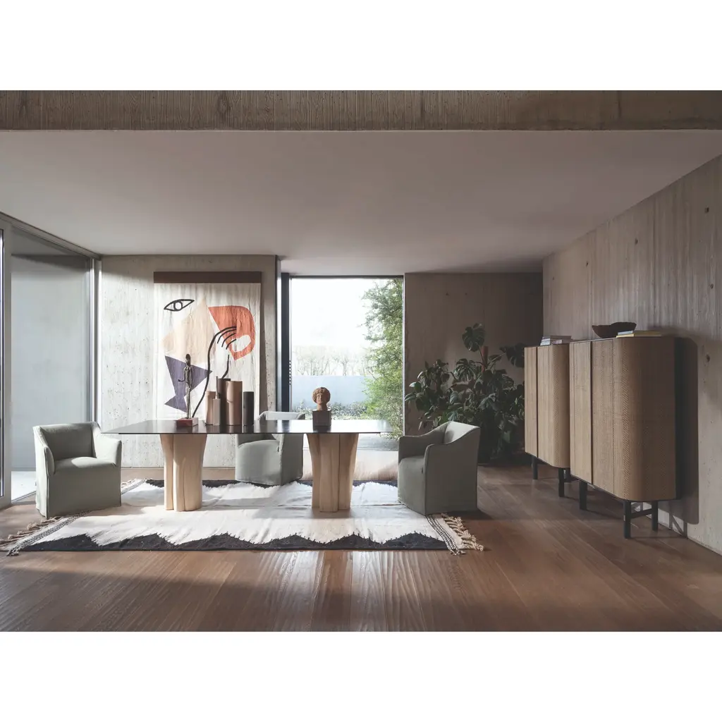 Introducing the Daen Two Door Wooden Highboard by Gervasoni, a sophisticated and exclusive piece. Made with a plywood and lacquered body, this highboard exudes elegance, enhanced by two water-repellent, cleanable eco-leather doors. Inside, two adjustable shelves provide customizable storage. The top is available in your choice of 6mm porcelain stoneware or painted glass. The design is completed with elliptical-section legs made of lacquered solid wood combined with steel bars for added stability and style.
