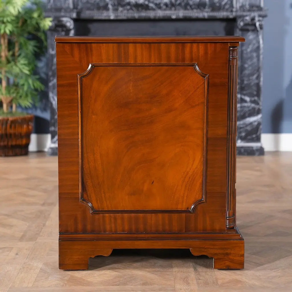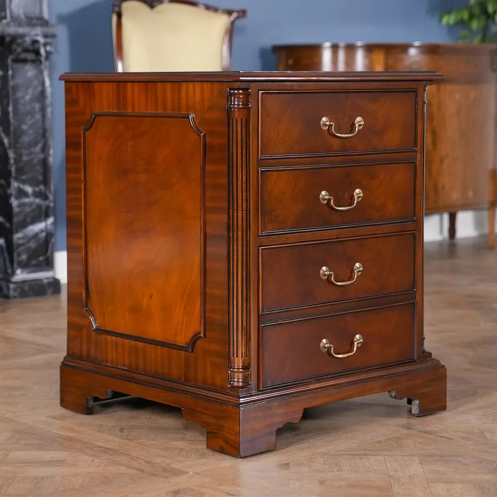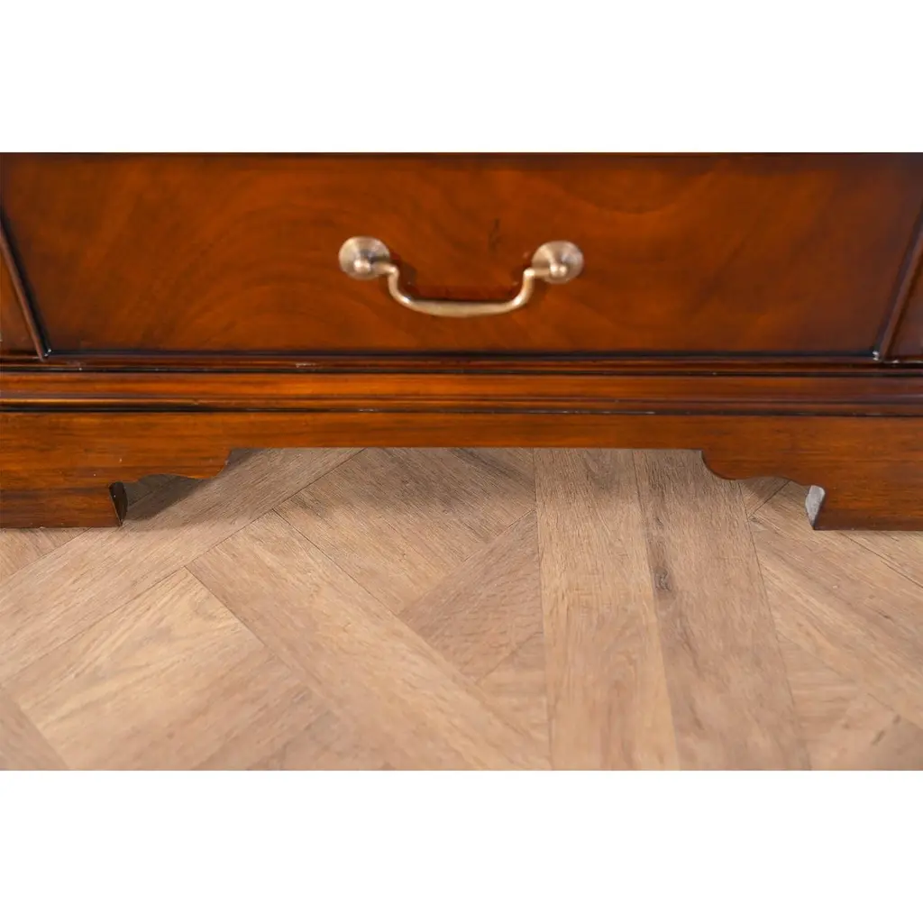 A high quality piece of office furniture from Niagara Furniture our Two Drawer File Cabinet is made with figured mahogany. The top of the cabinet is covered in a full grain brown leather panel which is attractively tooled around the edge with gold tooling. The edge of the top is cross banded and to the front are four drawer fronts, each having applied moldings and displaying lovely matched veneers. Each drawer has solid brass handles and the four drawer fronts open as two large hanging file drawers. The side of the Two Drawer File Cabinet is also decorated using high quality figured mahogany as well as solid mahogany moldings. This cabinet matches many other items in our Niagara furniture office collection.Measures 25″w x 24″d x 31″h metric 64 61 79