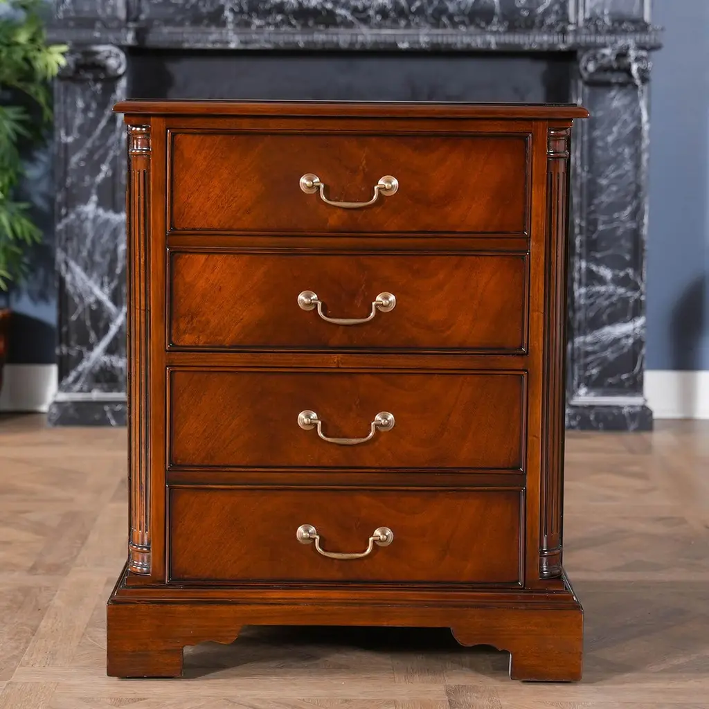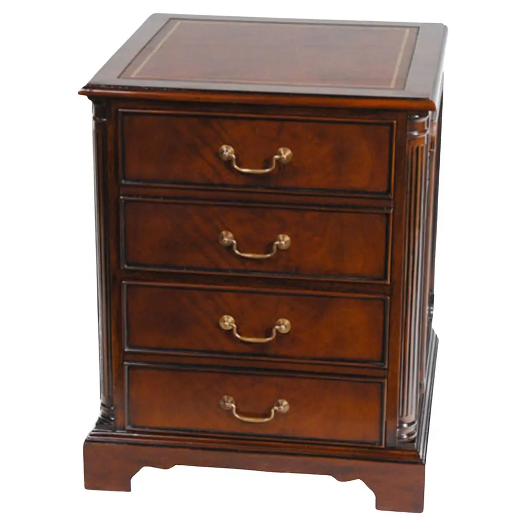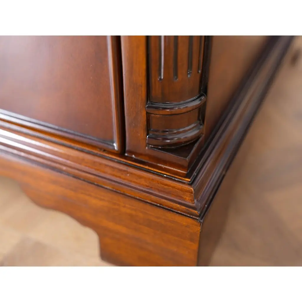 A high quality piece of office furniture from Niagara Furniture our Two Drawer File Cabinet is made with figured mahogany. The top of the cabinet is covered in a full grain brown leather panel which is attractively tooled around the edge with gold tooling. The edge of the top is cross banded and to the front are four drawer fronts, each having applied moldings and displaying lovely matched veneers. Each drawer has solid brass handles and the four drawer fronts open as two large hanging file drawers. The side of the Two Drawer File Cabinet is also decorated using high quality figured mahogany as well as solid mahogany moldings. This cabinet matches many other items in our Niagara furniture office collection.Measures 25″w x 24″d x 31″h metric 64 61 79