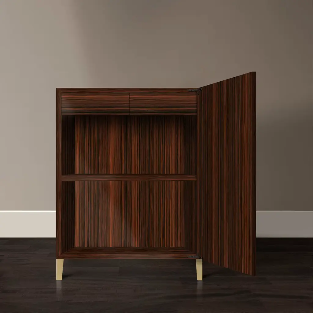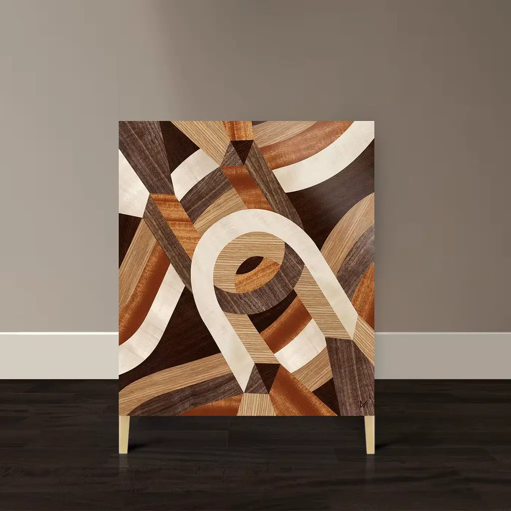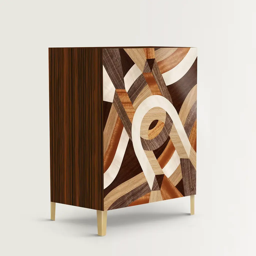 Restrained streamlined profiles are meant to counterbalance the astonishing marquetry in this superb low cabinet. Raised on brushed brass feet, the rosewood frame gets sealed by a door whose minute inlays capture the eye with their intricate lines and neat chromatic contrasts. An authentic objet d'art, this cabinet brims with timeless charm.