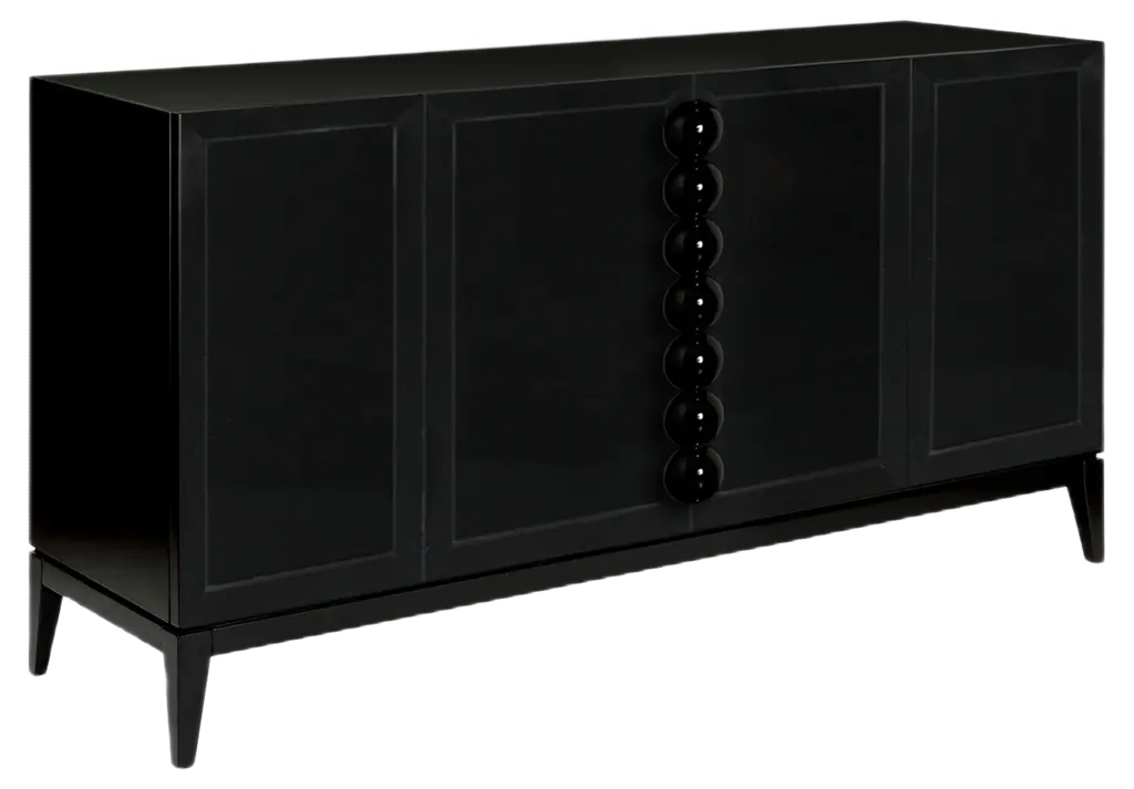 Mid-century style meets contemporary taste in this elegant credenza characterized by a sleek silhouette with a distinctive, clean design that will fit in any interior. Whether in a dining room or living room, this credenza will provide a stylish storage solution for table setting accessories, board games or electronics, and can also double as bar cabinet when needed. Accented with details in bronzed metal with satin finish on the conical feet and front panels, this versatile piece will stand out for its firm formal identity and impeccable proportions.