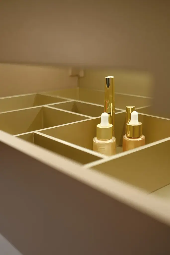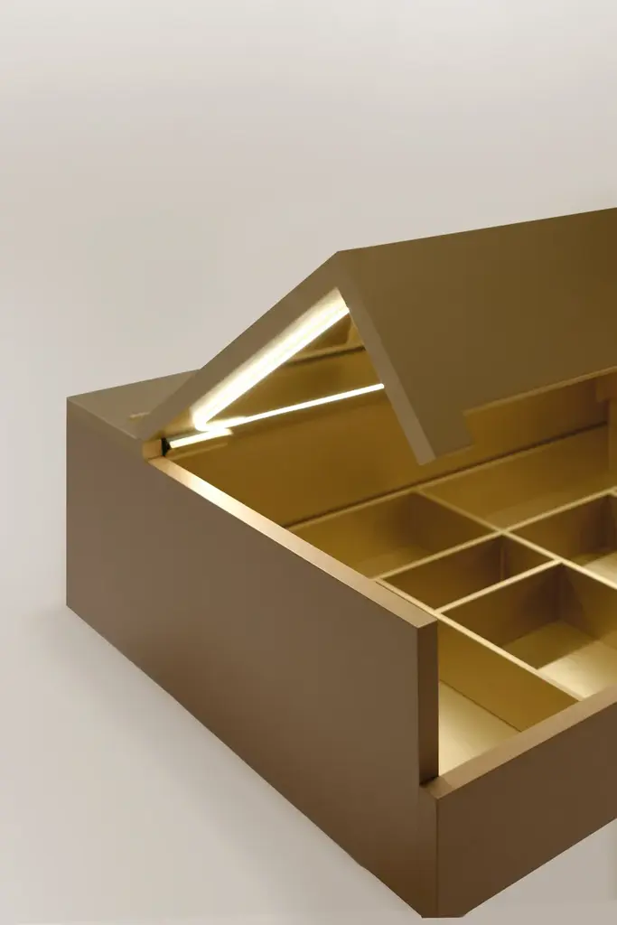 Vanity 2 is a suspended bathroom cabinet with lid.Internal mirror with dimmable 4000K LED lighting, magnifying magnetic mirror code SI14.Vanity is a small versatile product that can be placed in a bathroom or sleeping area, in a walk-in wardrobe or even in an entrance hall. Depending on use and comfort, Vanity can be installed at different heights for standing or seated use with a Mobilcrab ottoman. The cabinet can be customised in colour and finish to best match the style of your environment. It is available in two variants, one colour and two colours, for an accurate and refined chromatic choice. Vanity is a surprise of details. Inside, a large mirror with LED lighting along its perimeter enhances the beauty of one's face, we find a magnetic magnifying mirror as a detail to achieve care and perfection, and an internal divider to better organise one's personal accessories. The closure of the top is soft-close, secure and silent. On the front of the drawer, the groove has a dual function. It is a place to insert your hand, allowing it to be opened, and the outflow of light creates an atmosphere in the room.Mobilcrab with the new Vanity collection tells a story of high quality craftsmanship design with the aim of enhancing your personality.